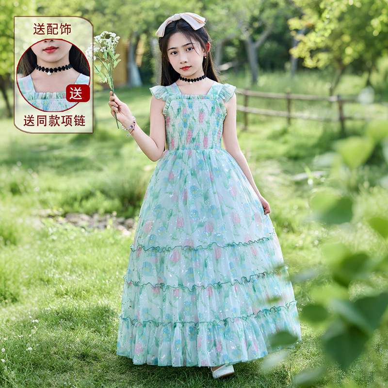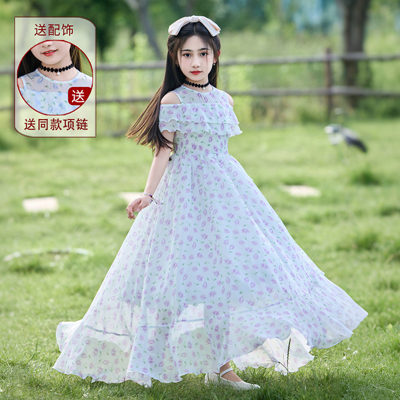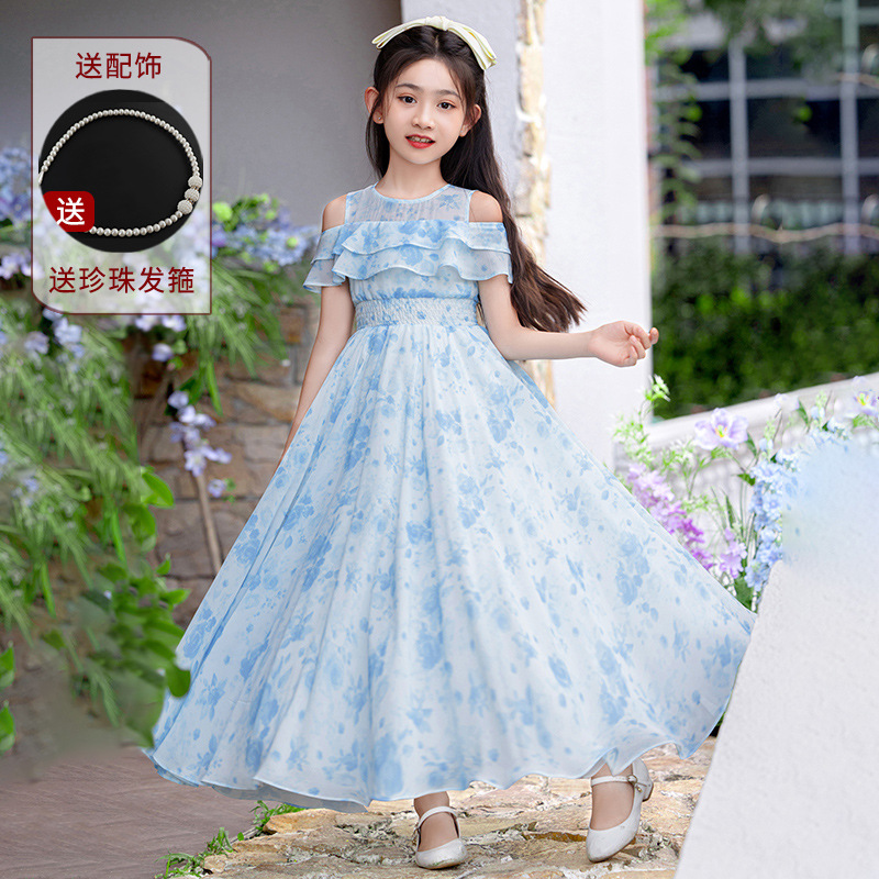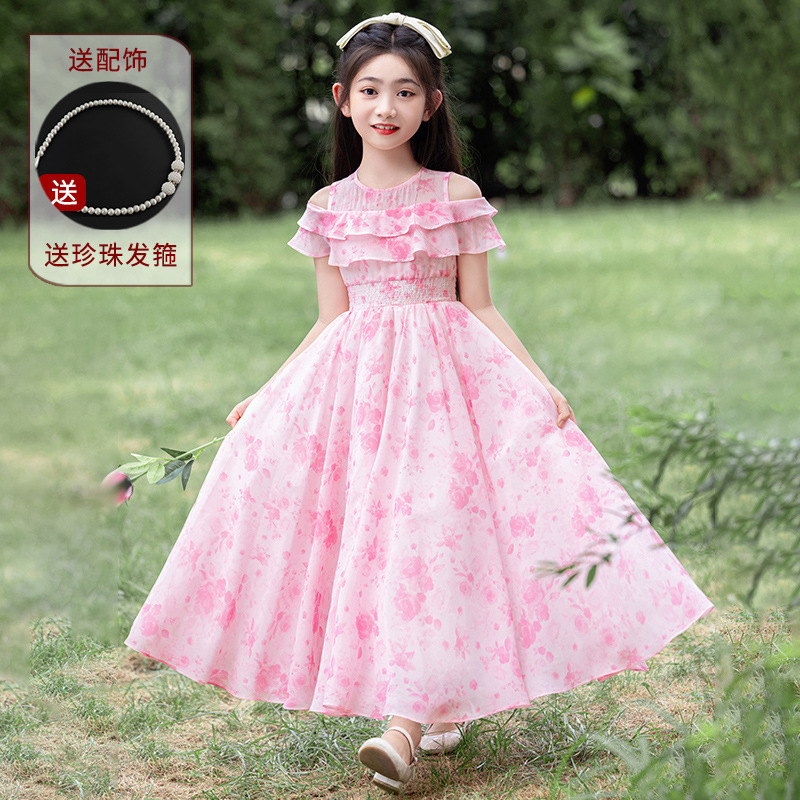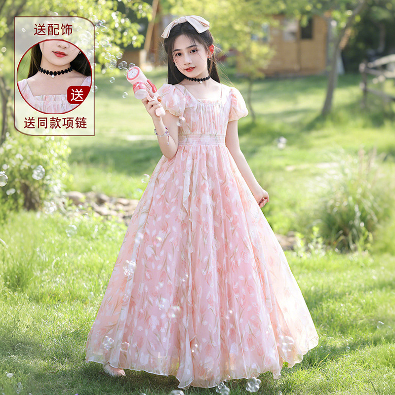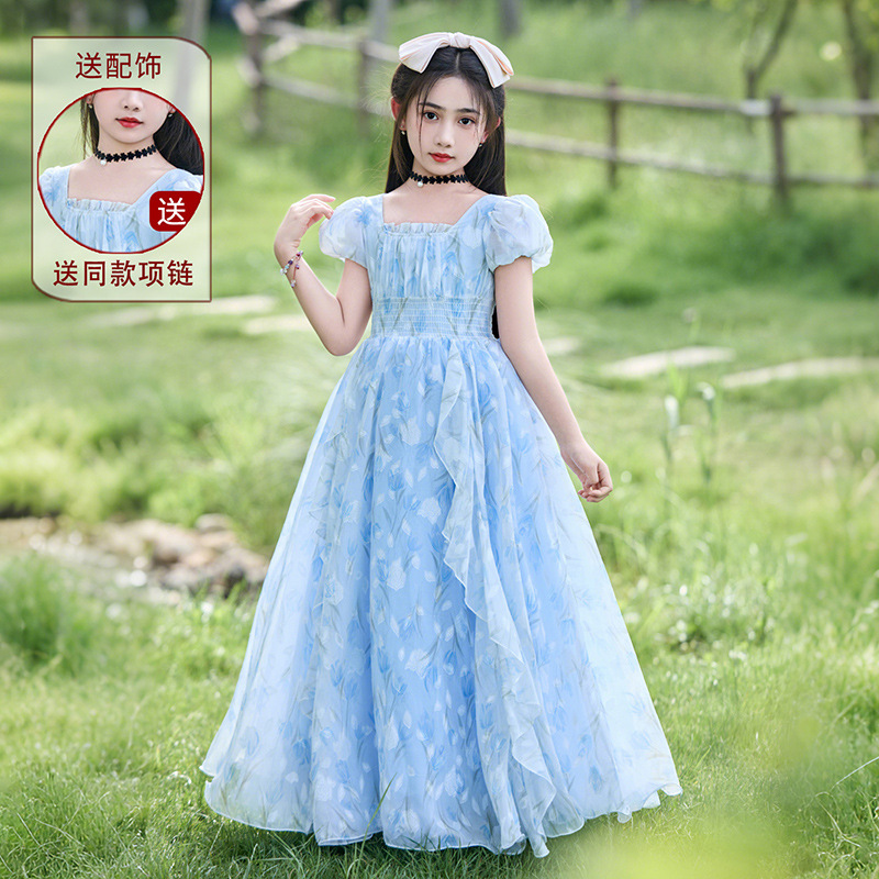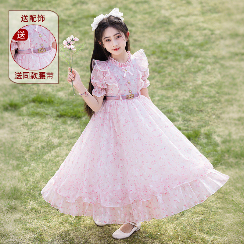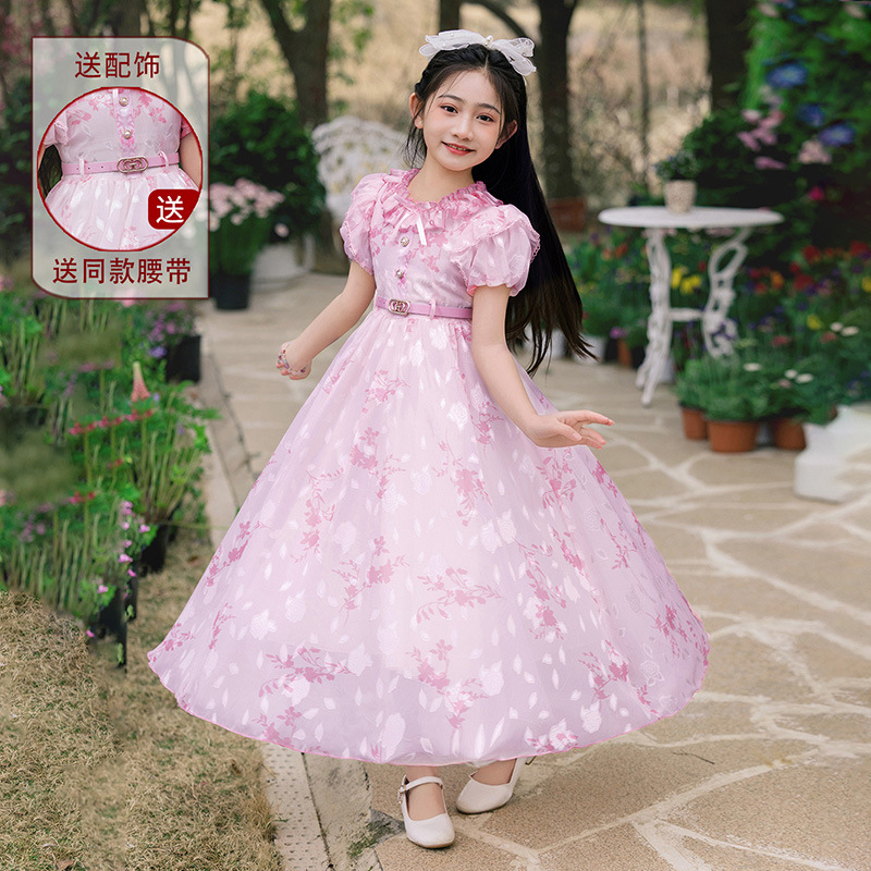 소녀 원피스 큰 어린이 쉬폰 원피스 2025 새로운 한국식 서양식 짧은 소매 공주 원피스 어린이 공연 원피스스토어 가기