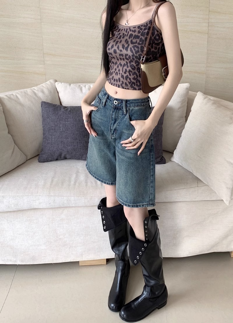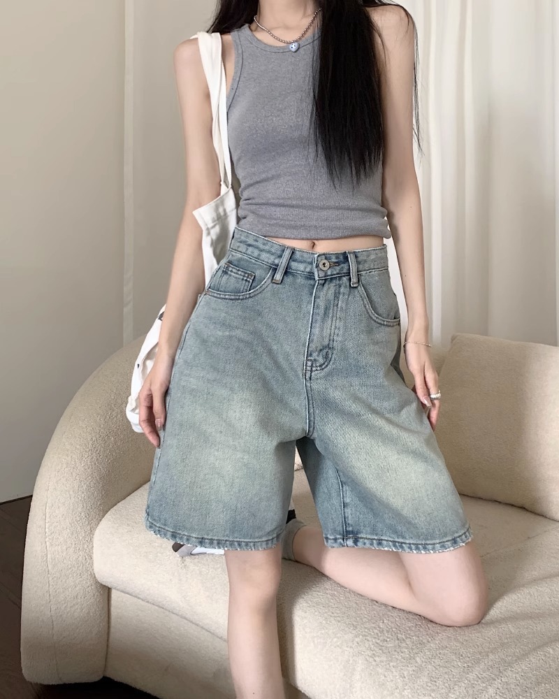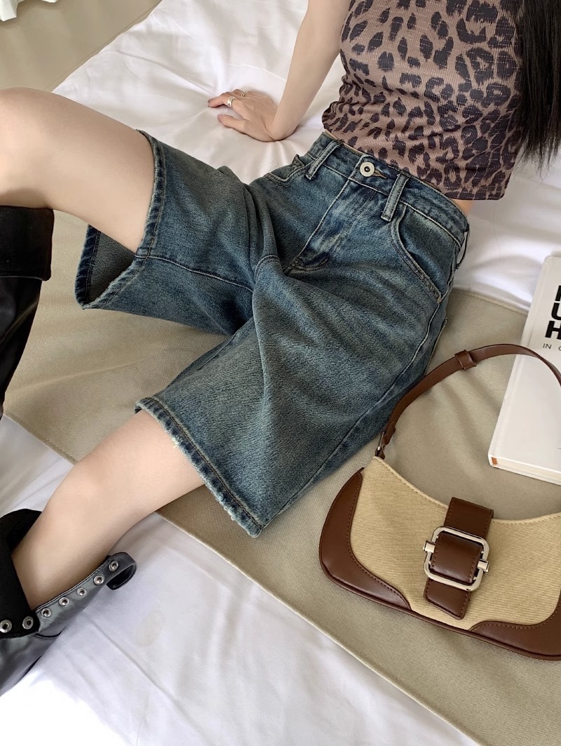 [10000 명] 레트로 씻은 스트레이트 데님 반바지 여성의 높은 허리 슬림 느슨한 오래 된 바지 여름