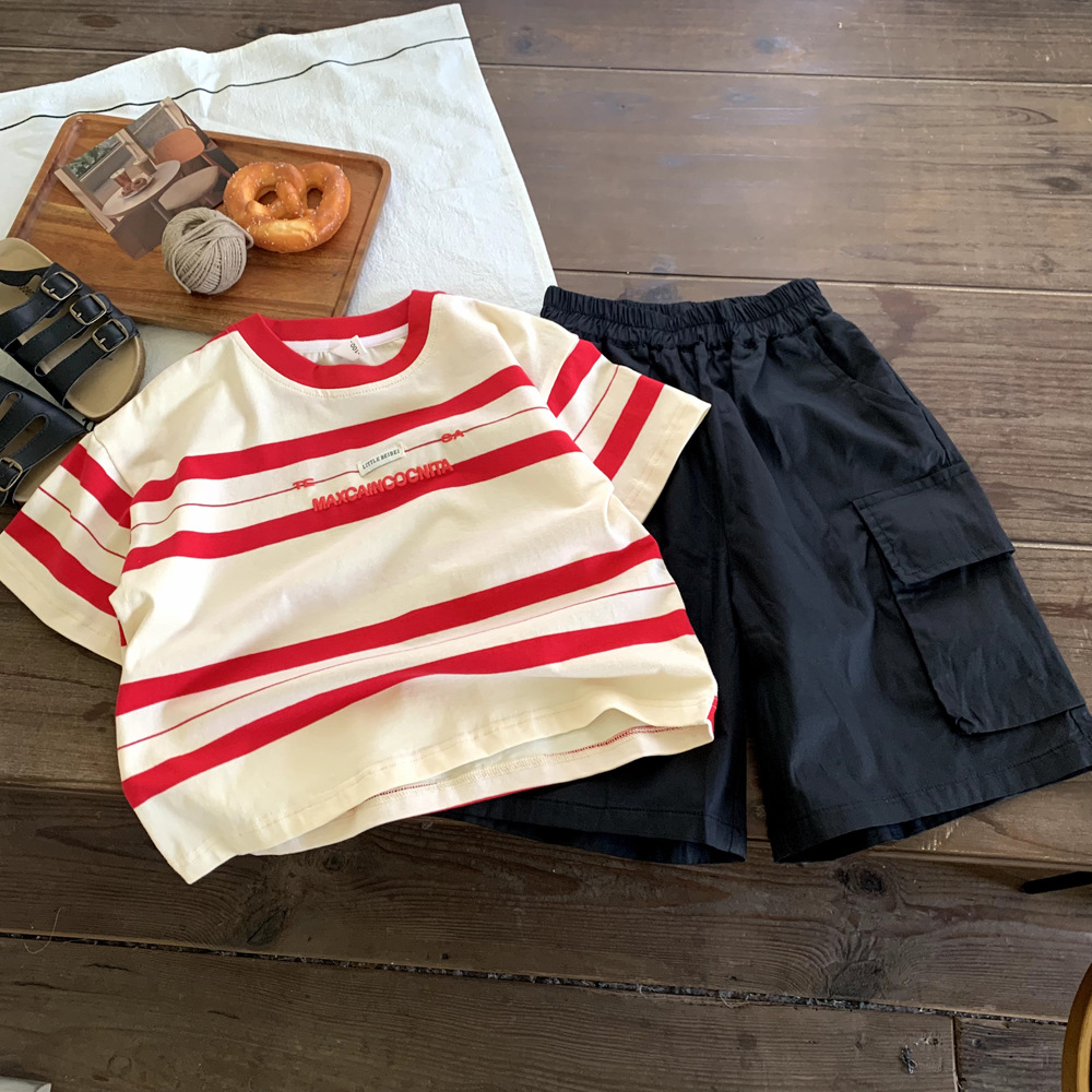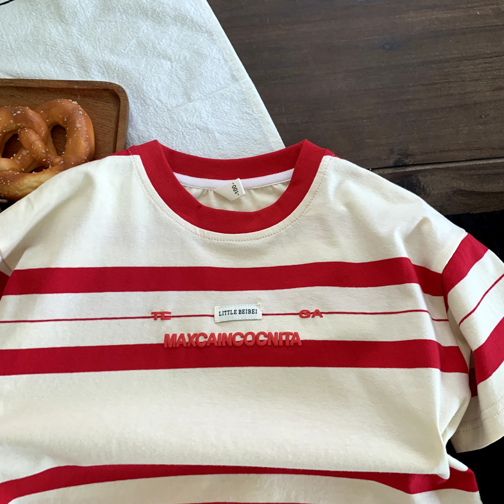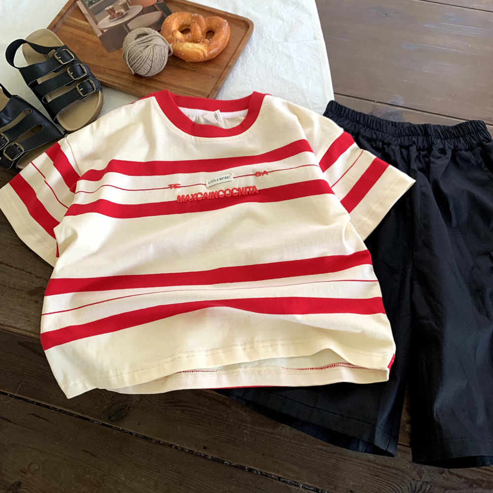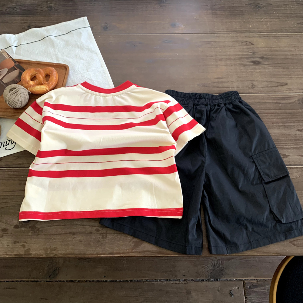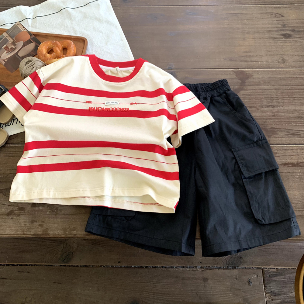 소년 반팔 티셔츠 투피스 2025 여름 새로운 어린이 줄무늬 패션 탑 올 매치 풀오버 세트 T스토어 가기