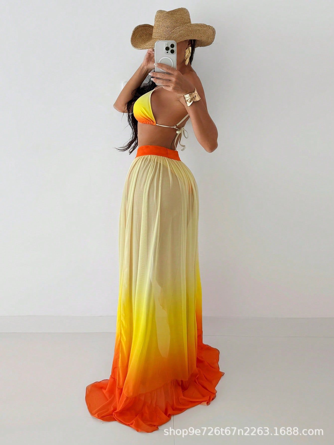2025 새로운 중동 스타일 3점 섹시한 그라데이션 선셋 레드 비키니 레이스 업 수영복 러플