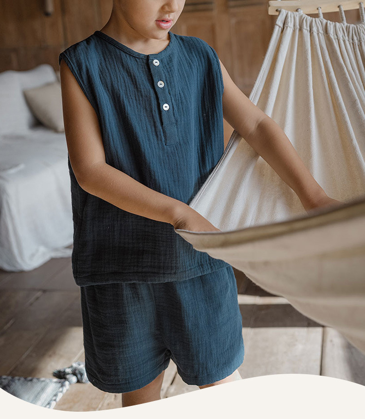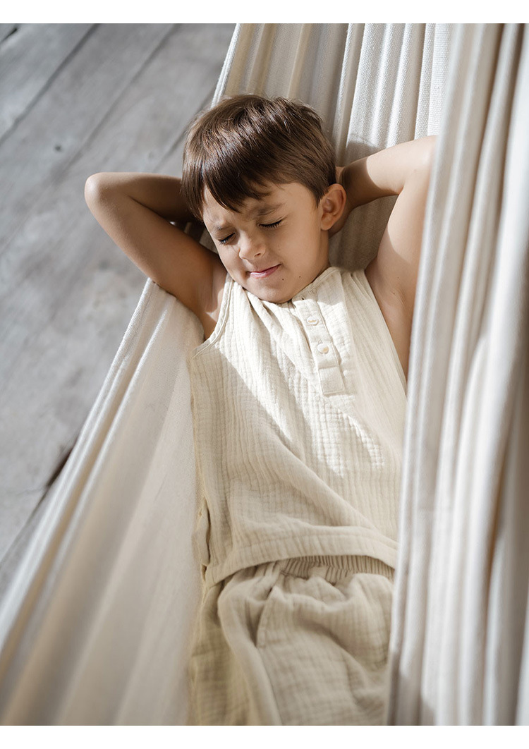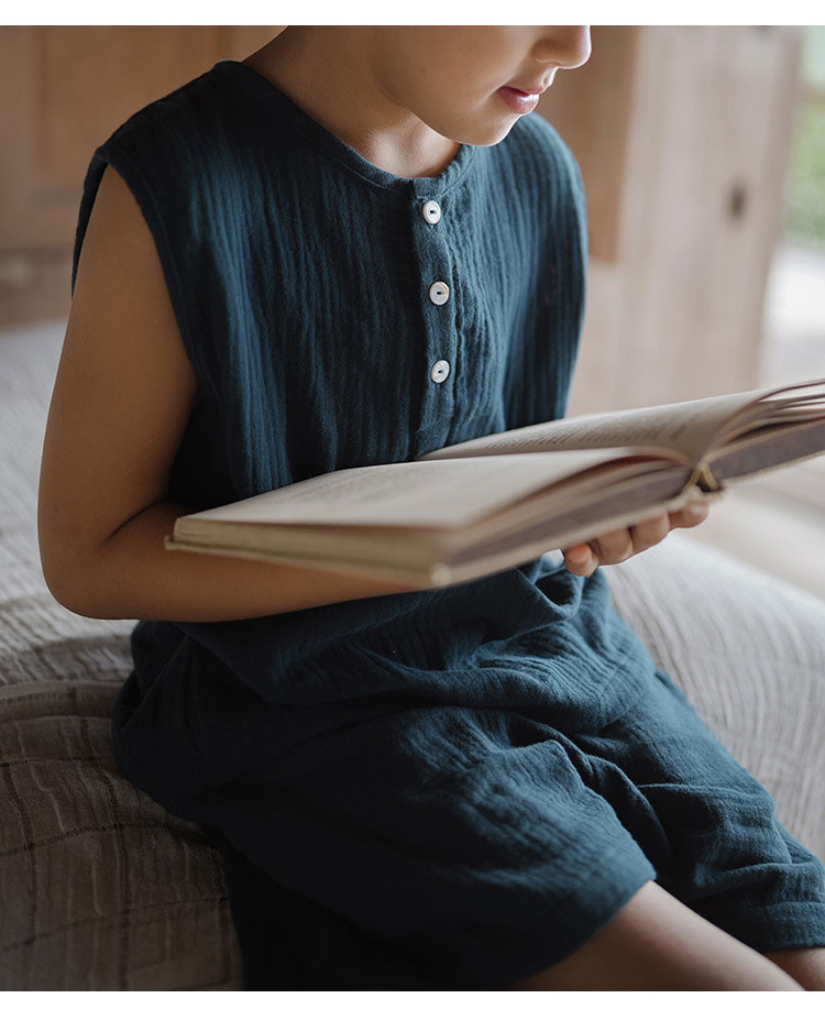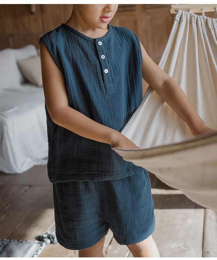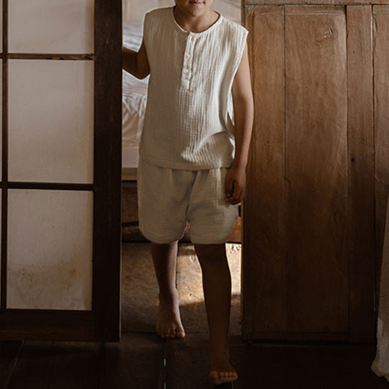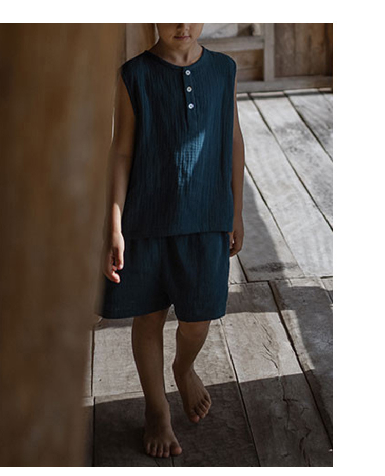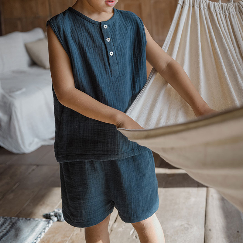 민소매 조끼 통기성 코튼 원사 세트 아기 소년과 소녀를위한 여름 편안한 라운드 넥 탑 느슨한 허리 캐주얼 반바지