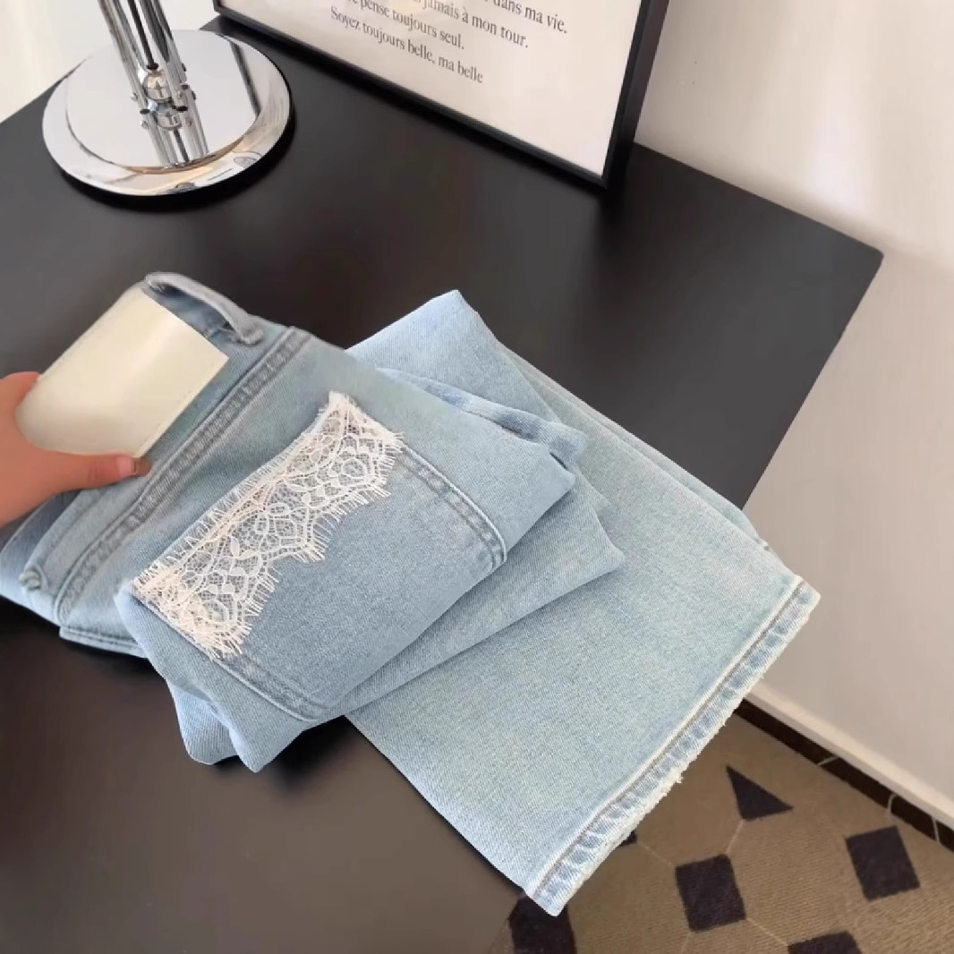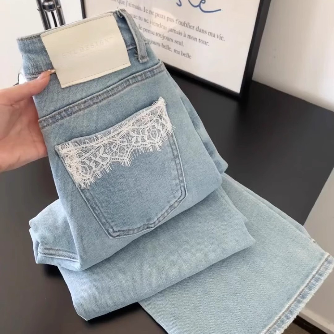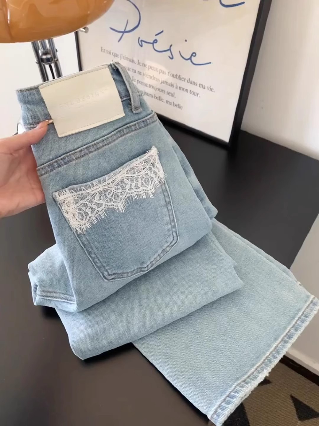 버전이 좋습니다! 레이스 스티칭 포켓 스트레이트 청바지 여성용 봄 높은 허리 슬리밍 캐주얼 올 매치 와이드 레그 팬츠