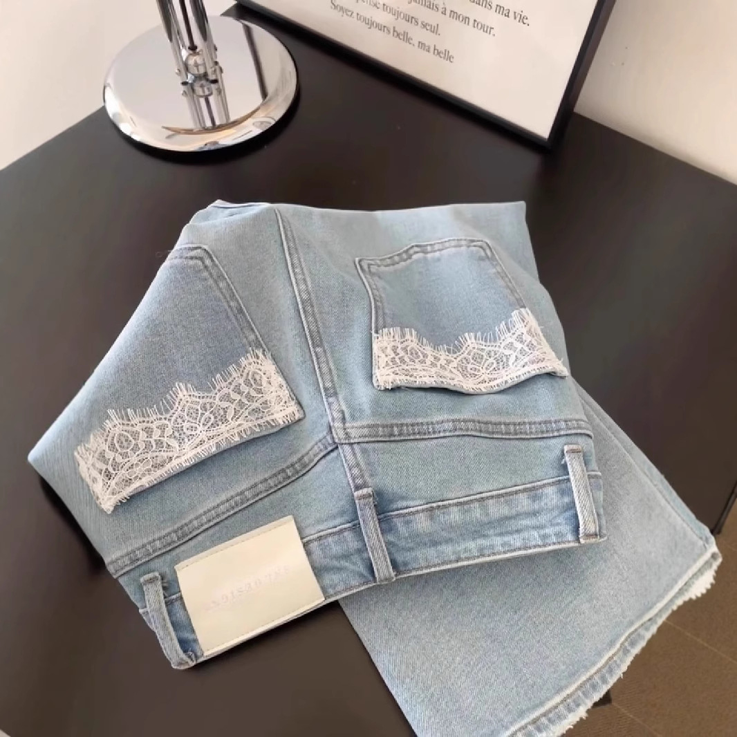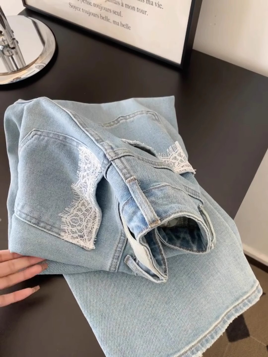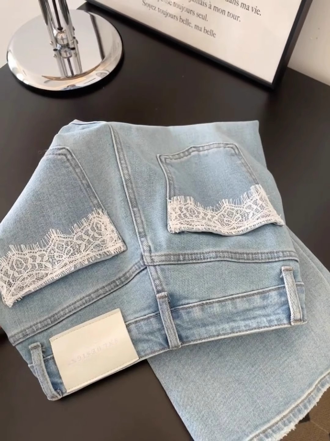 버전이 좋습니다! 레이스 스티칭 포켓 스트레이트 청바지 여성용 봄 높은 허리 슬리밍 캐주얼 올 매치 와이드 레그 팬츠