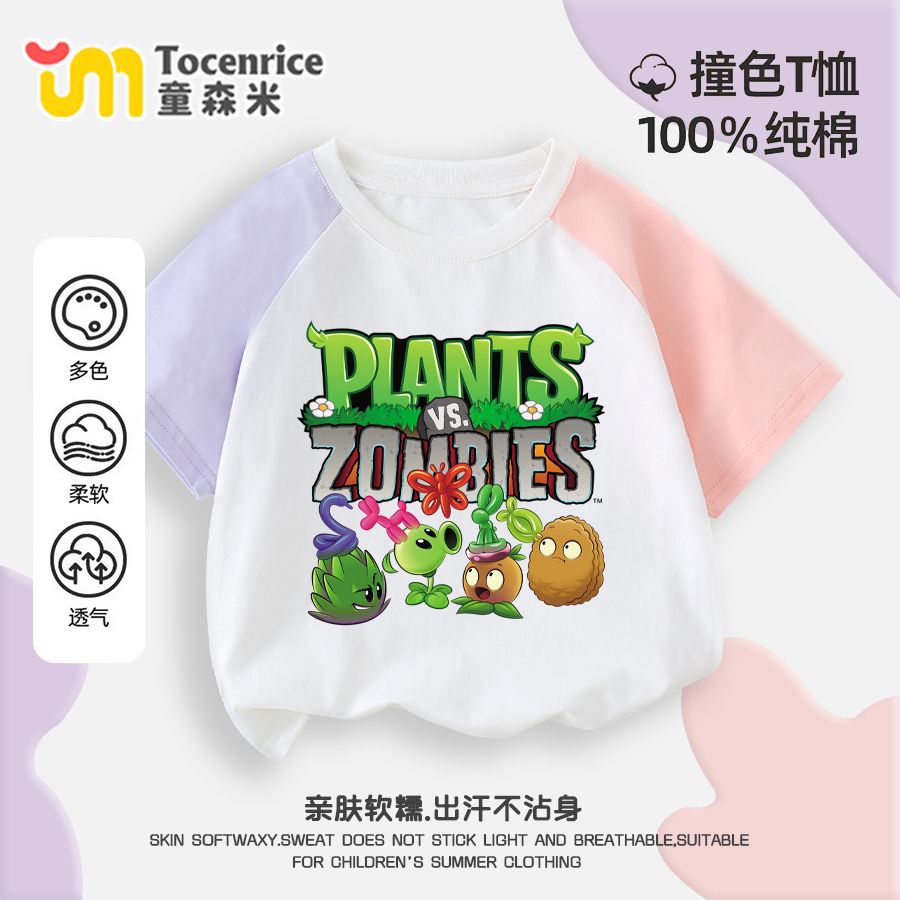 식물 대 좀비 어린이 여름 반팔 티셔츠 2025 새로운 완두콩 기계 대조 라글란 슬리브 탑 반소매 8