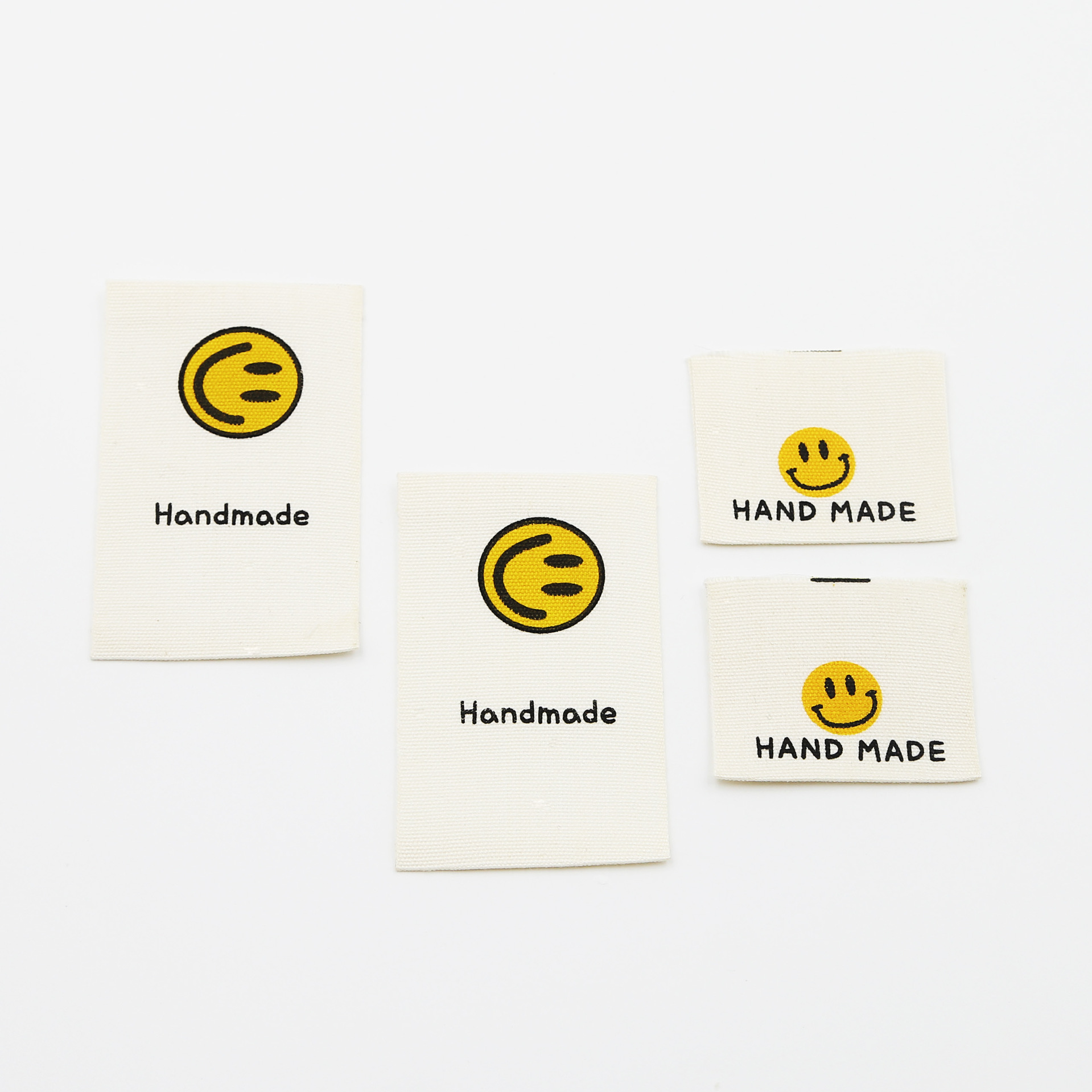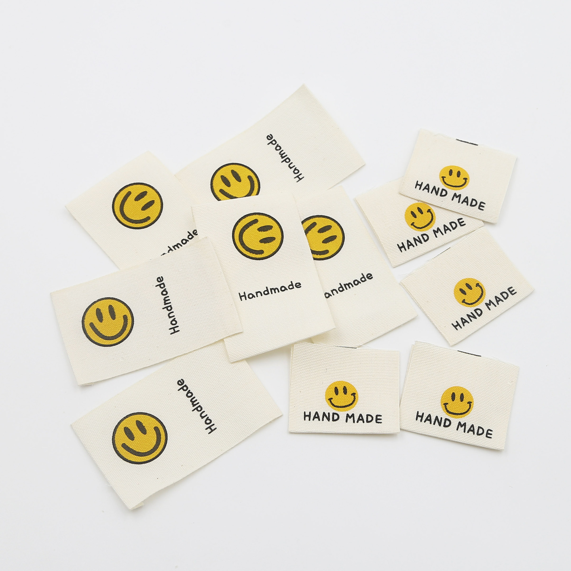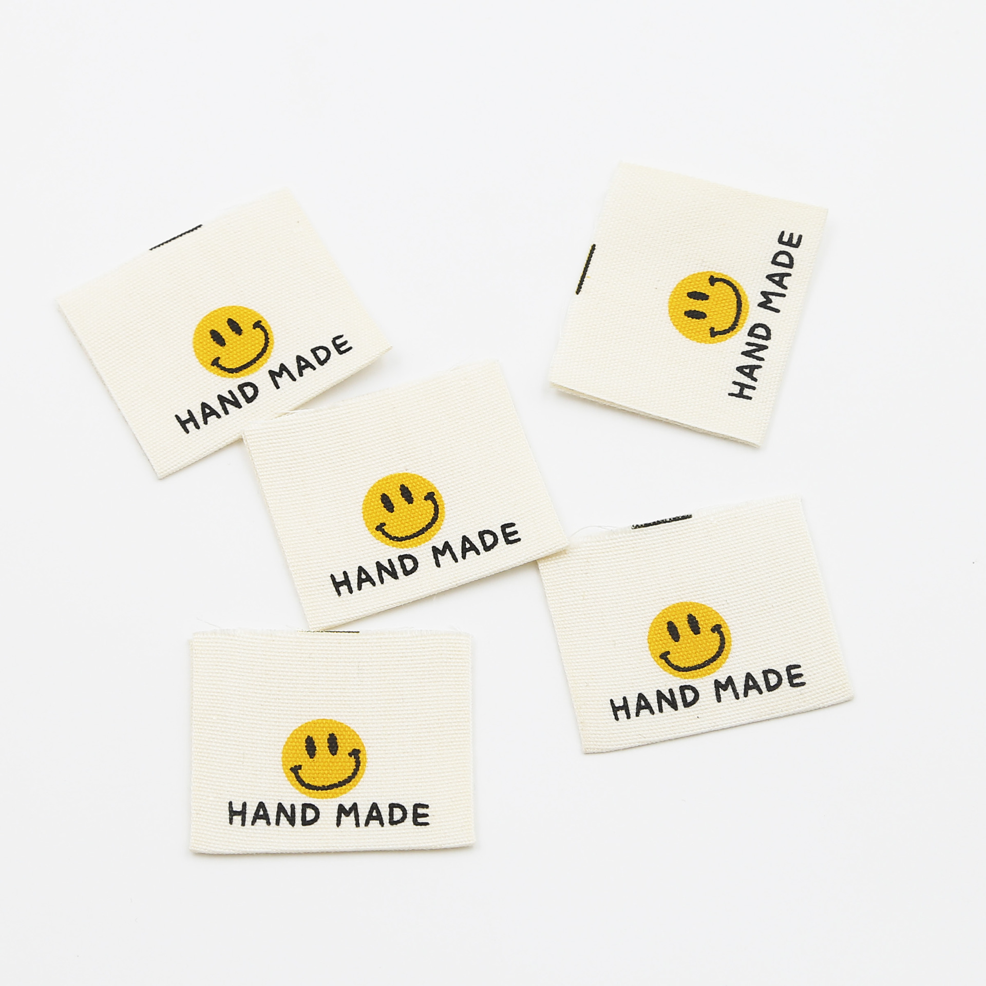 천 라벨, 손으로 인쇄된 라벨, 접힌 가장자리, 웃는 얼굴 디자인, 순면, 기성복 라벨, 칼라 라벨, 재료, 액세서리 및 액세서리스토어 가기