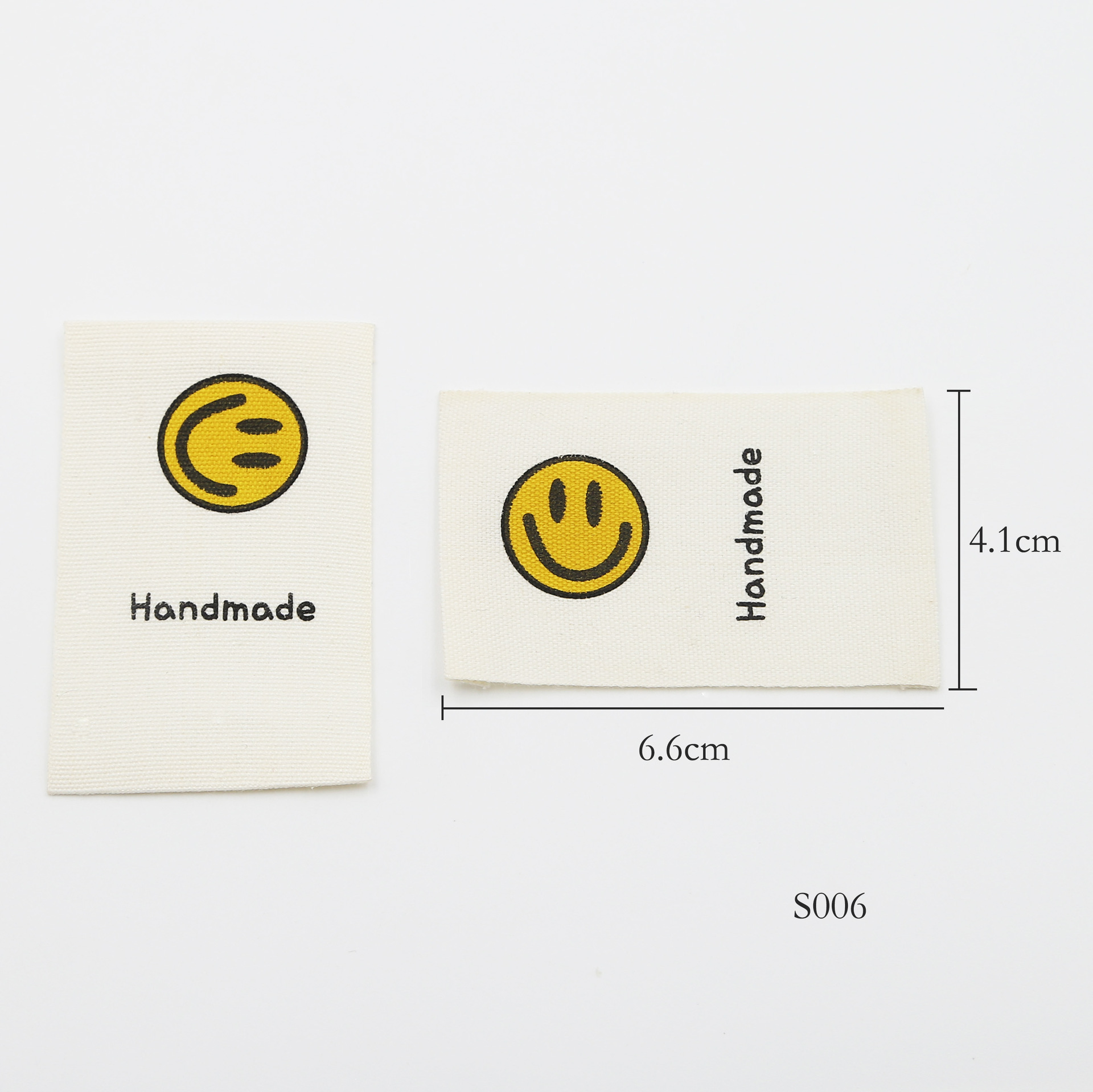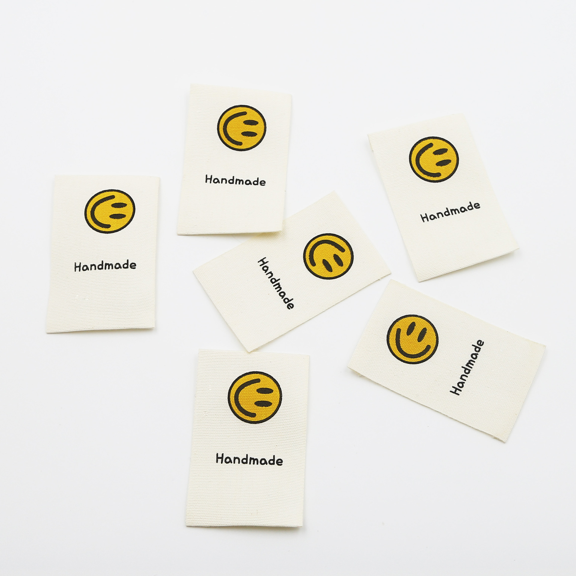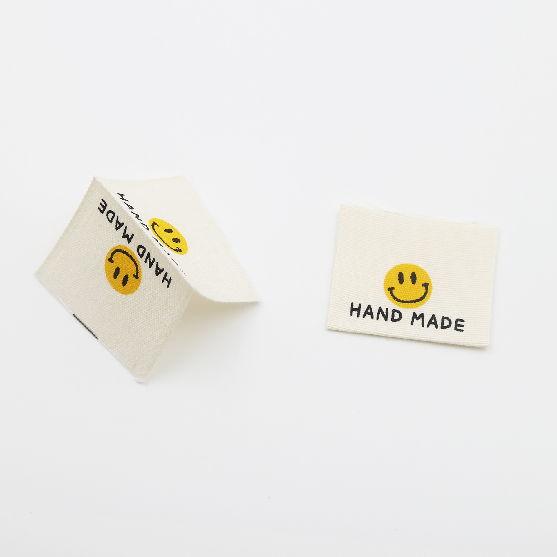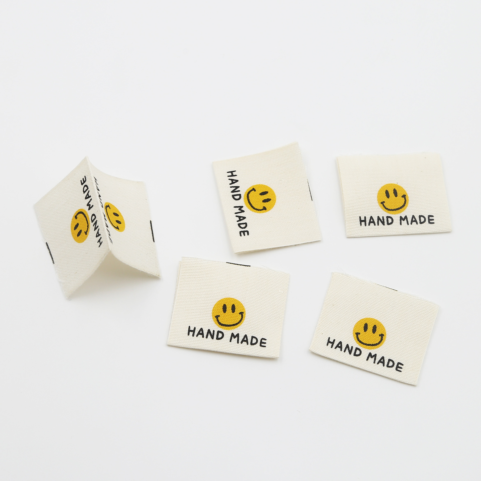 천 라벨, 손으로 인쇄된 라벨, 접힌 가장자리, 웃는 얼굴 디자인, 순면, 기성복 라벨, 칼라 라벨, 재료, 액세서리 및 액세서리