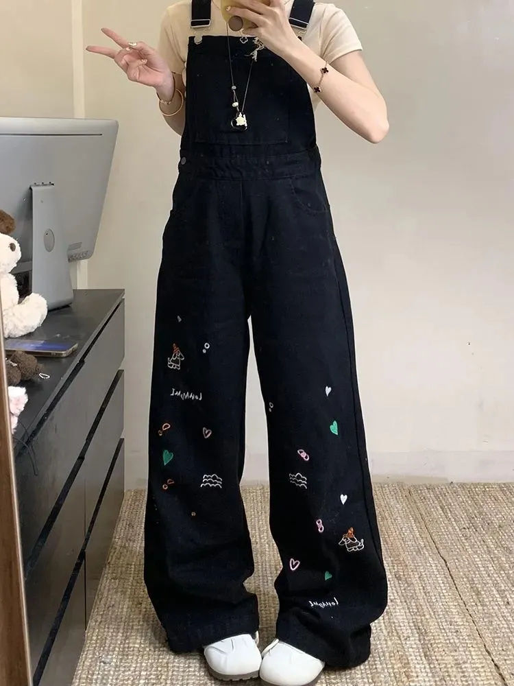 블랙 헤비 자수 2025 년 봄과 여름 새로운 도착 스트랩 바지 여성 아메리칸 스타일 레트로 디자인 센스 스트레이트 튜브 바지