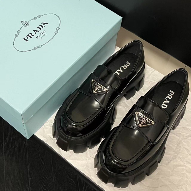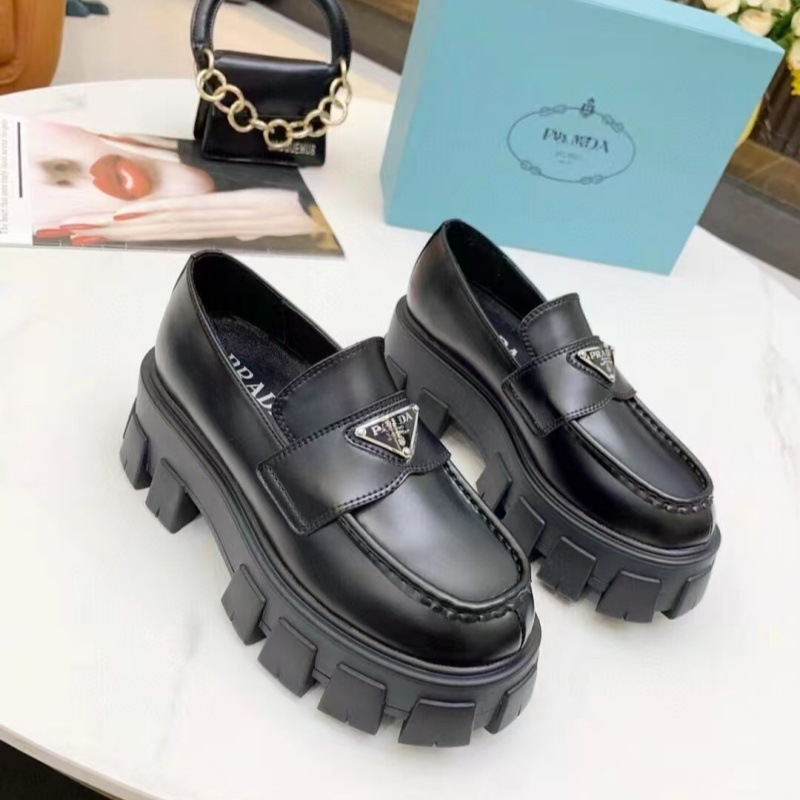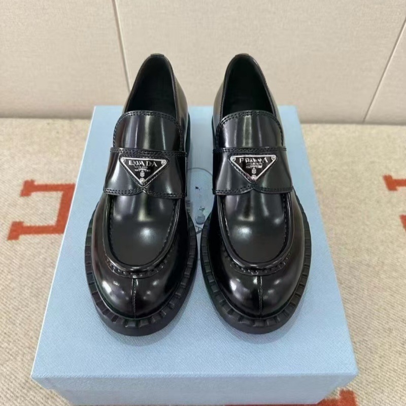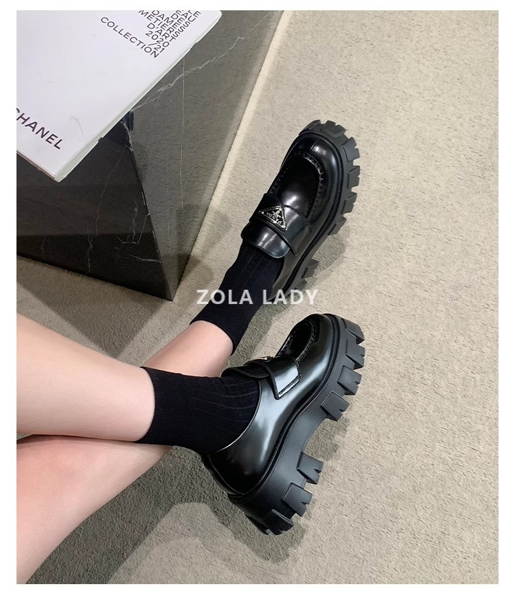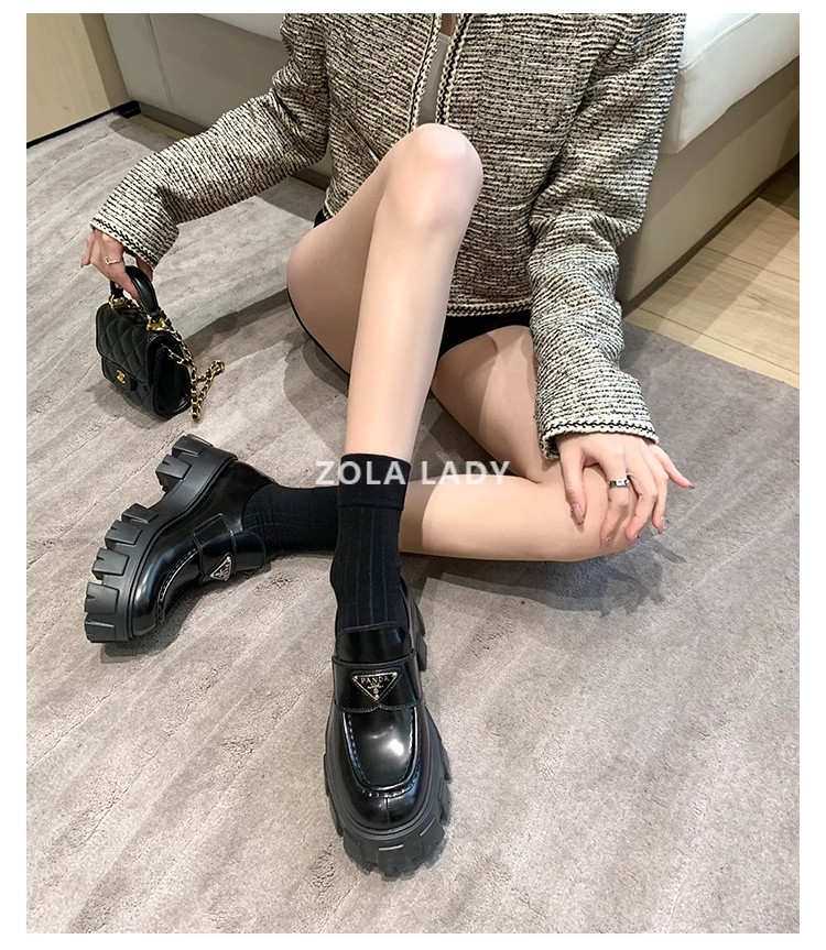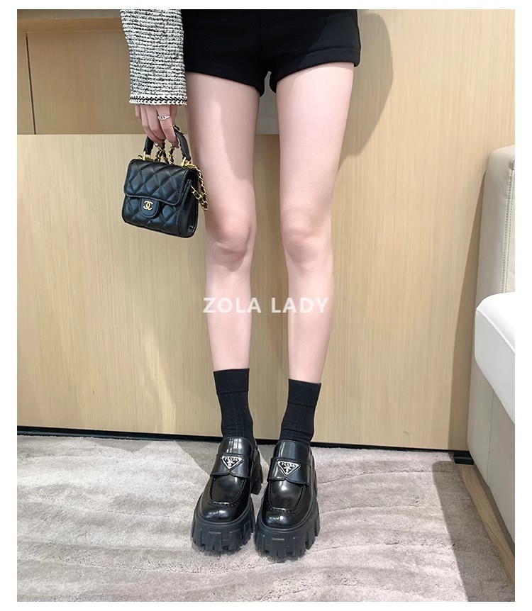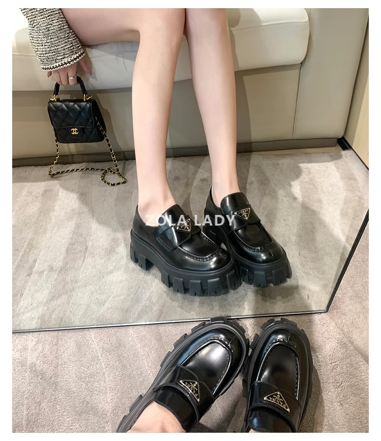 [업그레이드 버전] P 패밀리 트라이앵글 표준 Cowhide 라운드 헤드 두꺼운 힐 두꺼운 바닥 로퍼 여성 블랙 작은 가죽 신발 싱글 신발