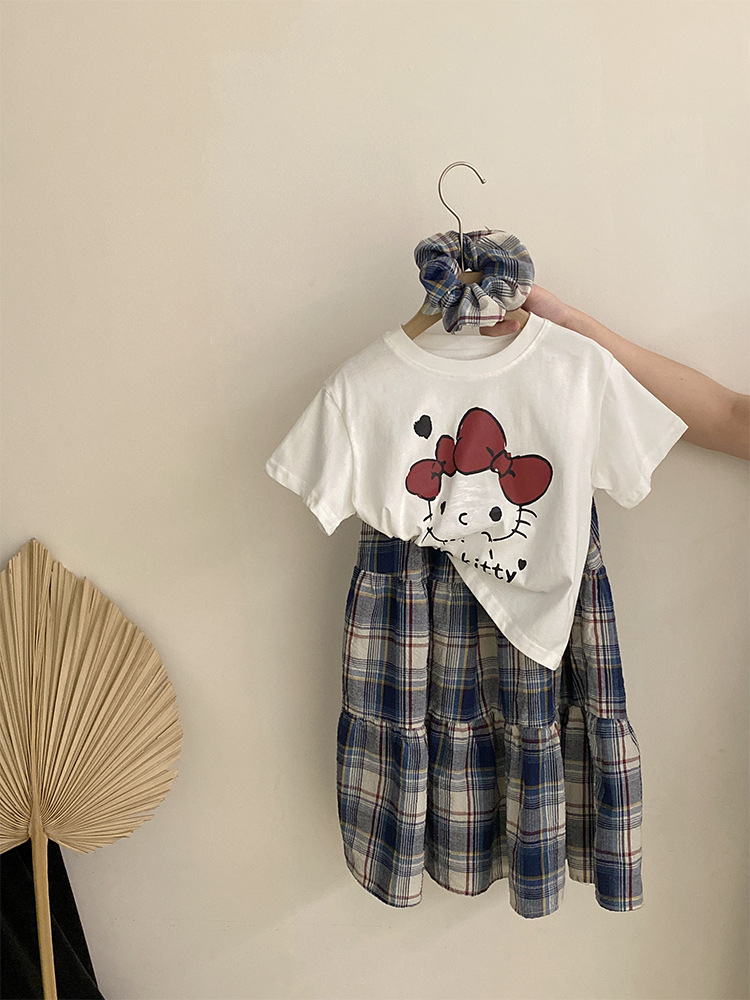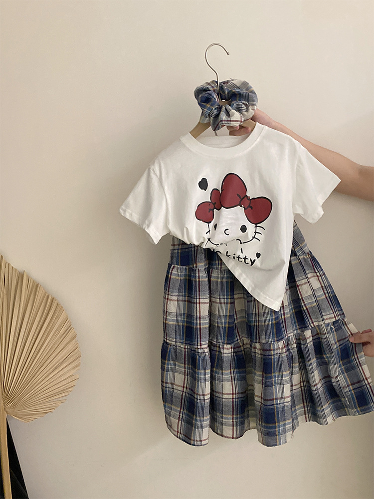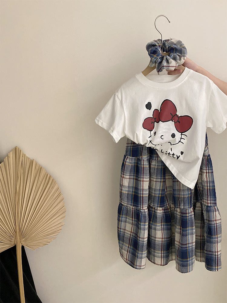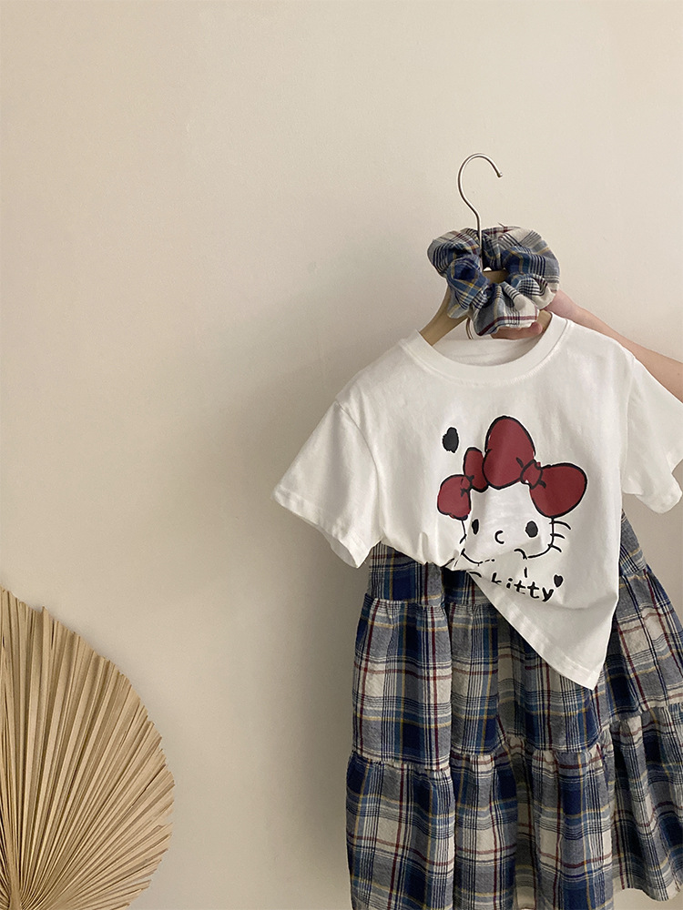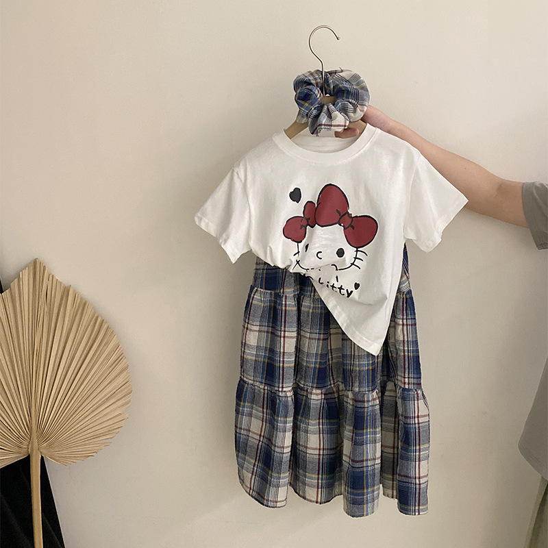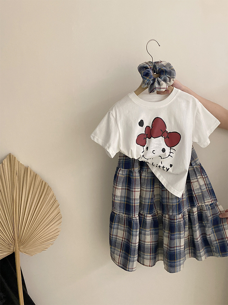 소녀 한국식 여름 새 인쇄 만화 고양이 반팔 티셔츠 2025 올 매치 격자 무늬 스커트 투피스 세트