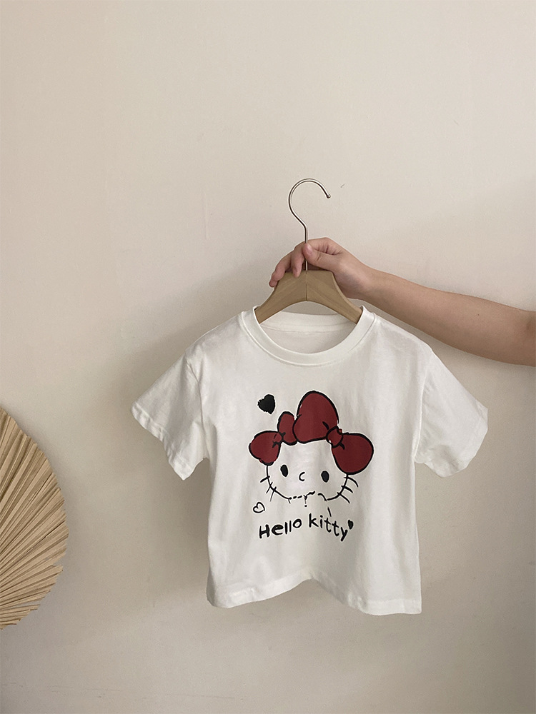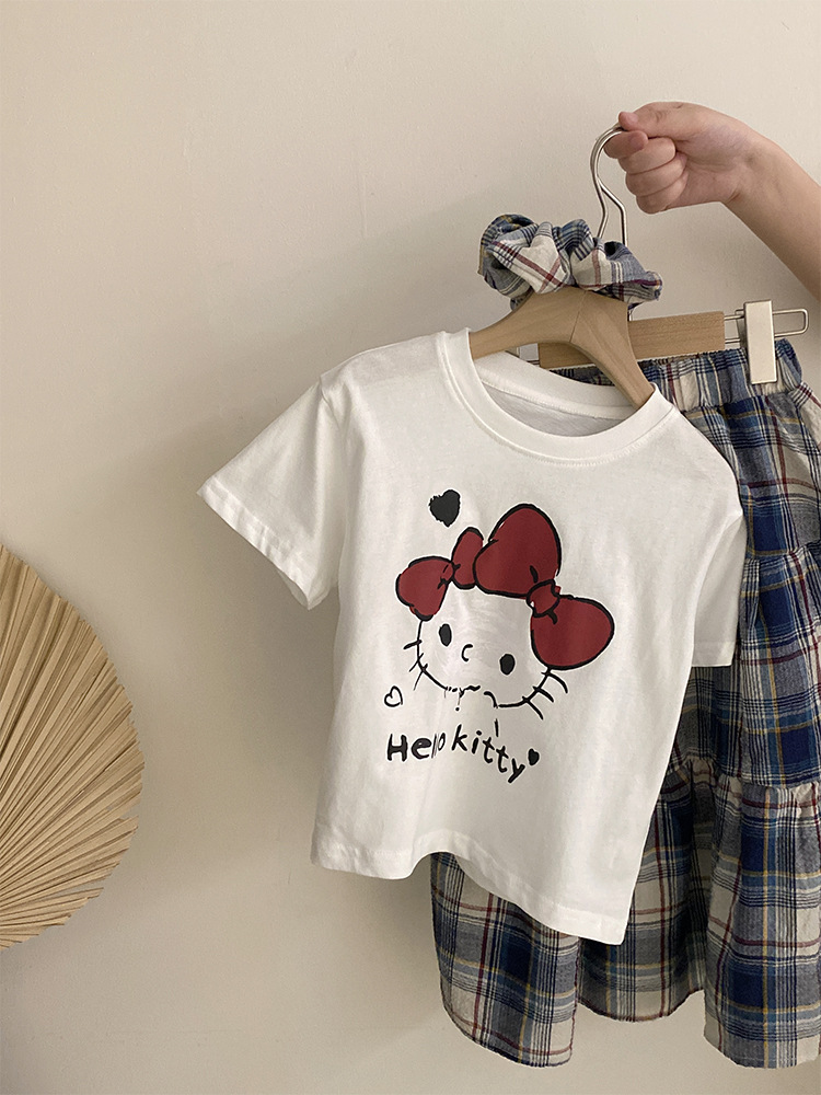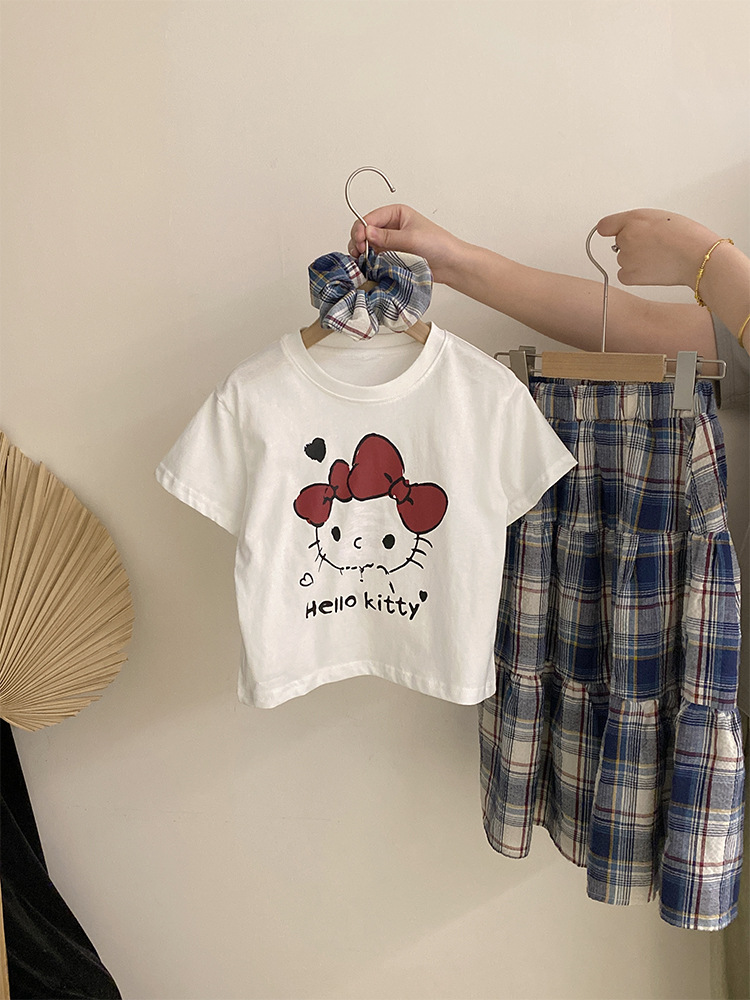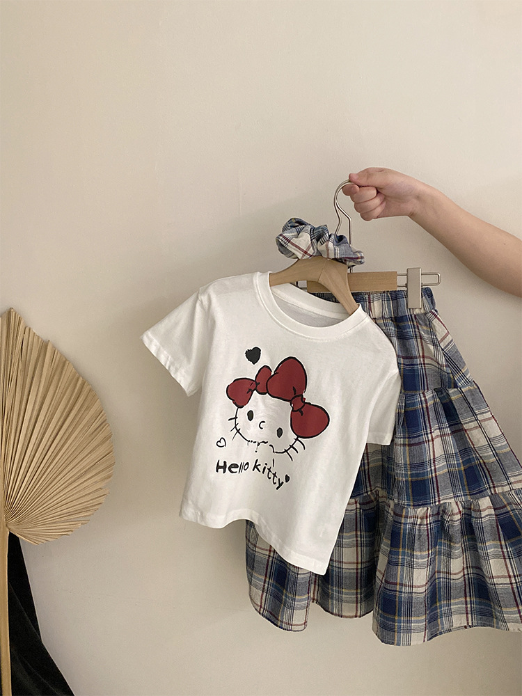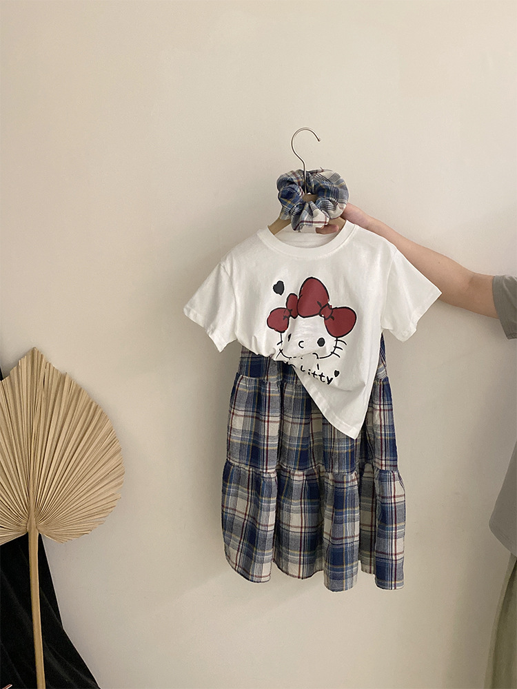 소녀 한국식 여름 새 인쇄 만화 고양이 반팔 티셔츠 2025 올 매치 격자 무늬 스커트 투피스 세트