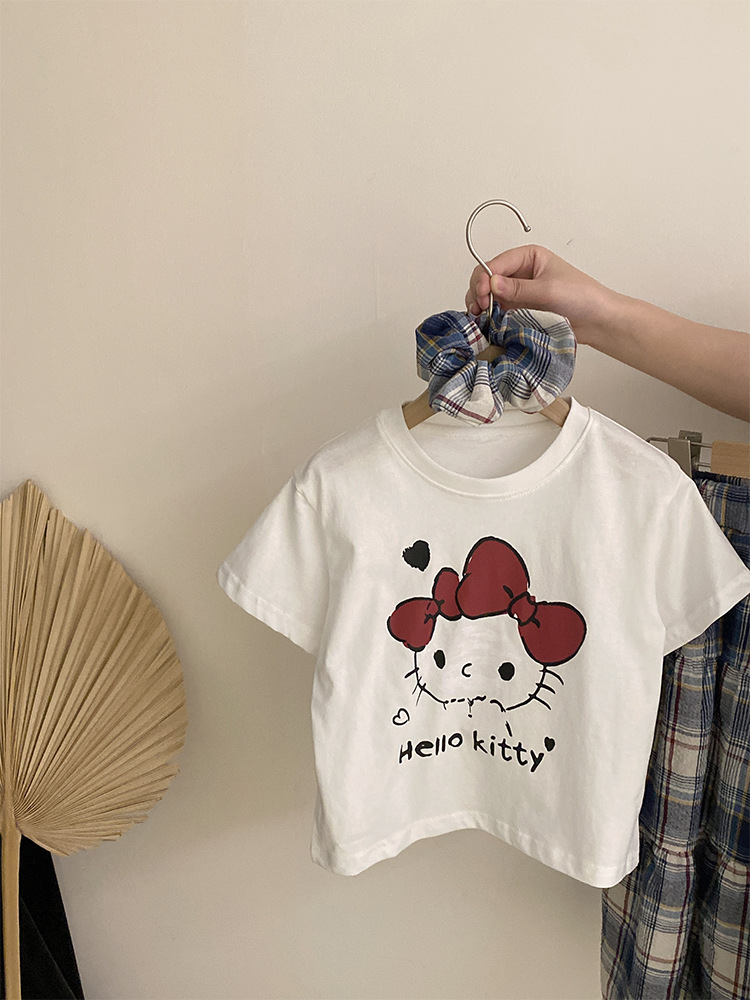 소녀 한국식 여름 새 인쇄 만화 고양이 반팔 티셔츠 2025 올 매치 격자 무늬 스커트 투피스 세트스토어 가기