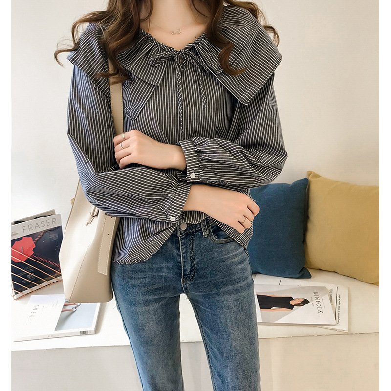 여자 도착 한국 스타일 인형 칼라 플러스 사이즈 줄무늬 셔츠 여성용 루즈 틱 탑 홍콩 스타일 긴 소매 셔츠스토어 가기