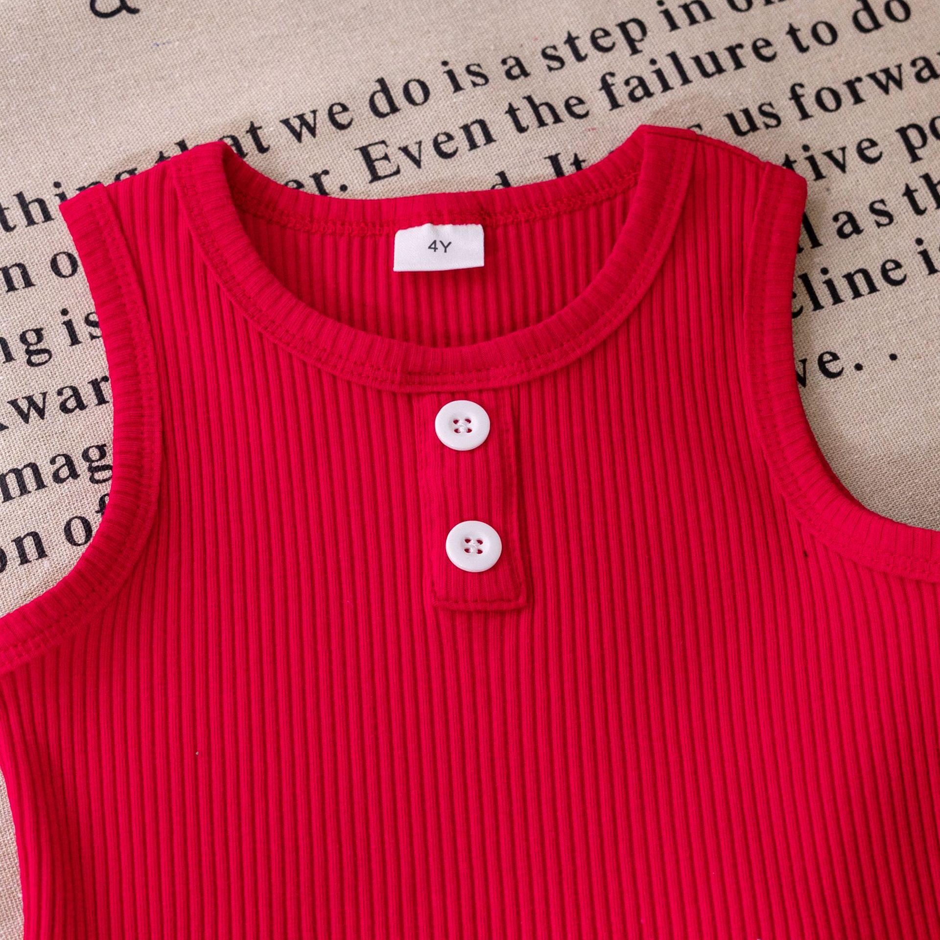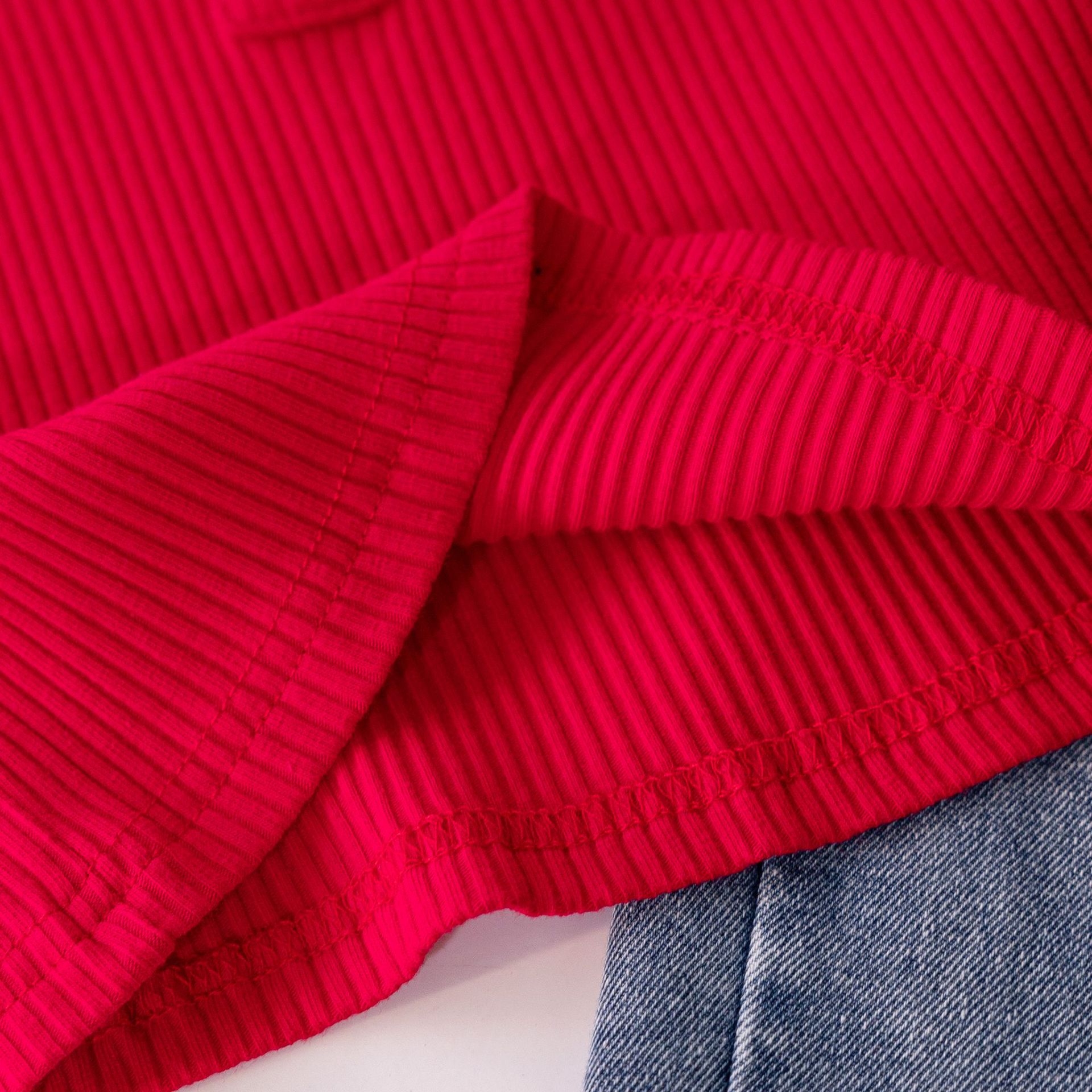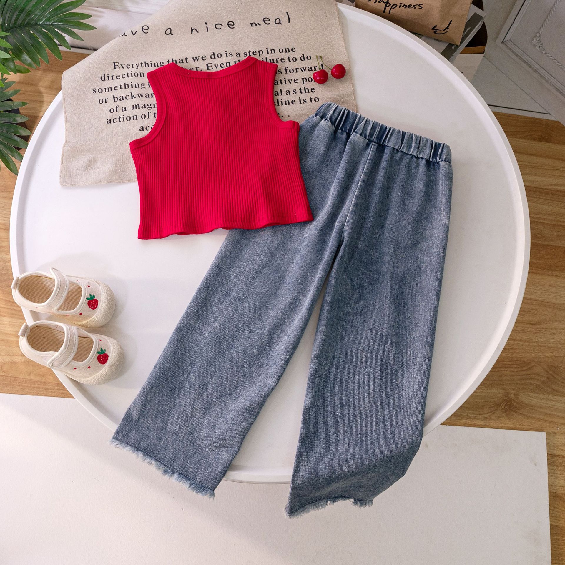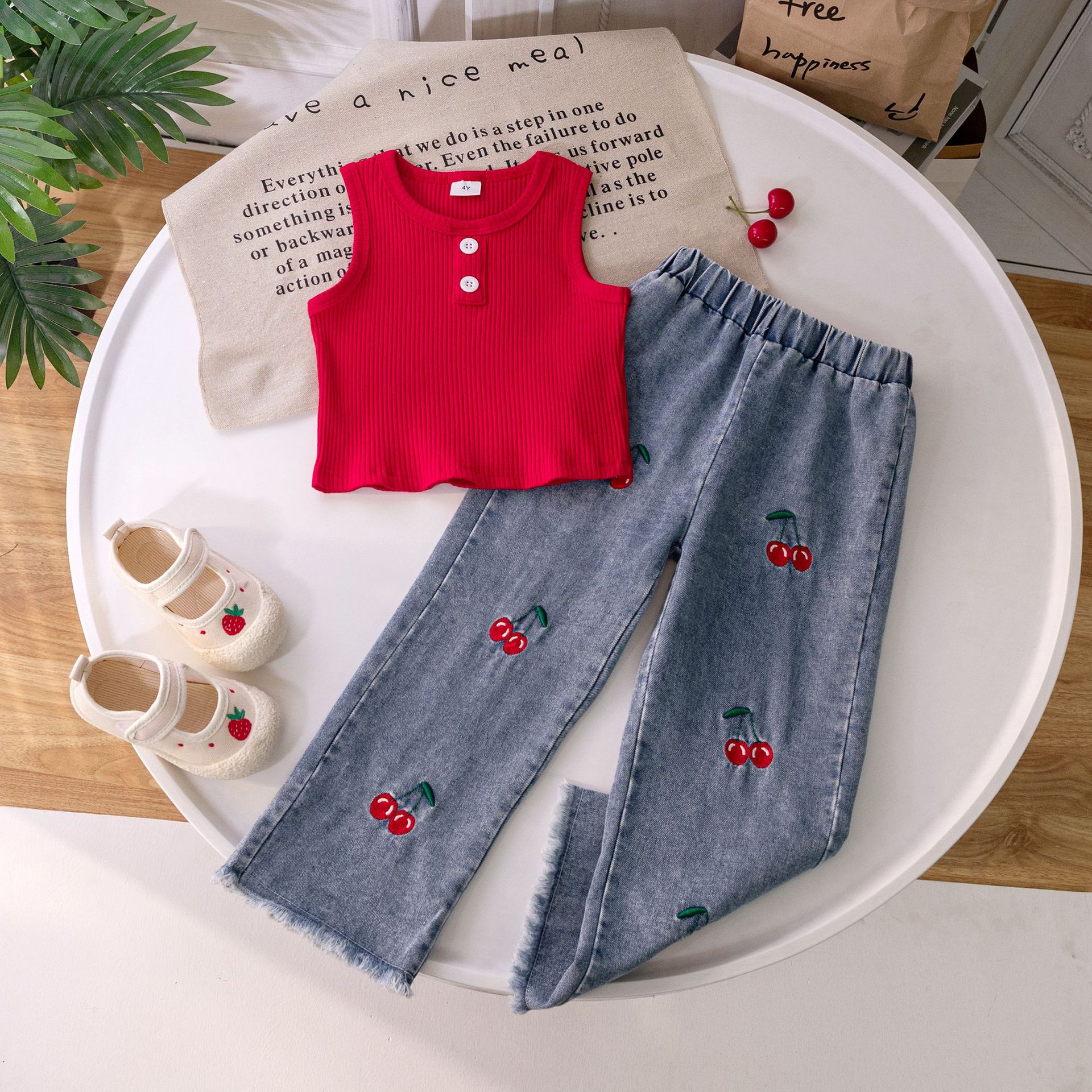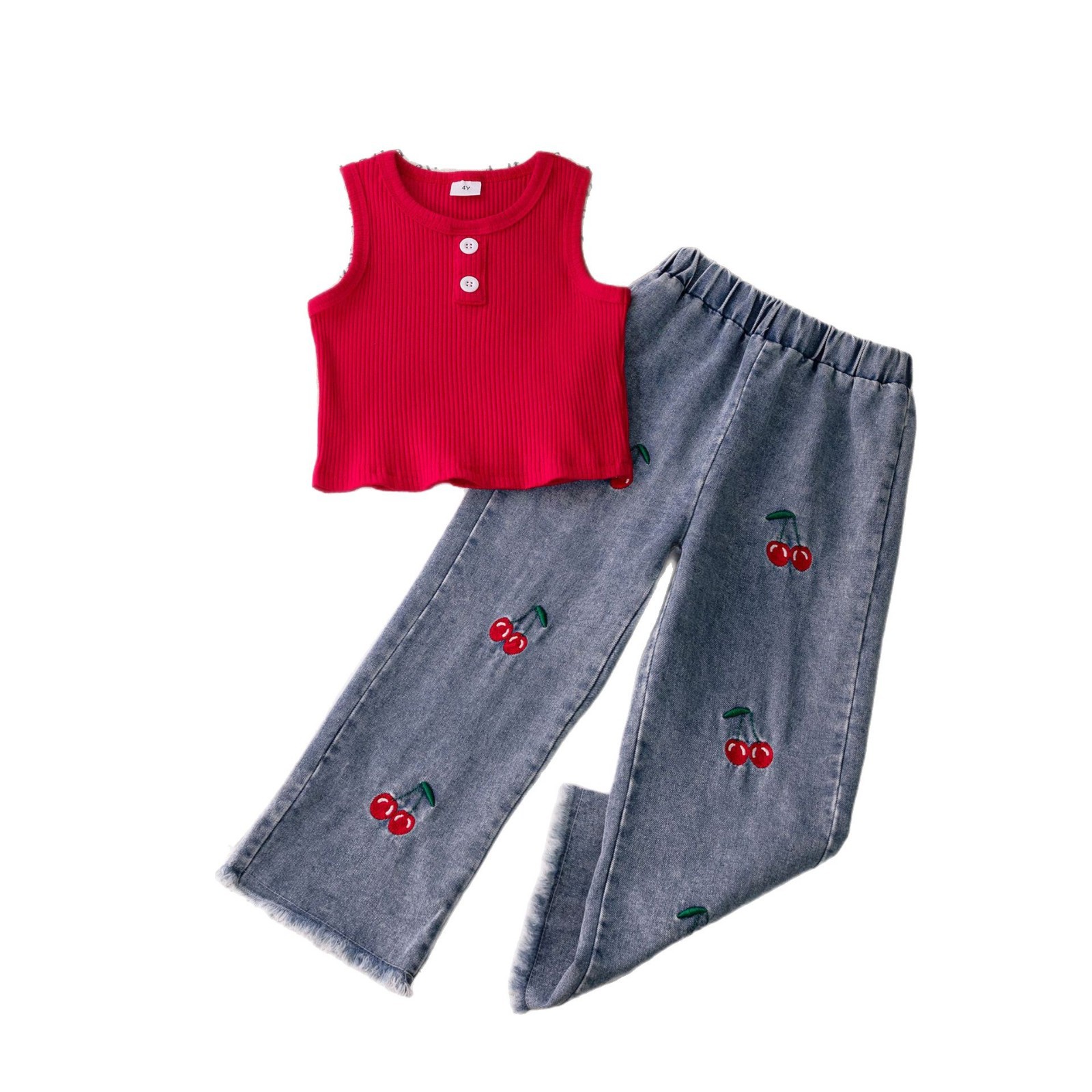 한국 스타일 여아 여름 옷, 인기 패셔너블 캐주얼 조끼 니트 탑 + 체리 자수 데님 바지 정장