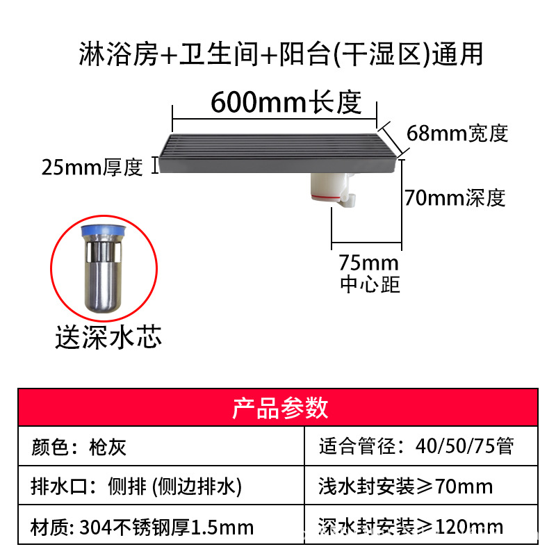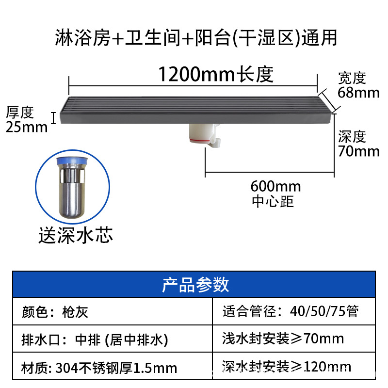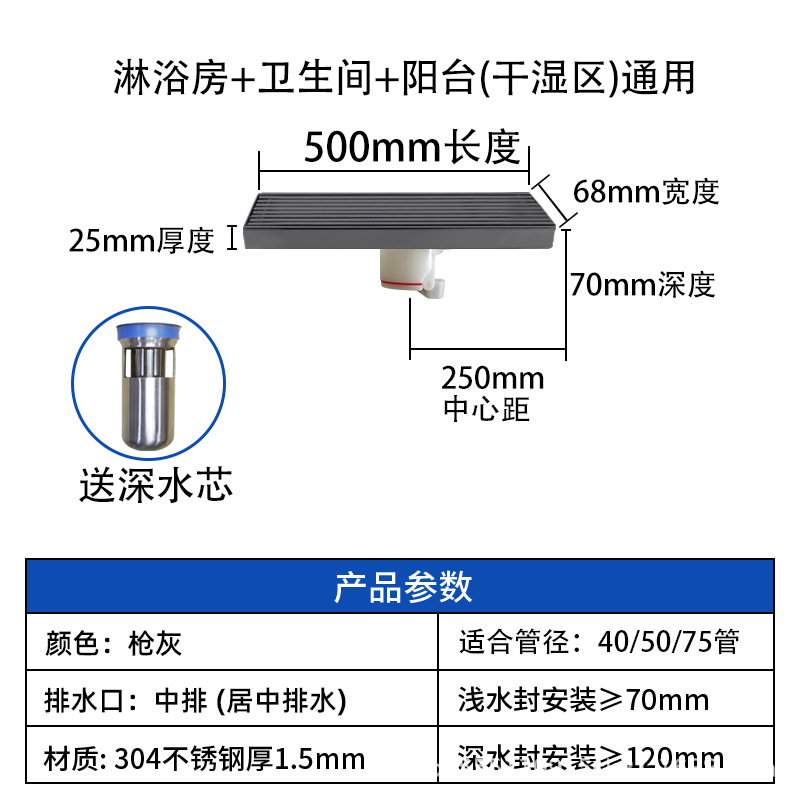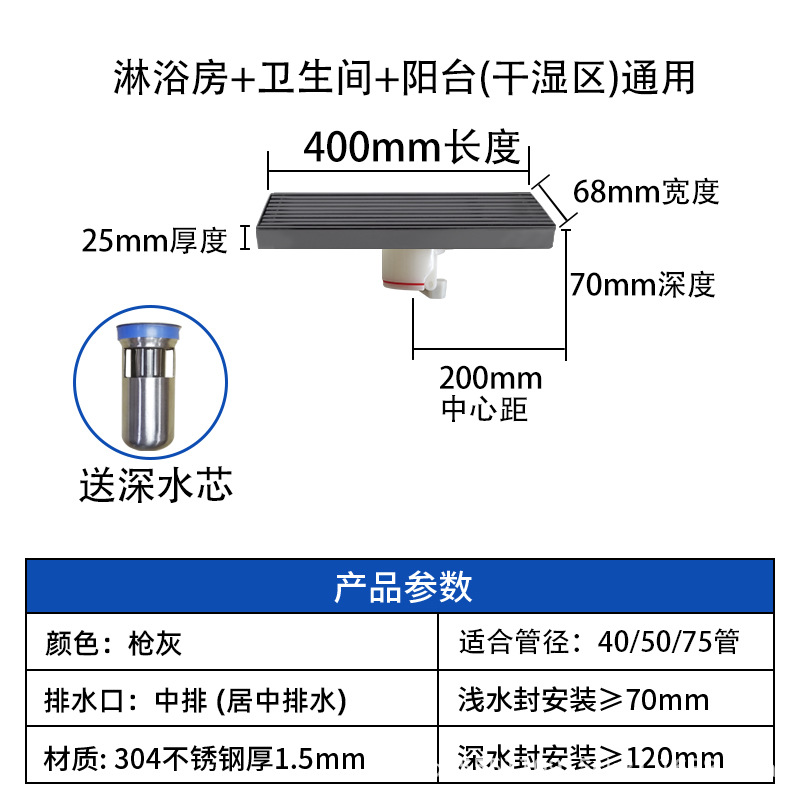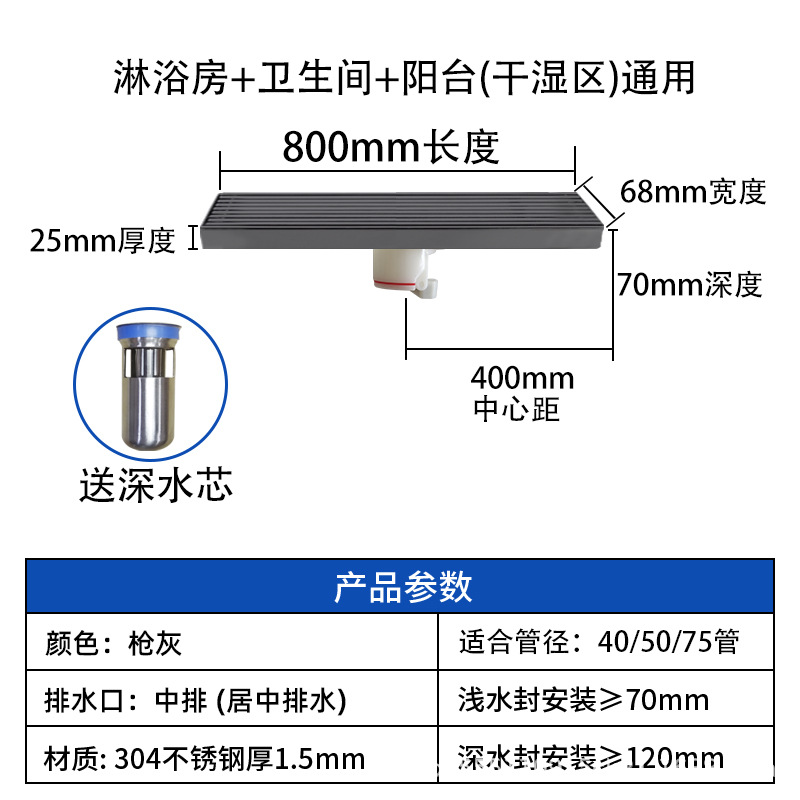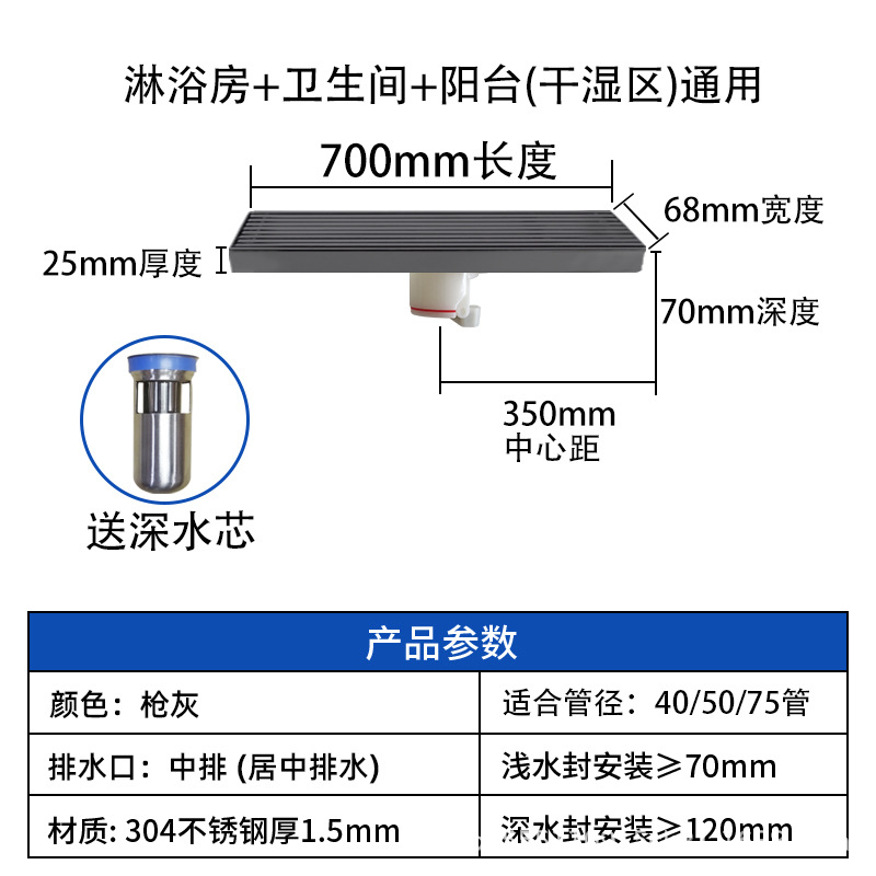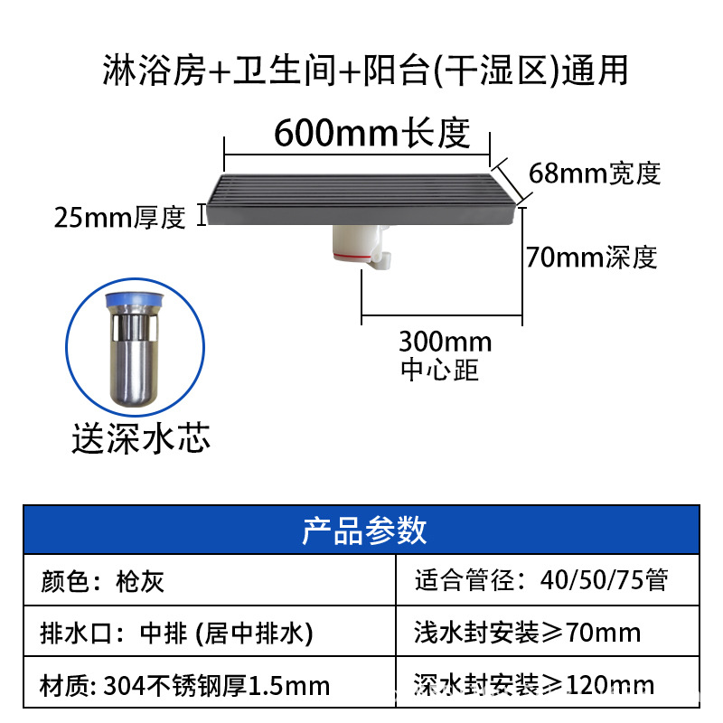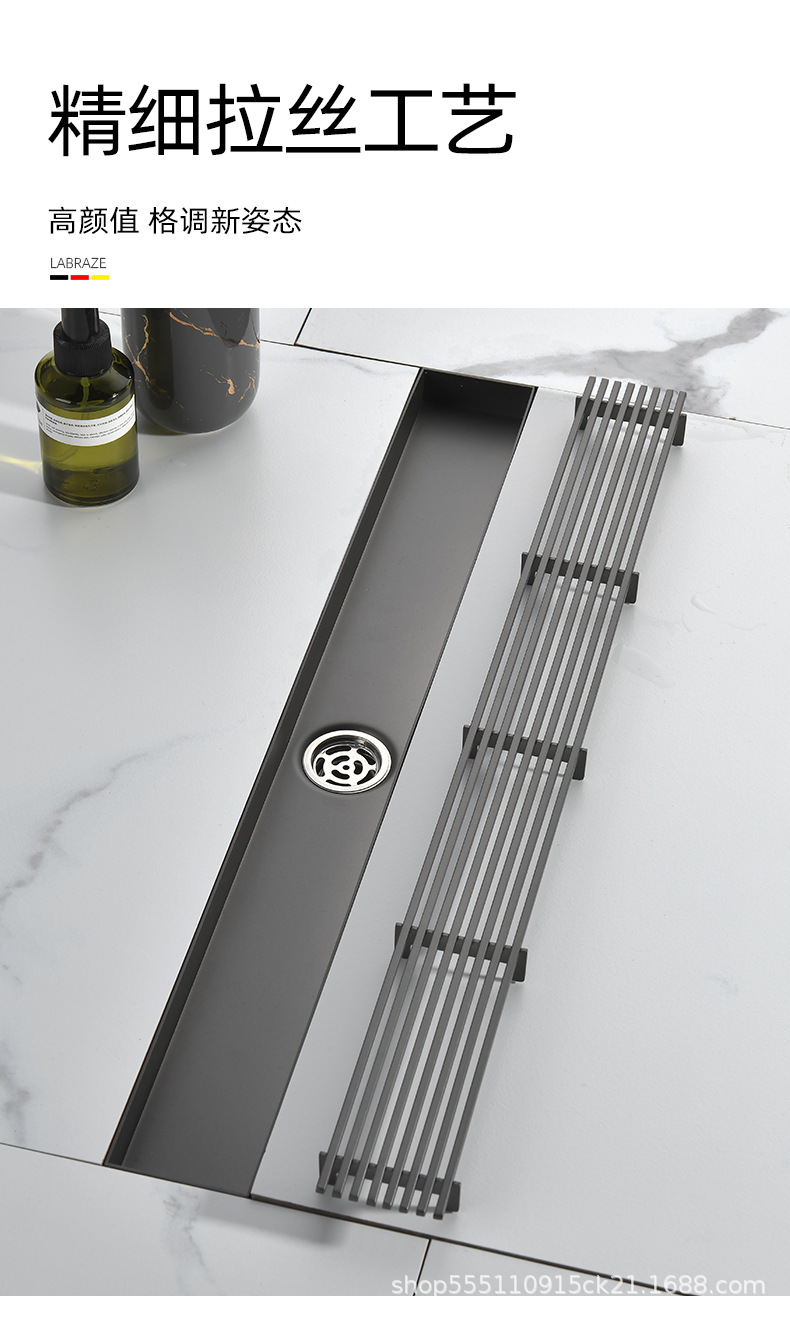 스테인레스 스틸 긴 바 바닥 배수구 304 바 욕실 배수구 직사각형 대용량 건 그레이 냄새 방지 욕실 68스토어 가기