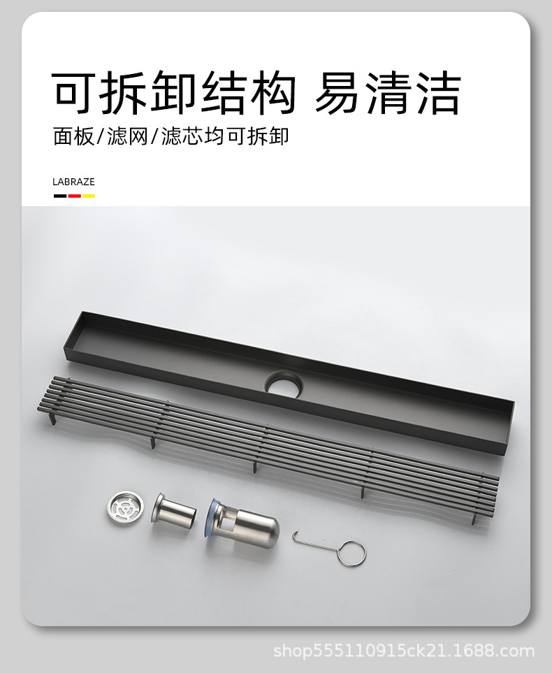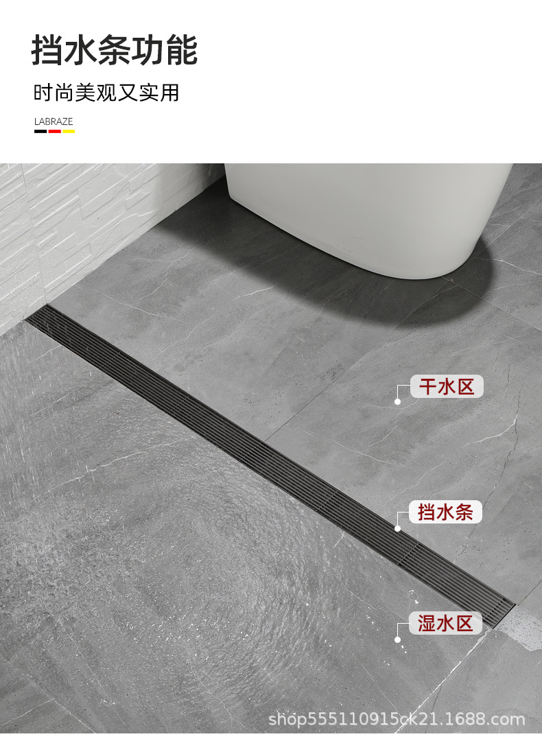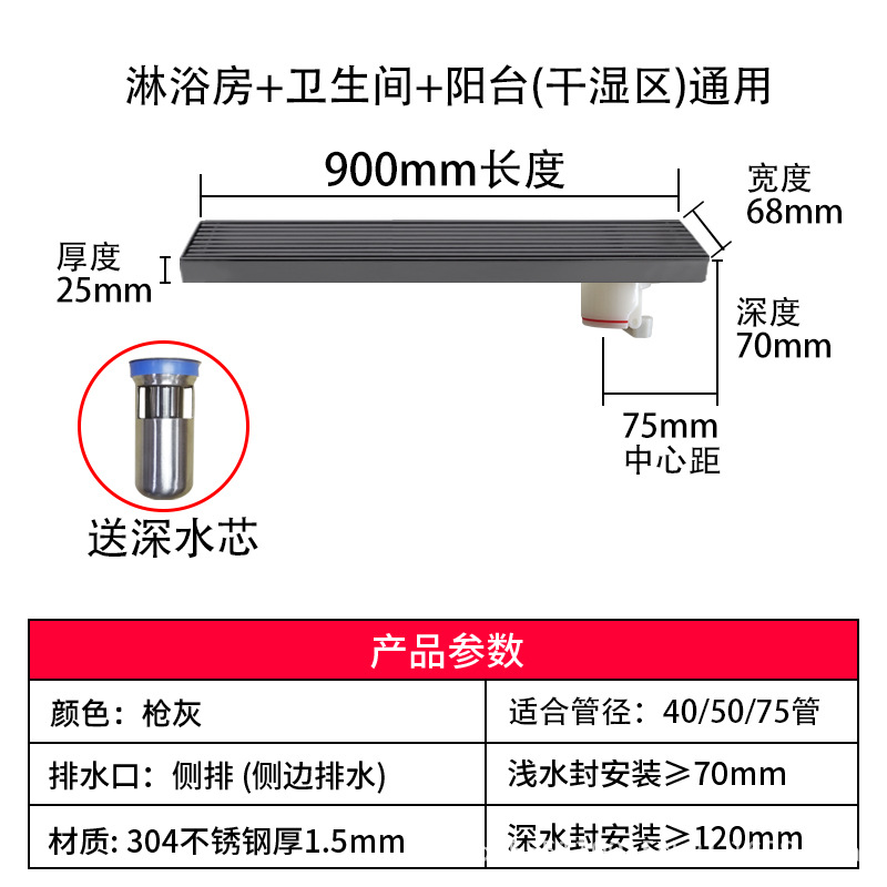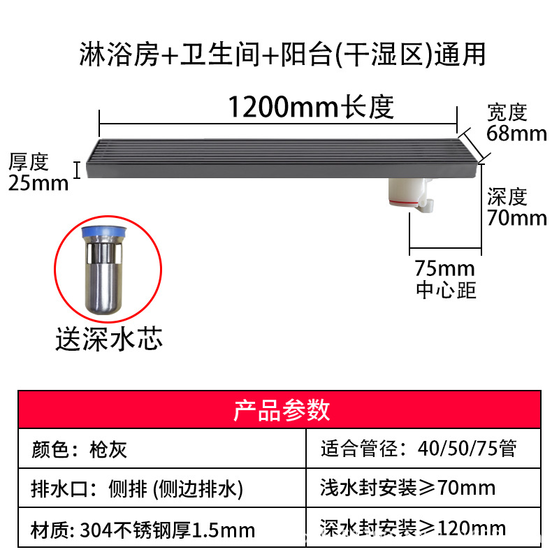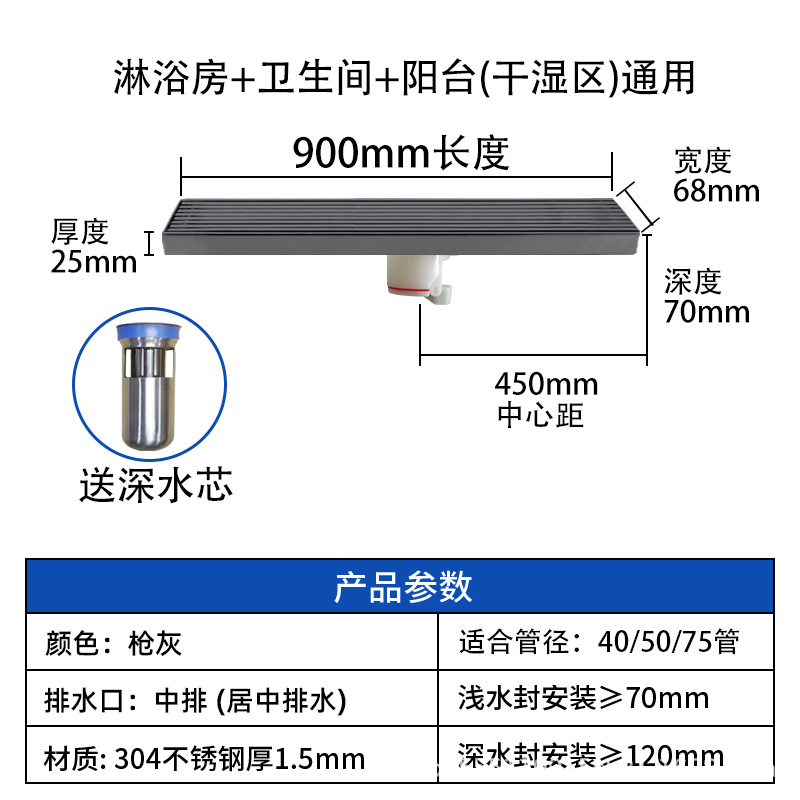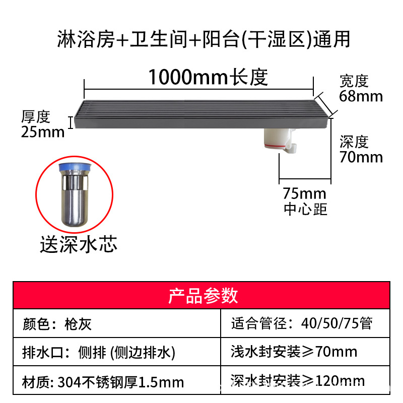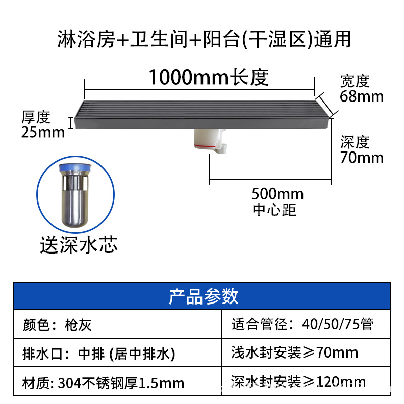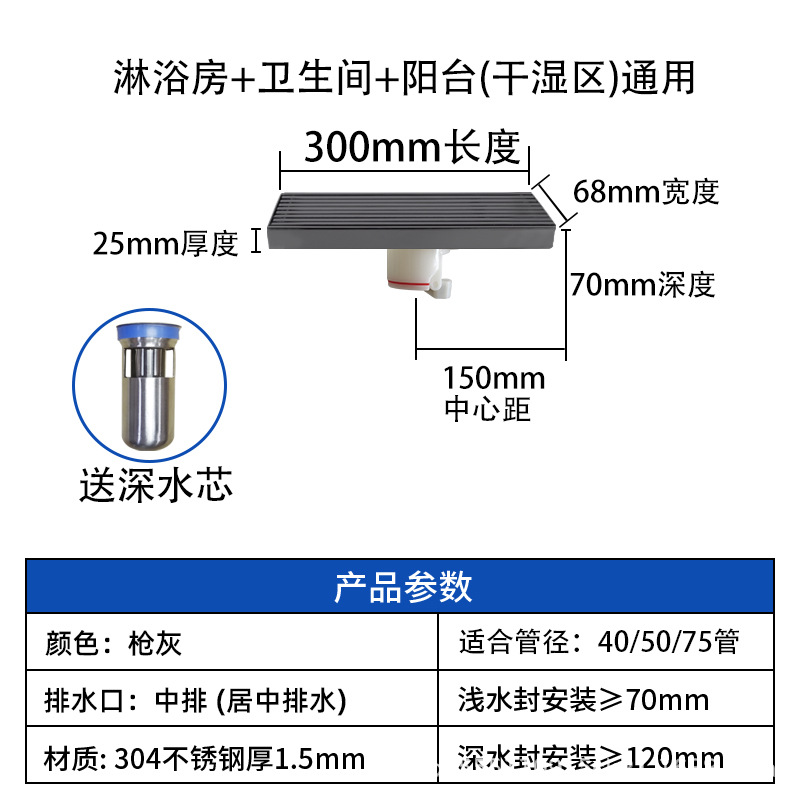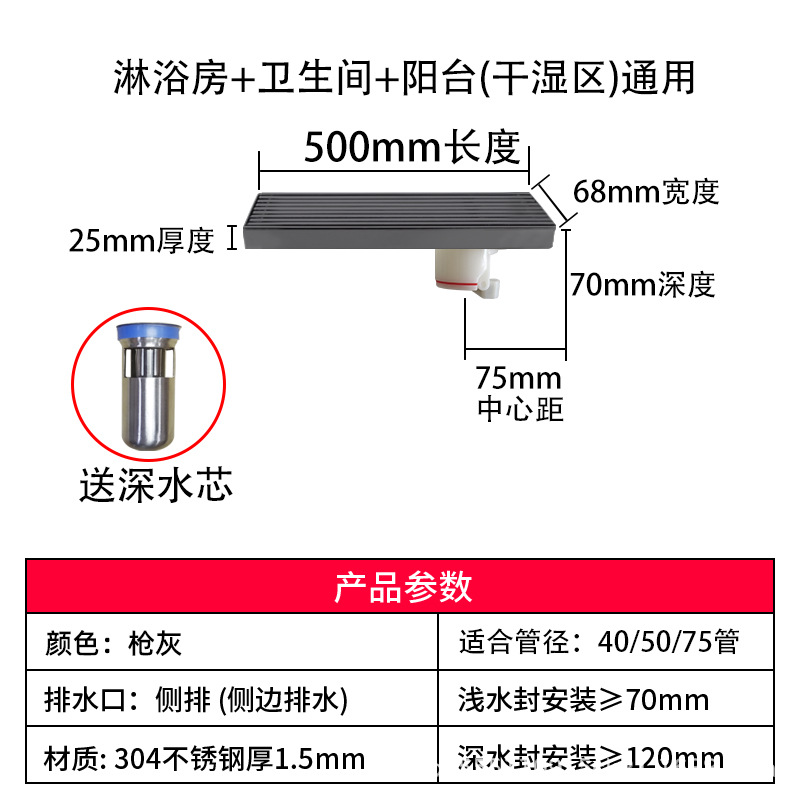스테인레스 스틸 긴 바 바닥 배수구 304 바 욕실 배수구 직사각형 대용량 건 그레이 냄새 방지 욕실 68스토어 가기