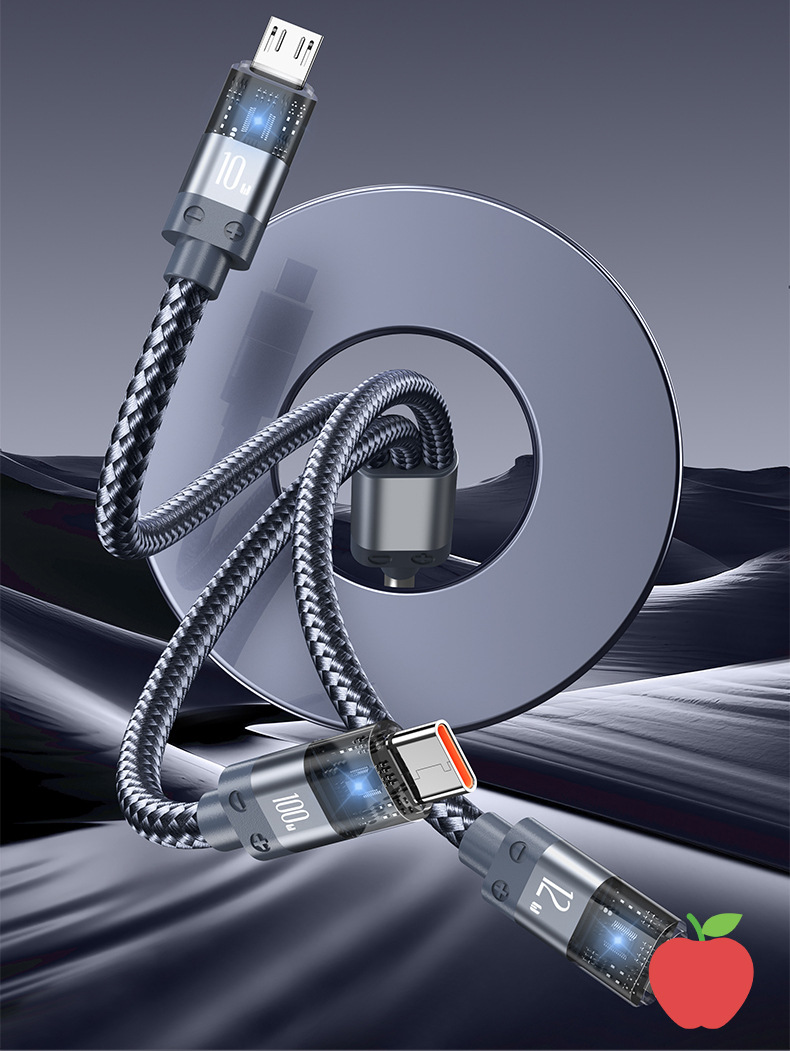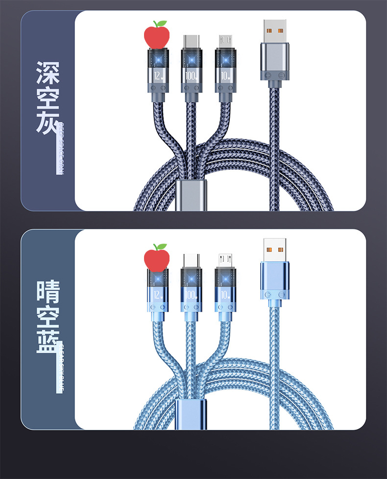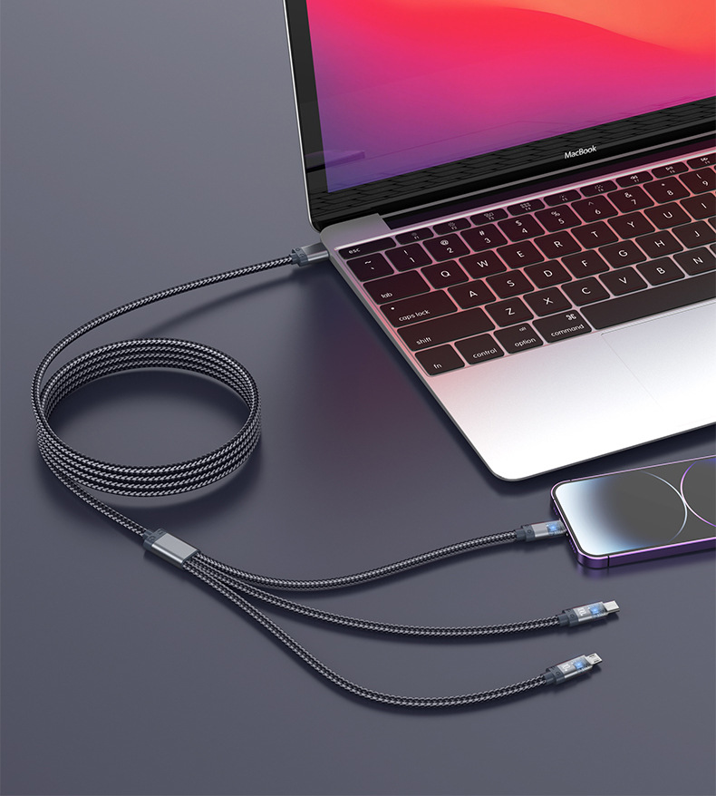 디지털 디스플레이 1-3 데이터 케이블은 Apple 100w 충전 케이블에 적합합니다. 3-in-1 나일론 편조 휴대폰 고속 충전 케이블