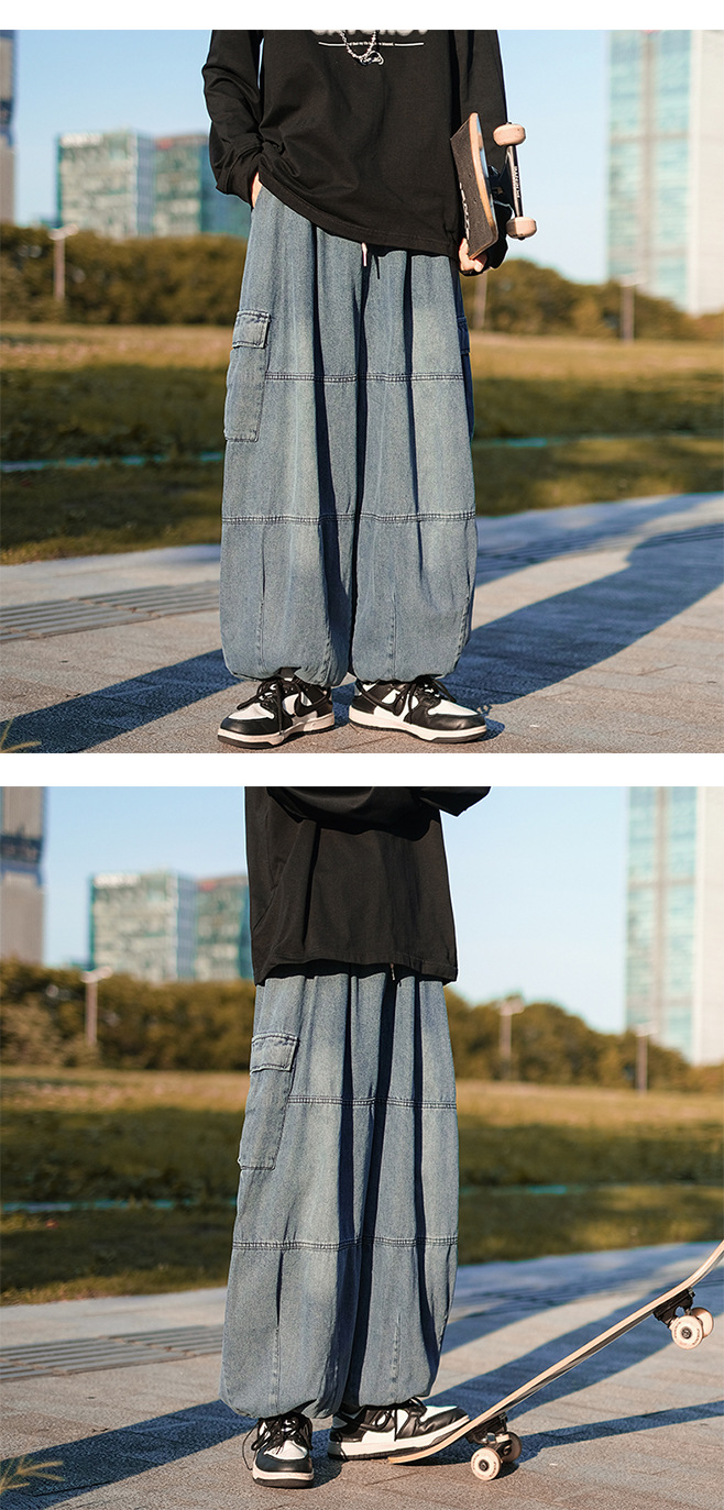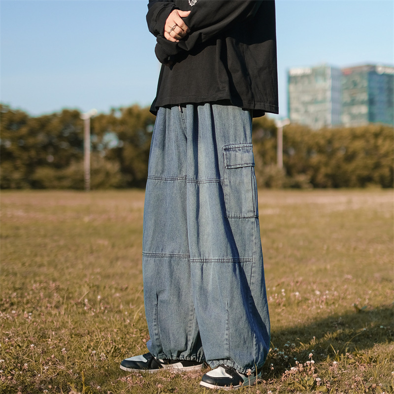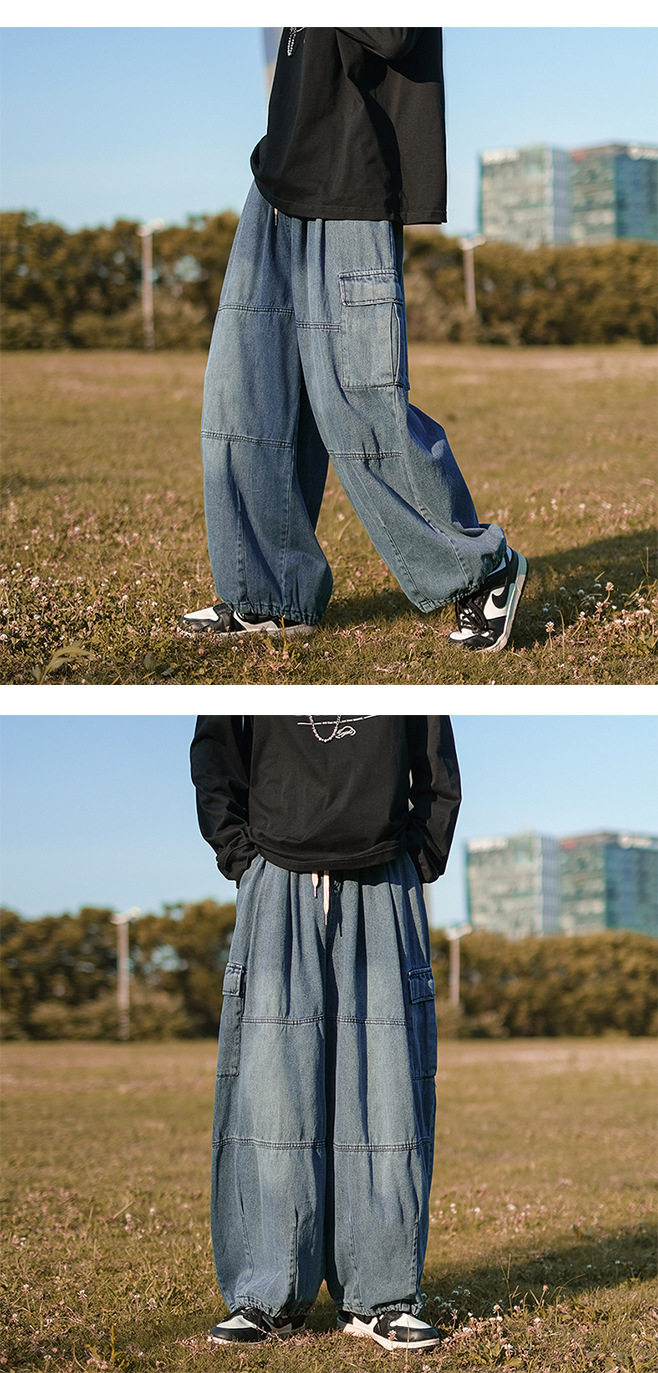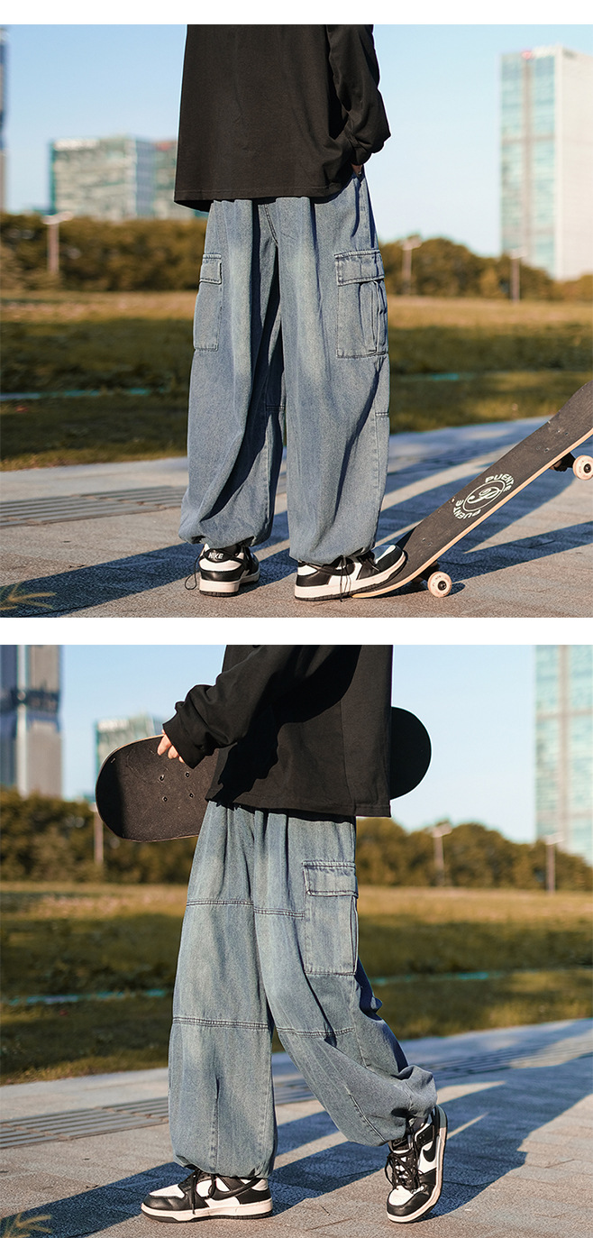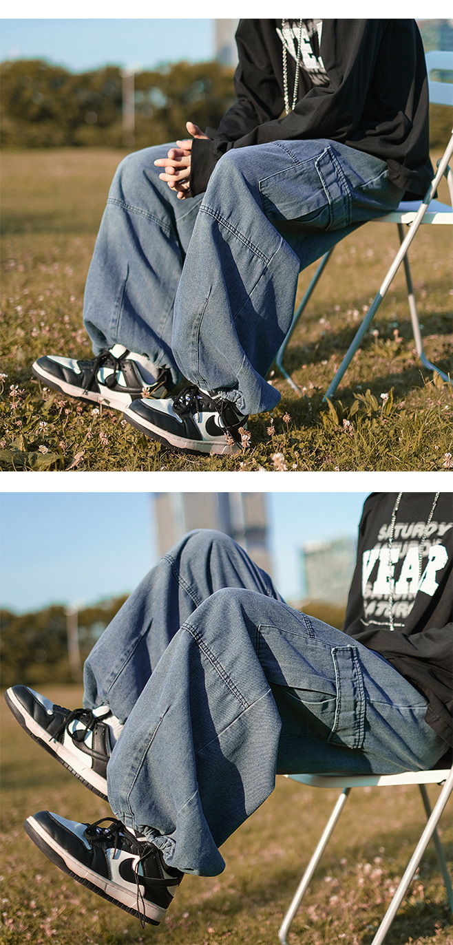 春秋季阔腿牛仔裤男士宽松直筒工装裤ins潮牌日系复古高街长裤子