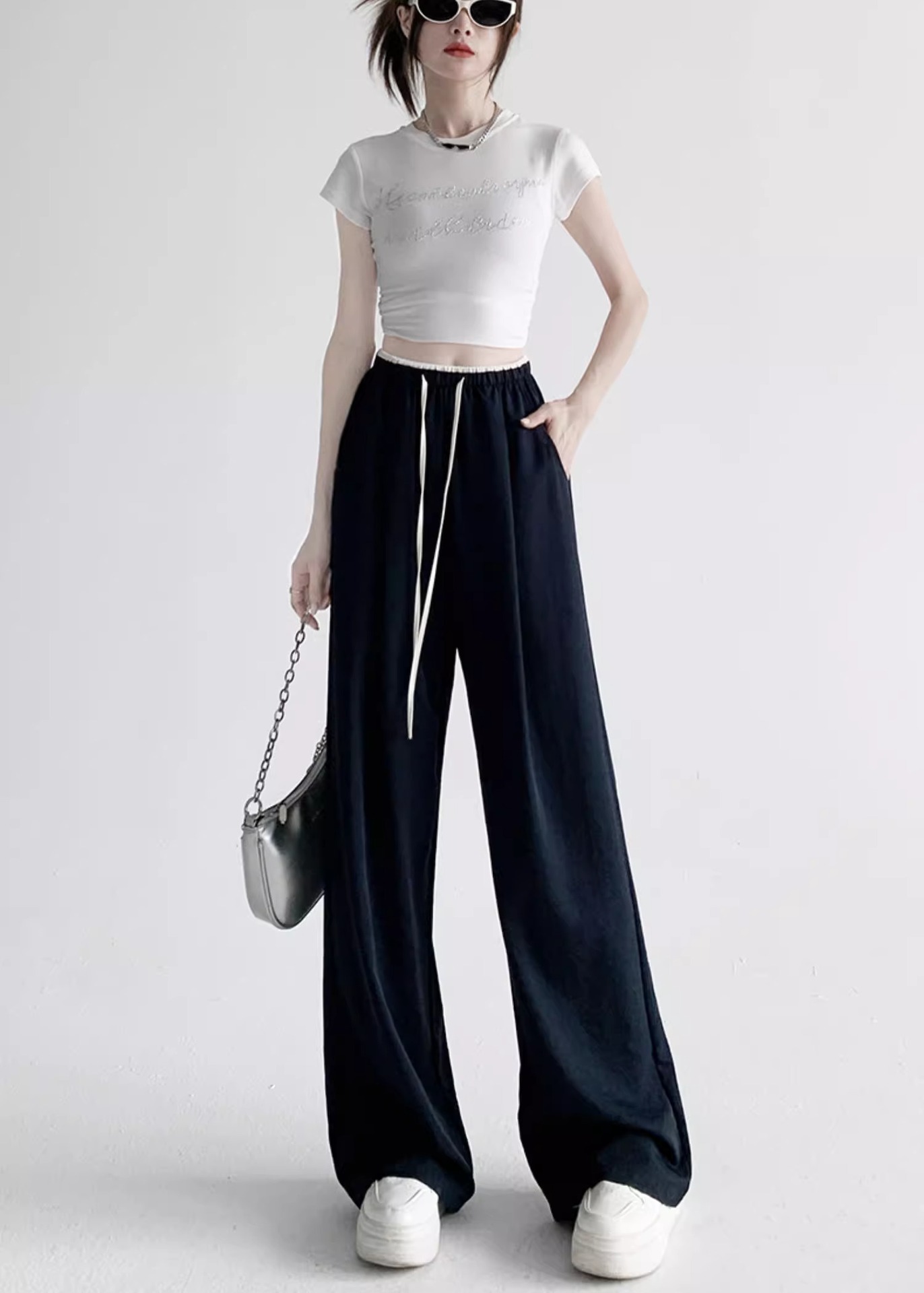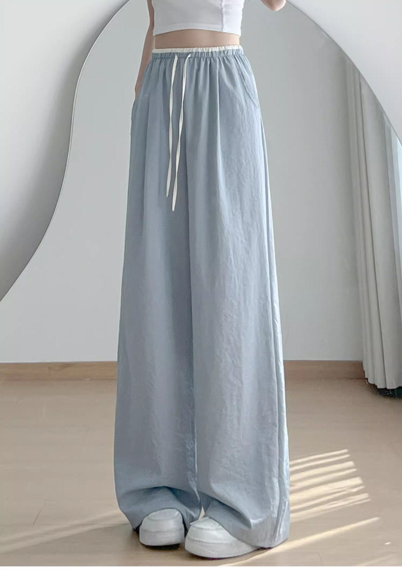 블루 아이스 실크 넓은 다리 바지 여성 여름 얇은 2025 새로운 높은 허리 느슨한 슬리밍 휴식 좁은 시원한 바지