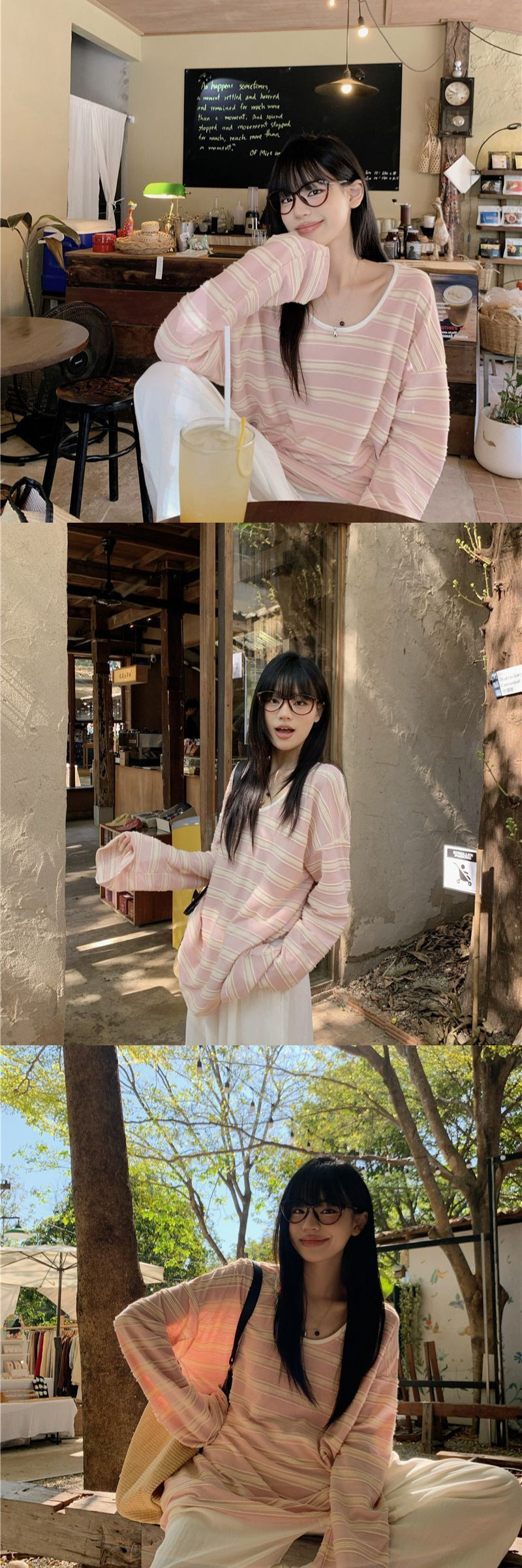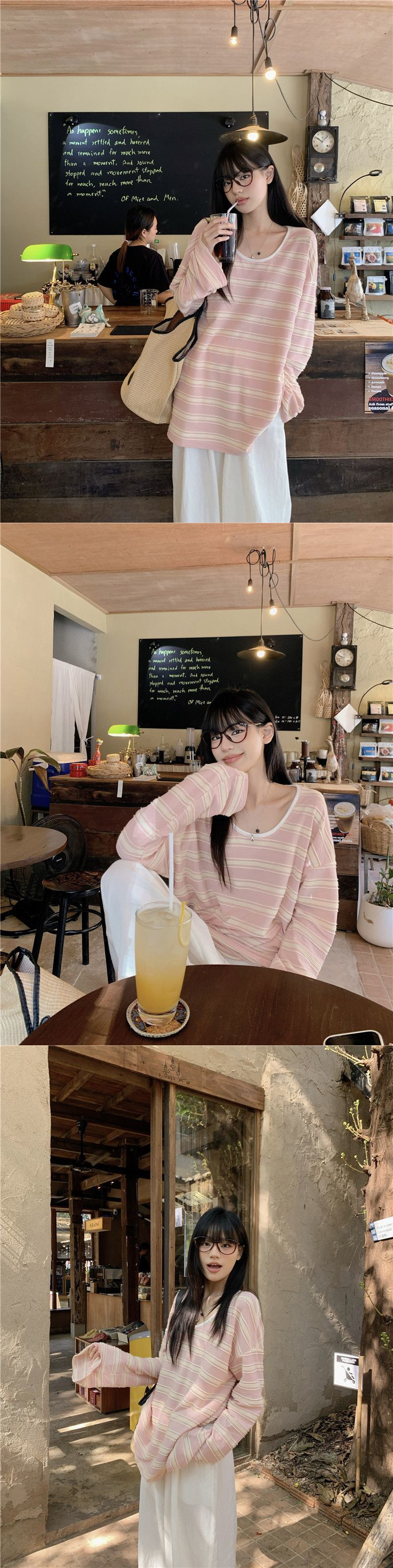 한국 스타일 핑크 줄무늬 최고 바느질 게으른 스타일 느슨한 독특한 긴 소매 셔츠 선 스크린 에어컨 봄 및 여름 착용 셔츠스토어 가기