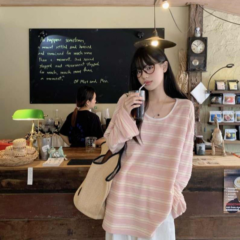 한국 스타일 핑크 줄무늬 최고 바느질 게으른 스타일 느슨한 독특한 긴 소매 셔츠 선 스크린 에어컨 봄 및 여름 착용 셔츠