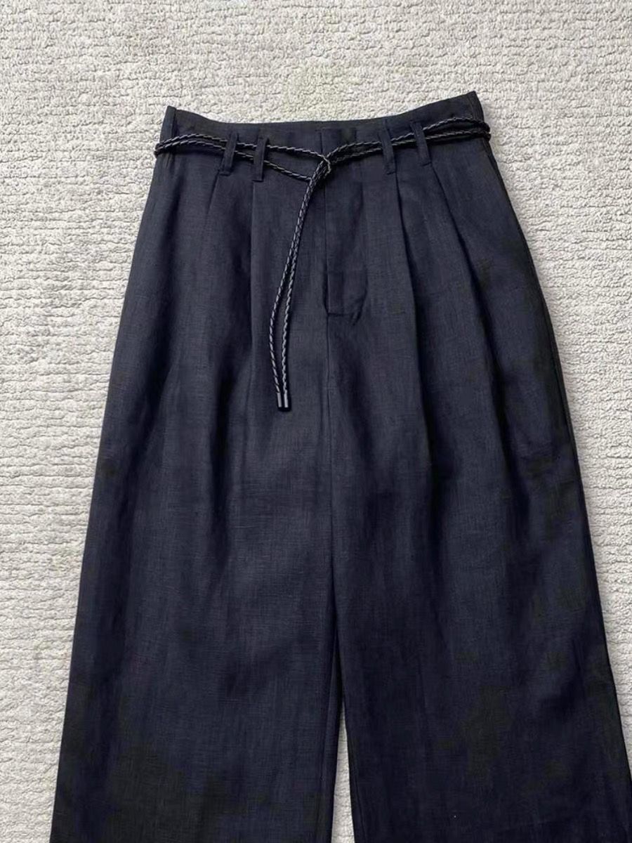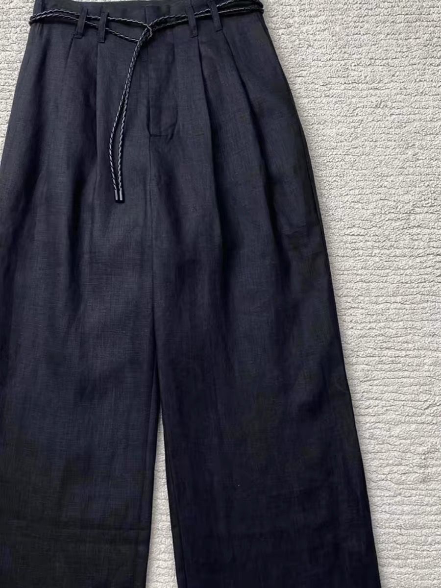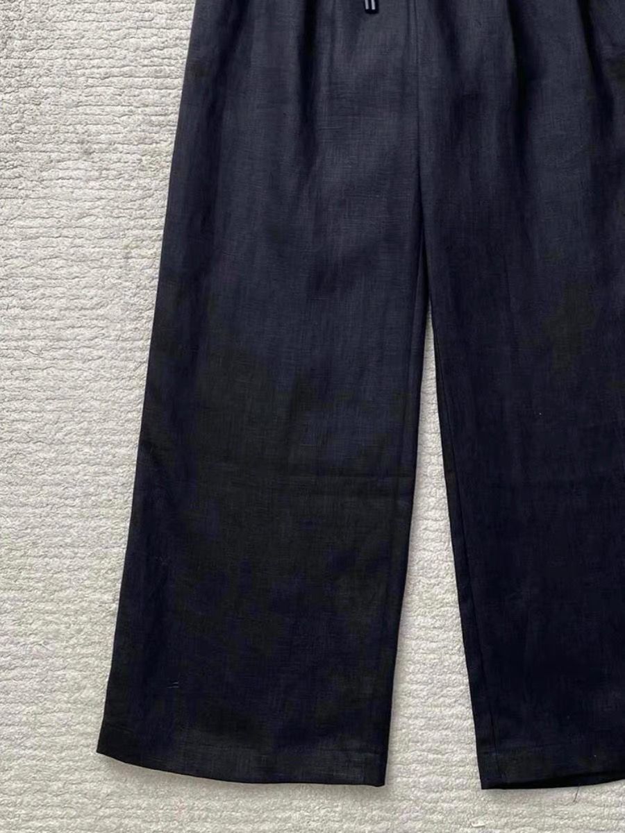 CHAO火推荐!老钱风松弛感~黑色亚麻阔腿裤女抽绳绑带休闲拖地裤