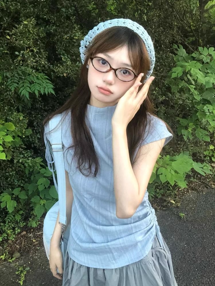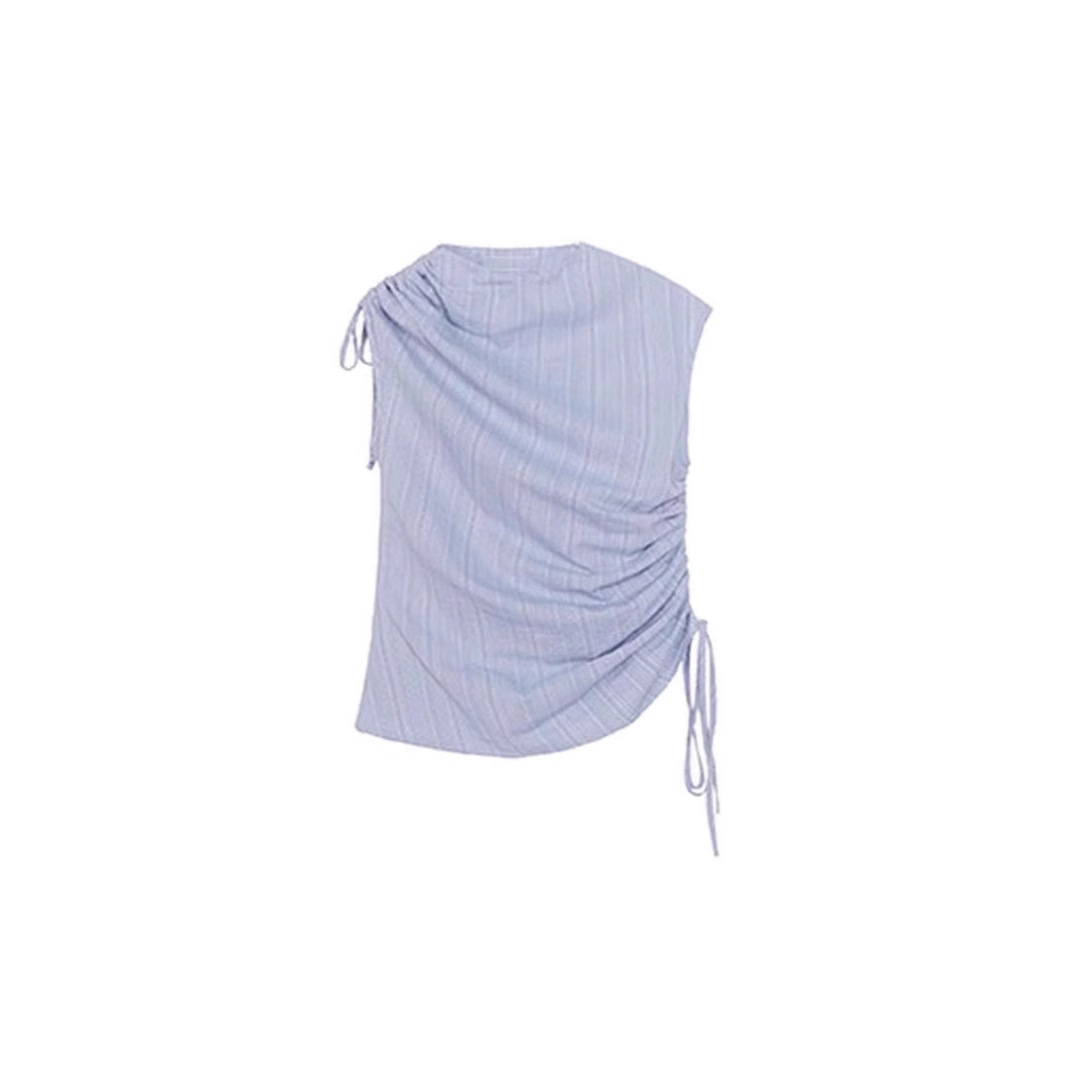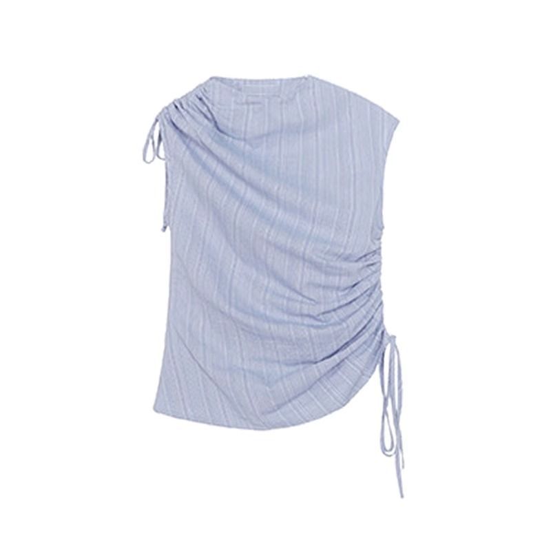 아메리칸 스타일 어깨 반팔 티셔츠 여성용 여름 슬림 핏 타이트 허리 주름 디자인 센스 틈새 반 하이 칼라 핫 걸 트렌디 탑