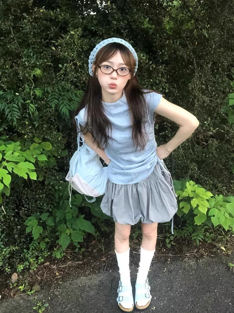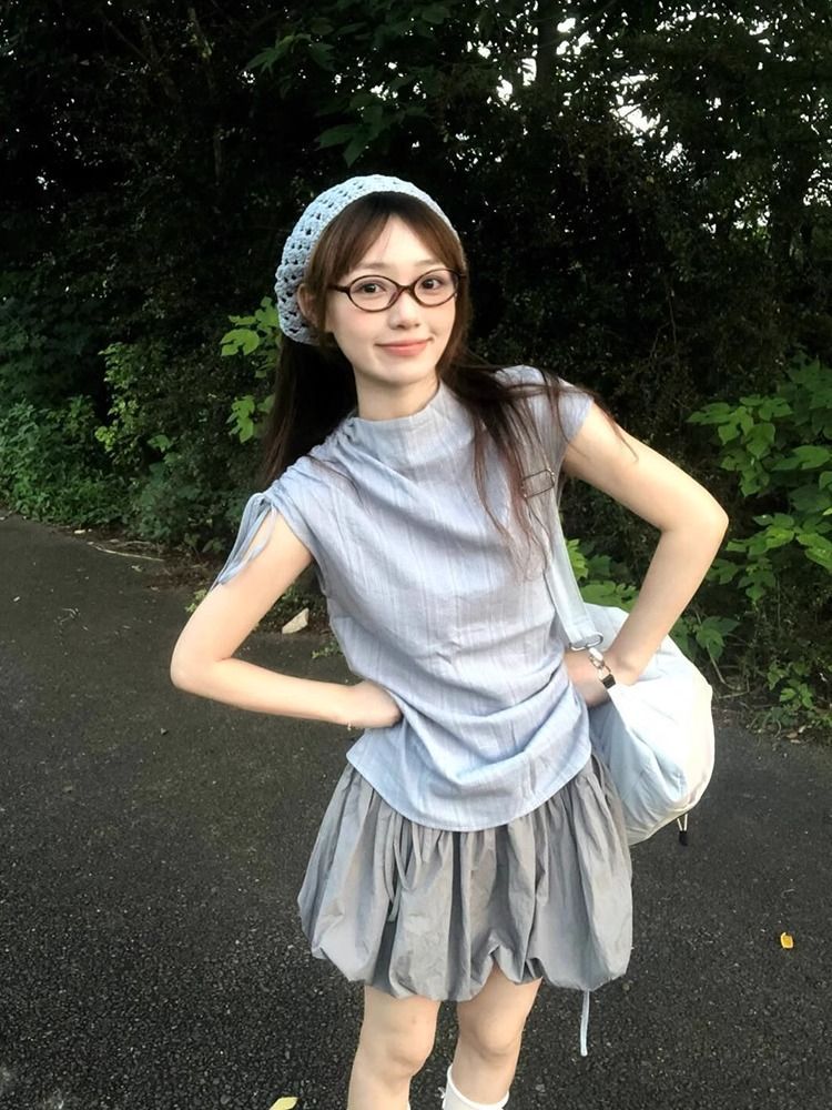 아메리칸 스타일 어깨 반팔 티셔츠 여성용 여름 슬림 핏 타이트 허리 주름 디자인 센스 틈새 반 하이 칼라 핫 걸 트렌디 탑스토어 가기