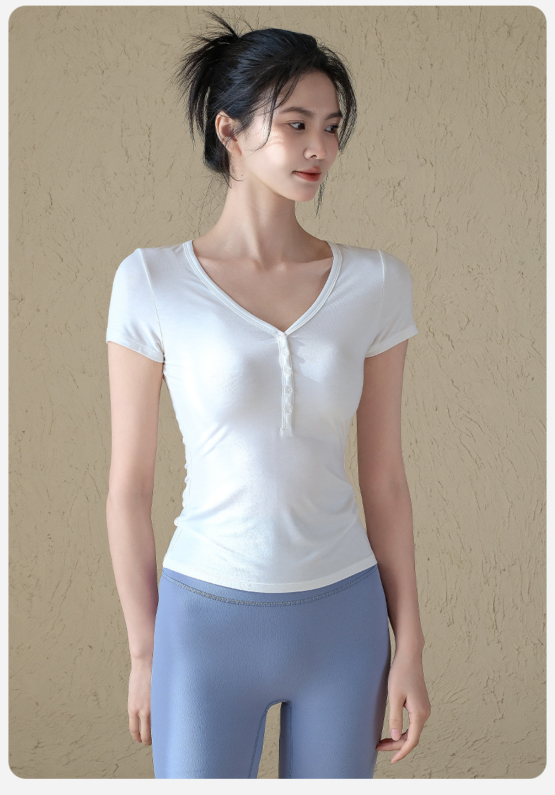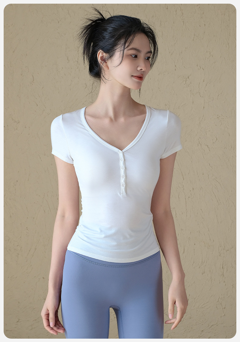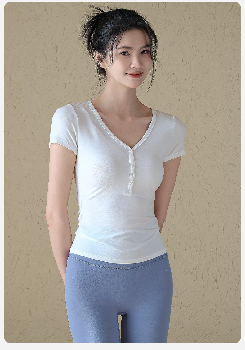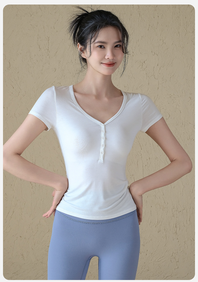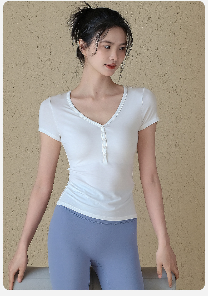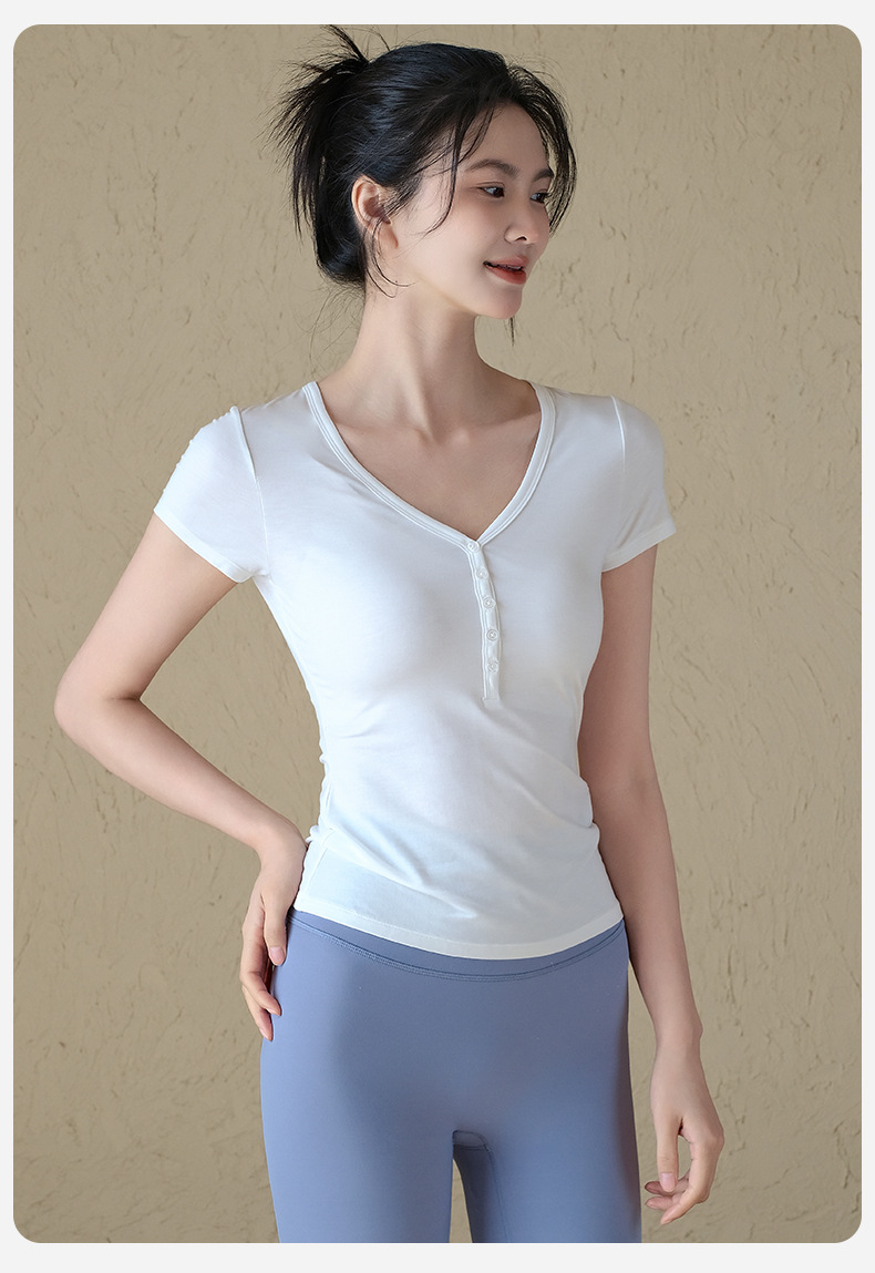 요가 반팔 최고 여자 2025 여름 새로운 슬리밍 올 매치 버튼 스포츠 티셔츠 달리기 훈련 피트니스 옷스토어 가기