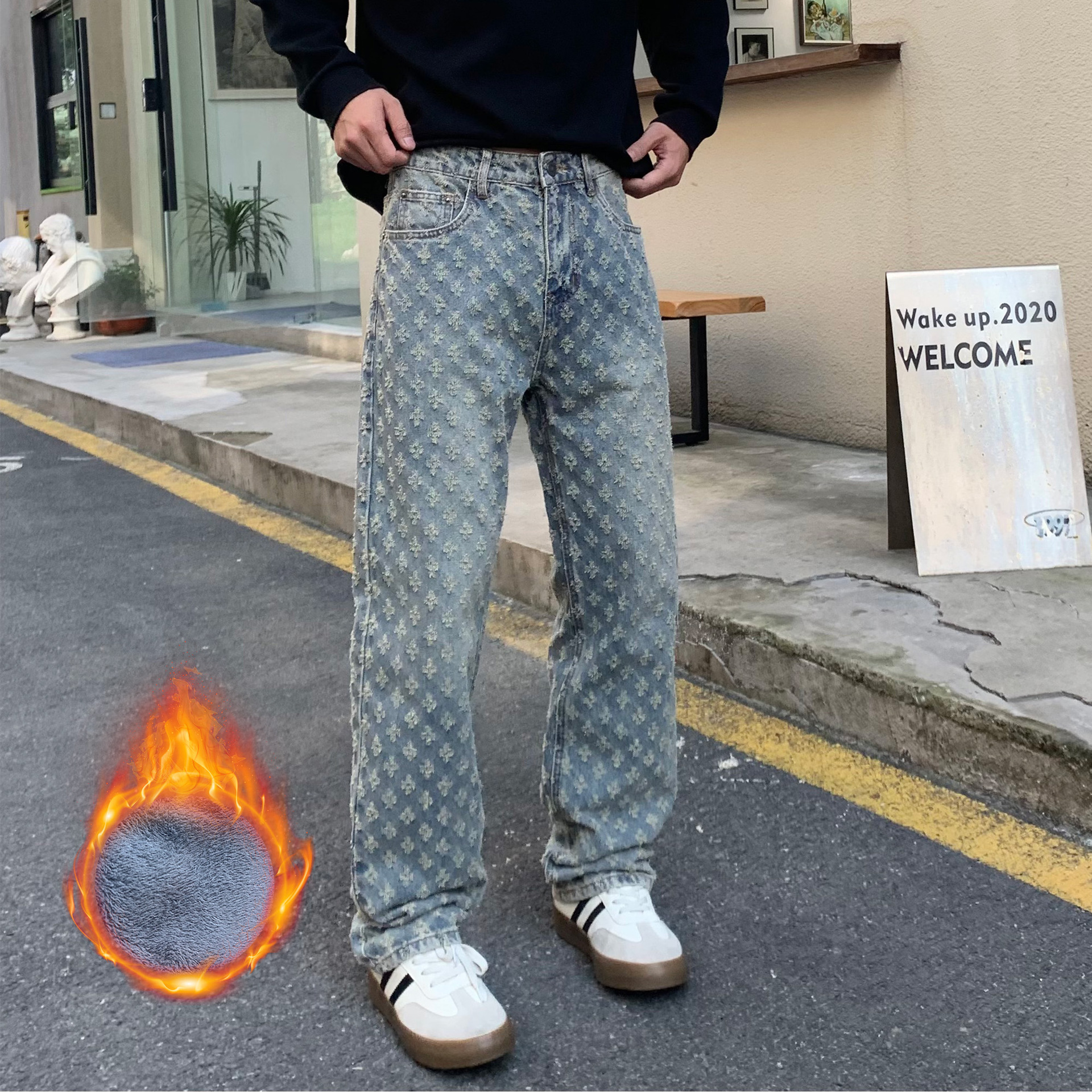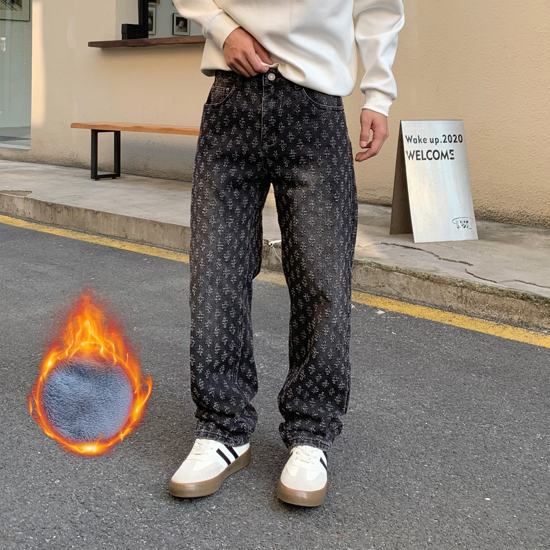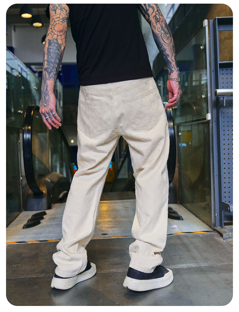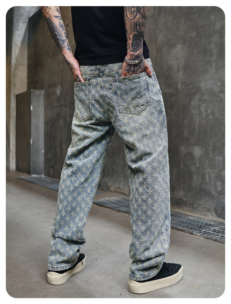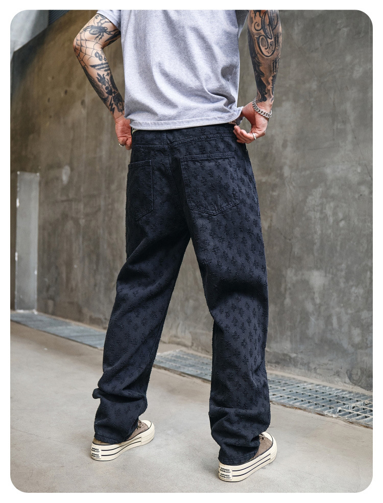 주로 추천하는 모델: 남성용 고급 올오버 프린트 자카드 데님 팬츠, 미국 스타일 트렌디 브랜드, 고급스러운 레트로 스트레이트 캐주얼 팬츠.스토어 가기