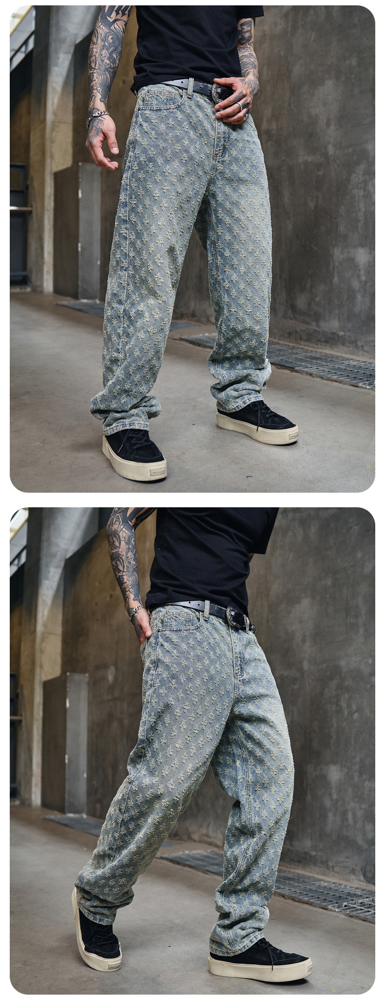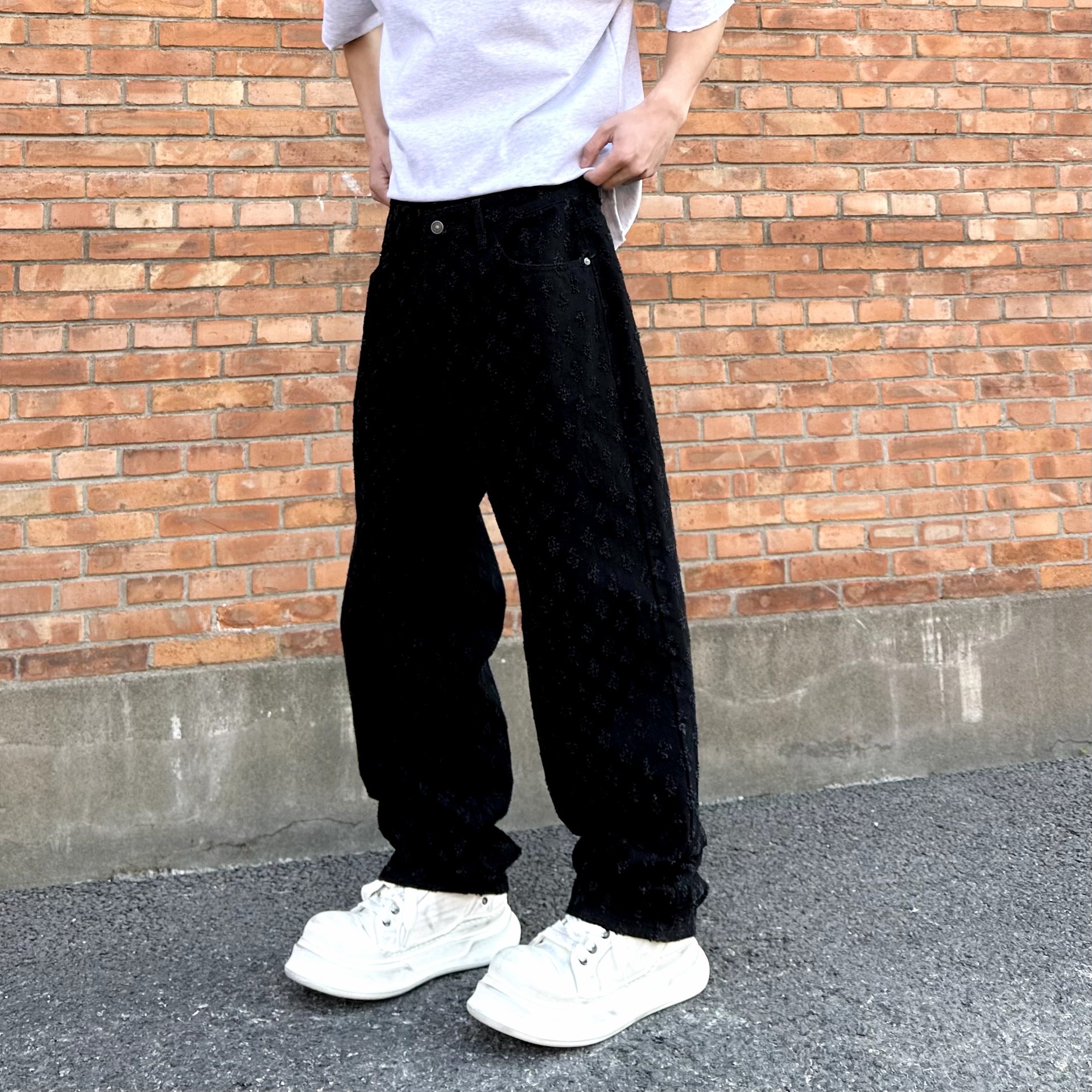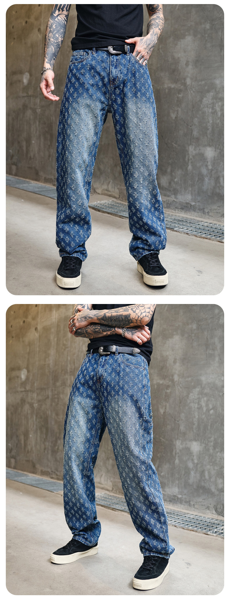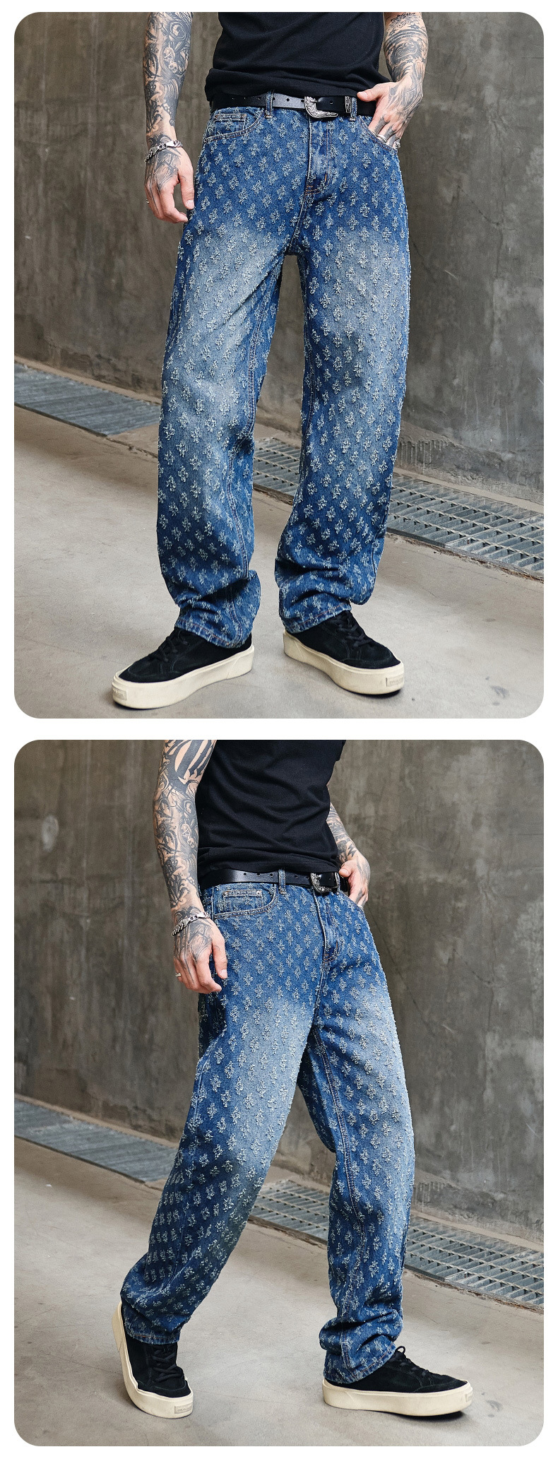 주로 추천하는 모델: 남성용 고급 올오버 프린트 자카드 데님 팬츠, 미국 스타일 트렌디 브랜드, 고급스러운 레트로 스트레이트 캐주얼 팬츠.스토어 가기