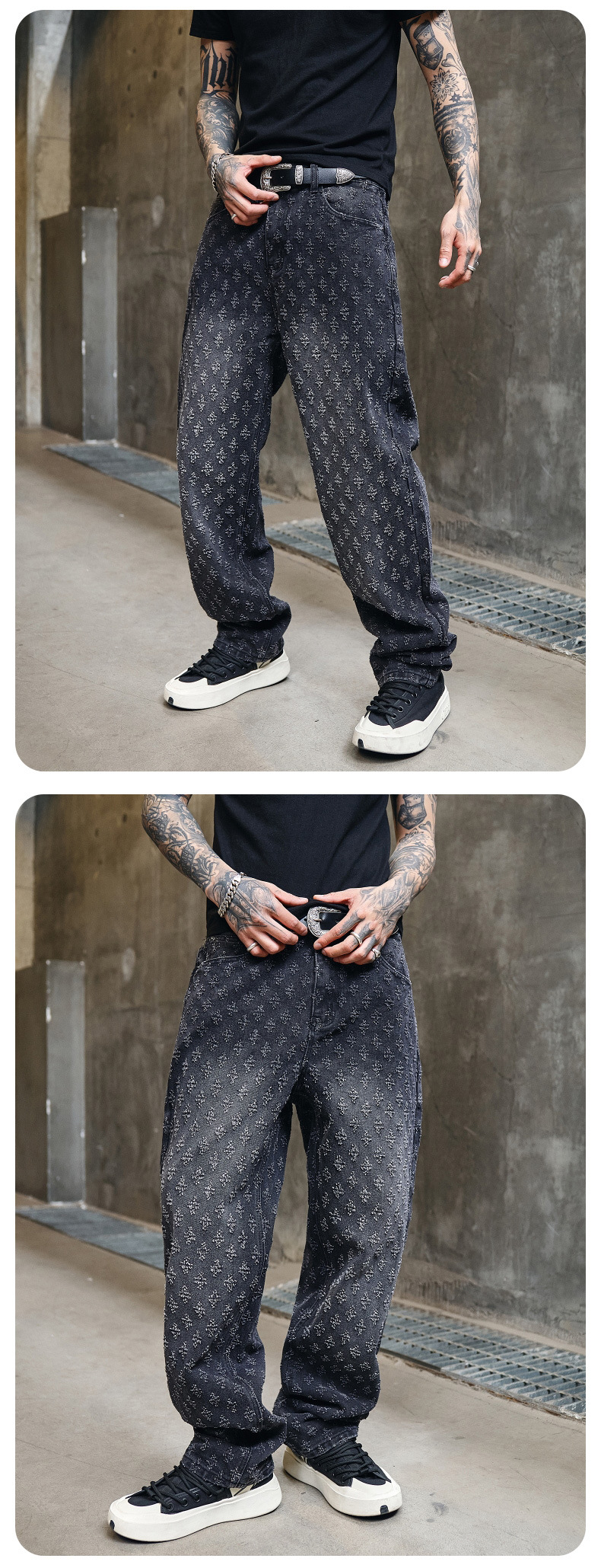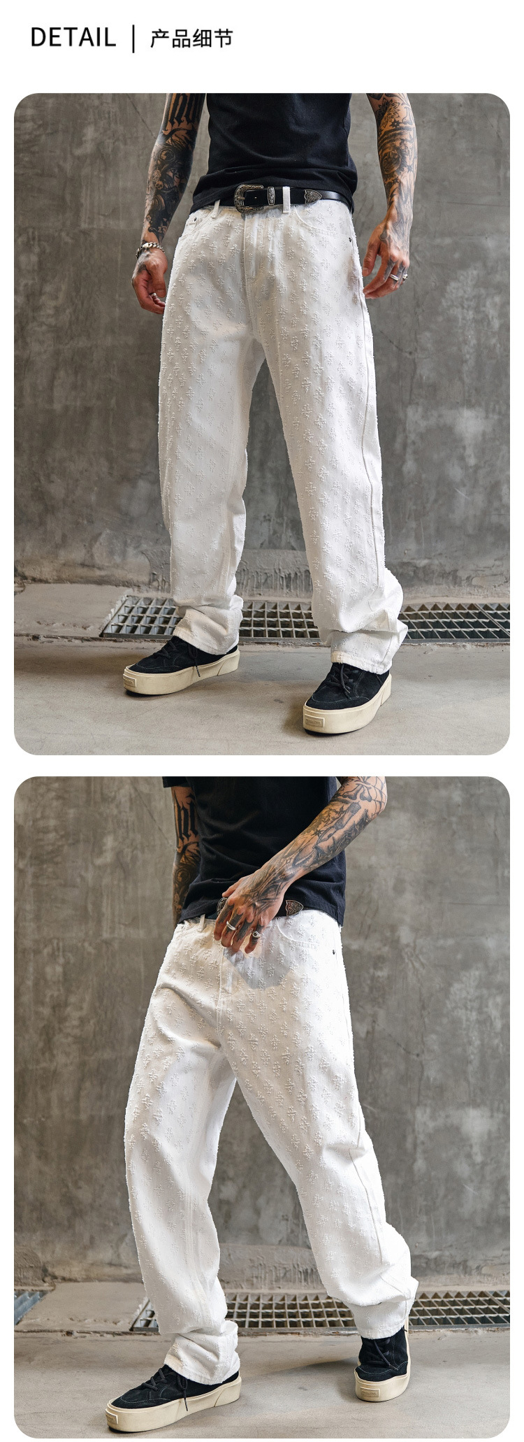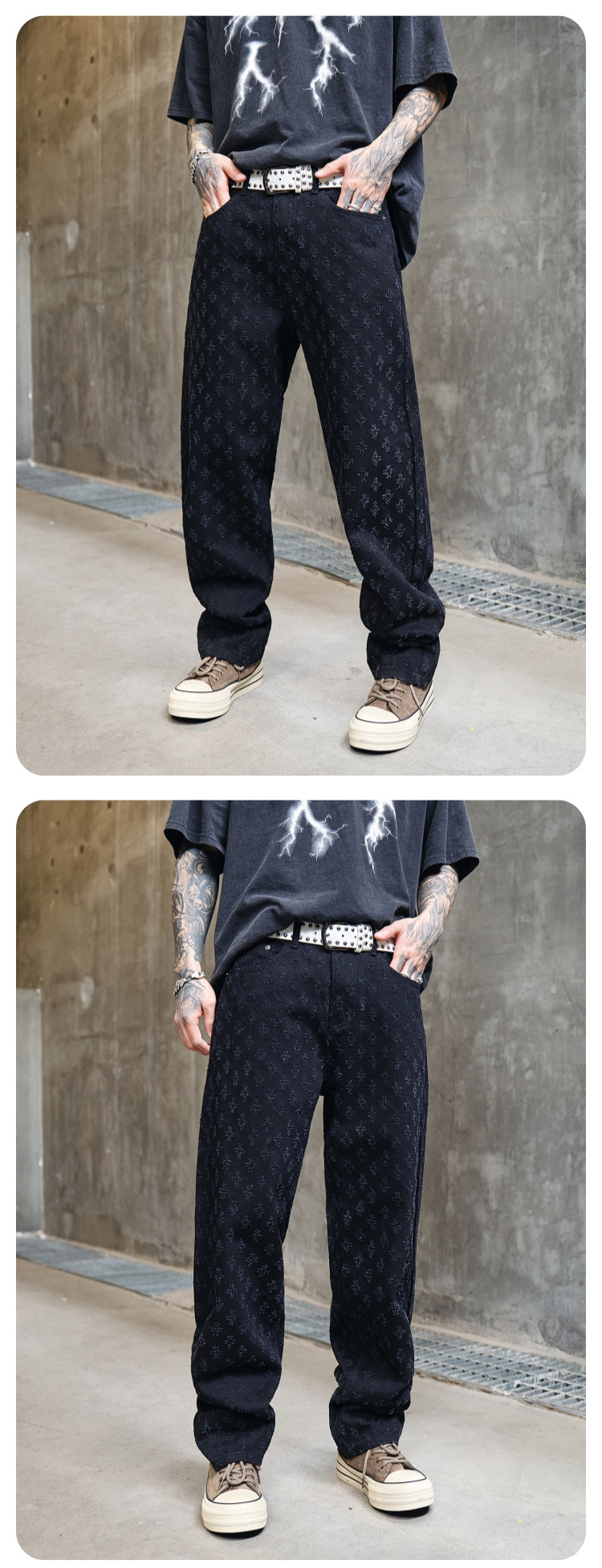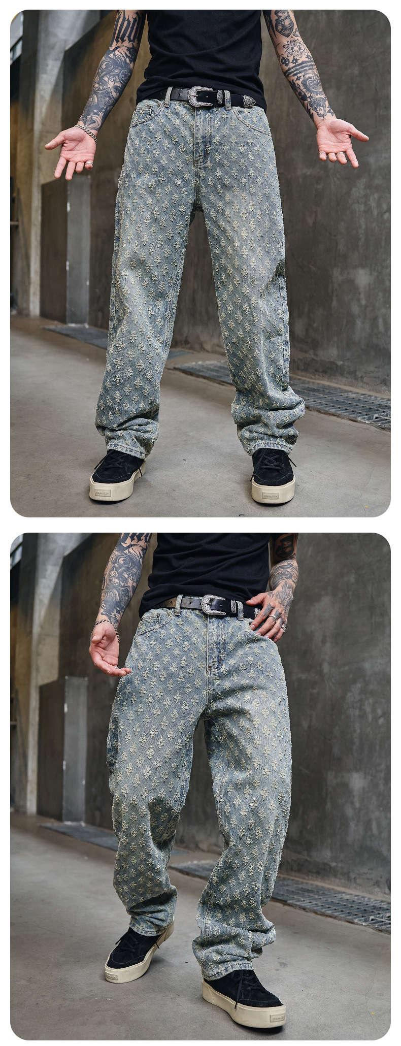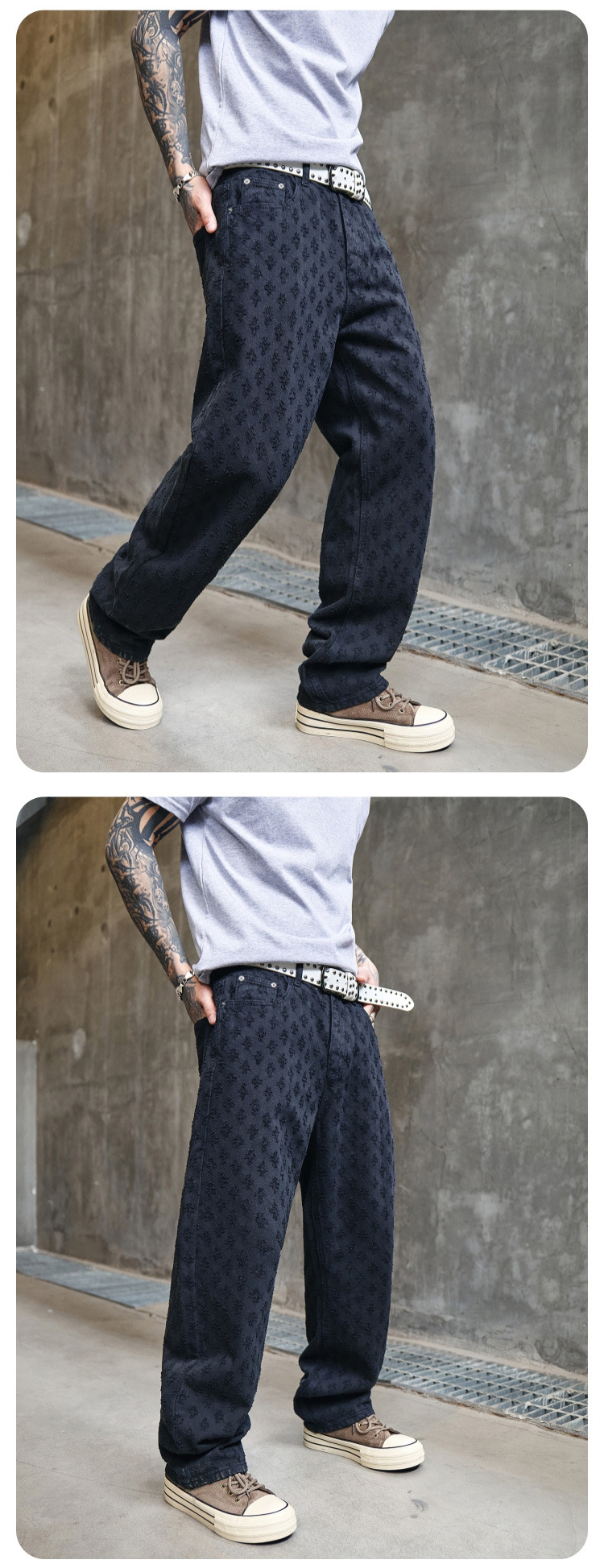 주로 추천하는 모델: 남성용 고급 올오버 프린트 자카드 데님 팬츠, 미국 스타일 트렌디 브랜드, 고급스러운 레트로 스트레이트 캐주얼 팬츠.스토어 가기