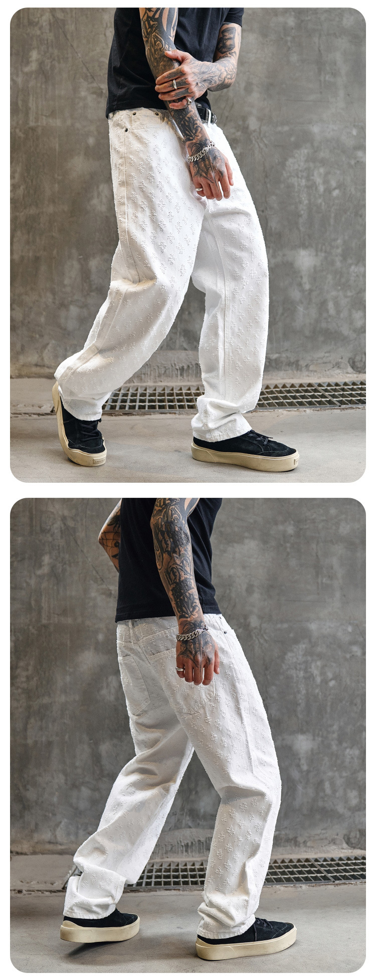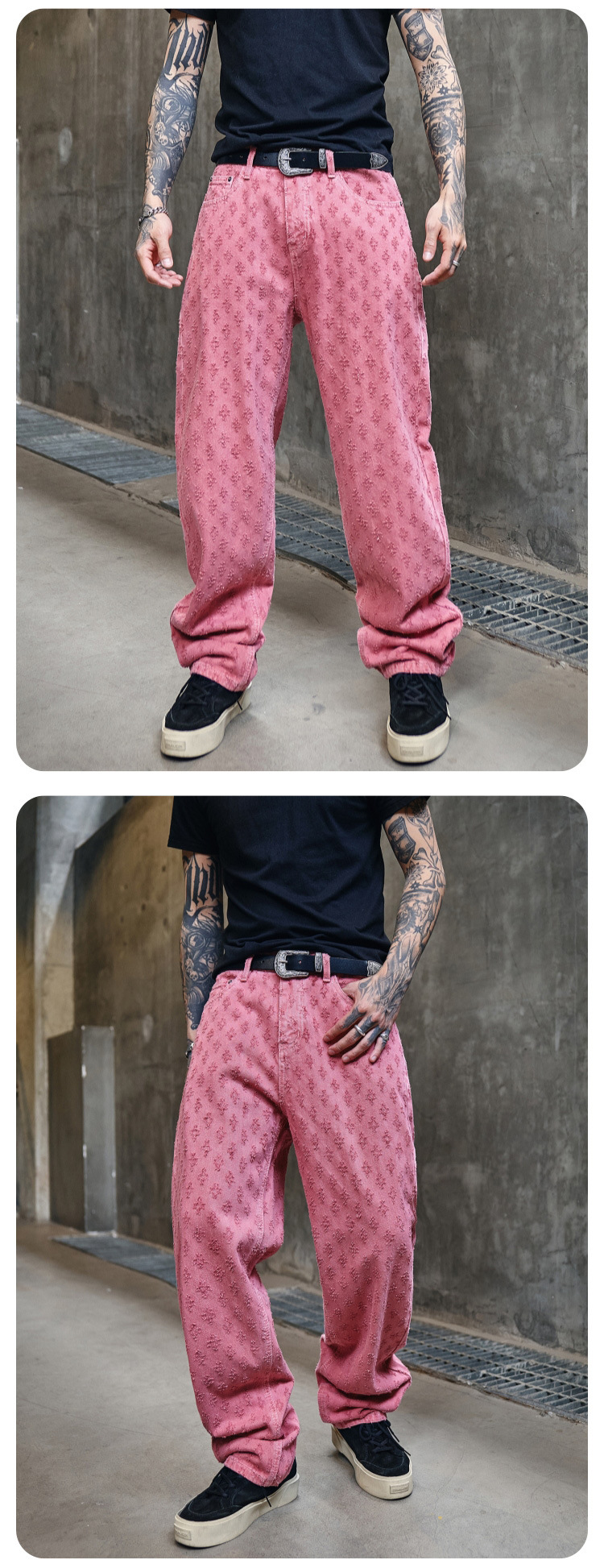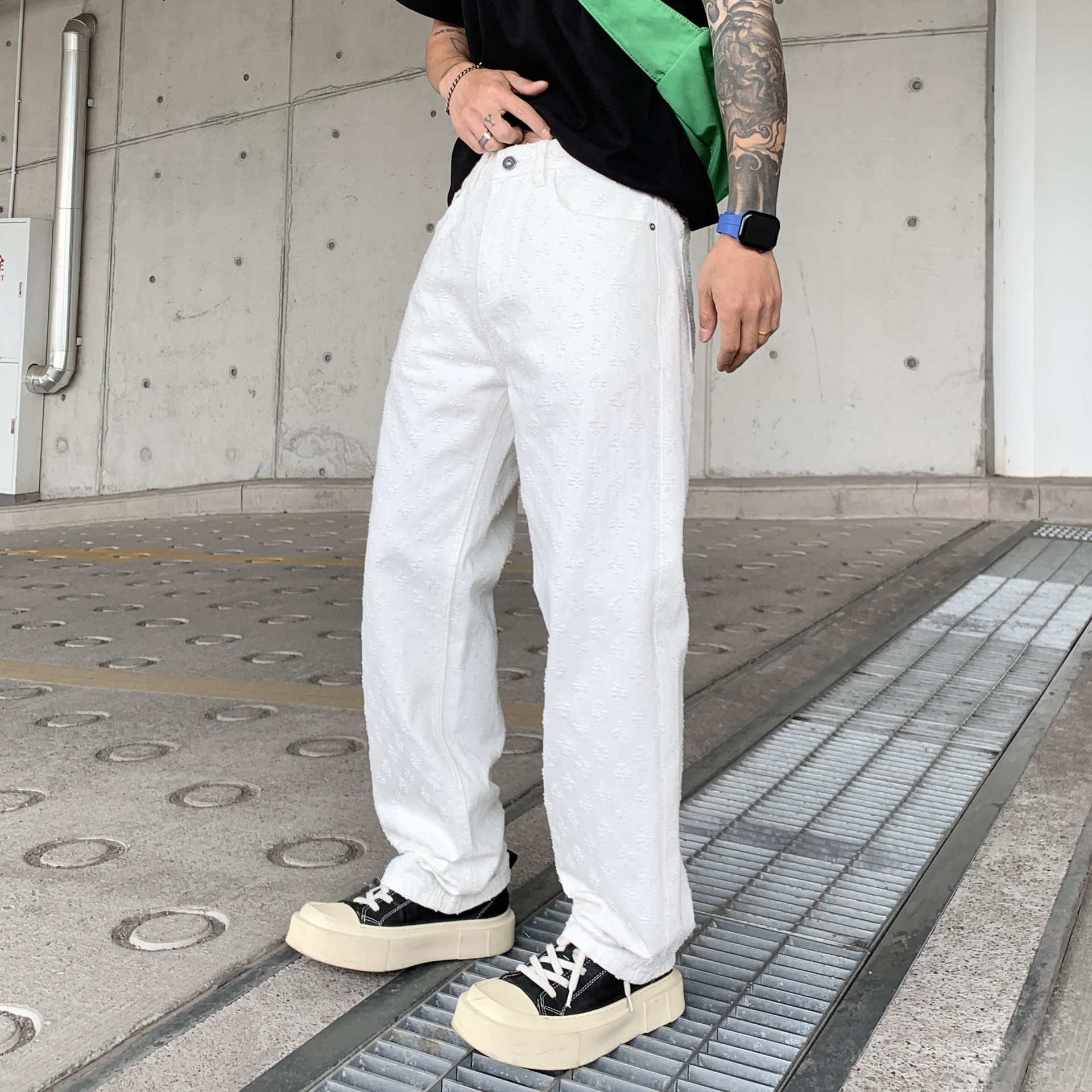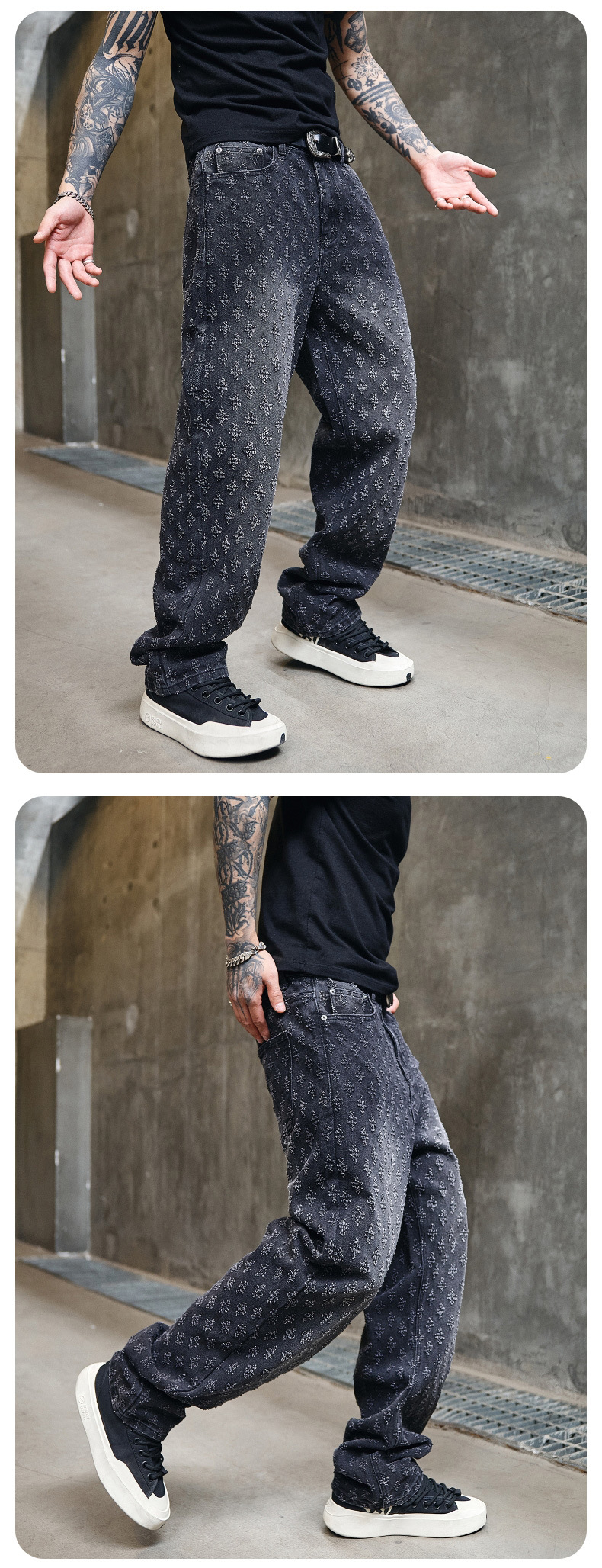 주로 추천하는 모델: 남성용 고급 올오버 프린트 자카드 데님 팬츠, 미국 스타일 트렌디 브랜드, 고급스러운 레트로 스트레이트 캐주얼 팬츠.스토어 가기