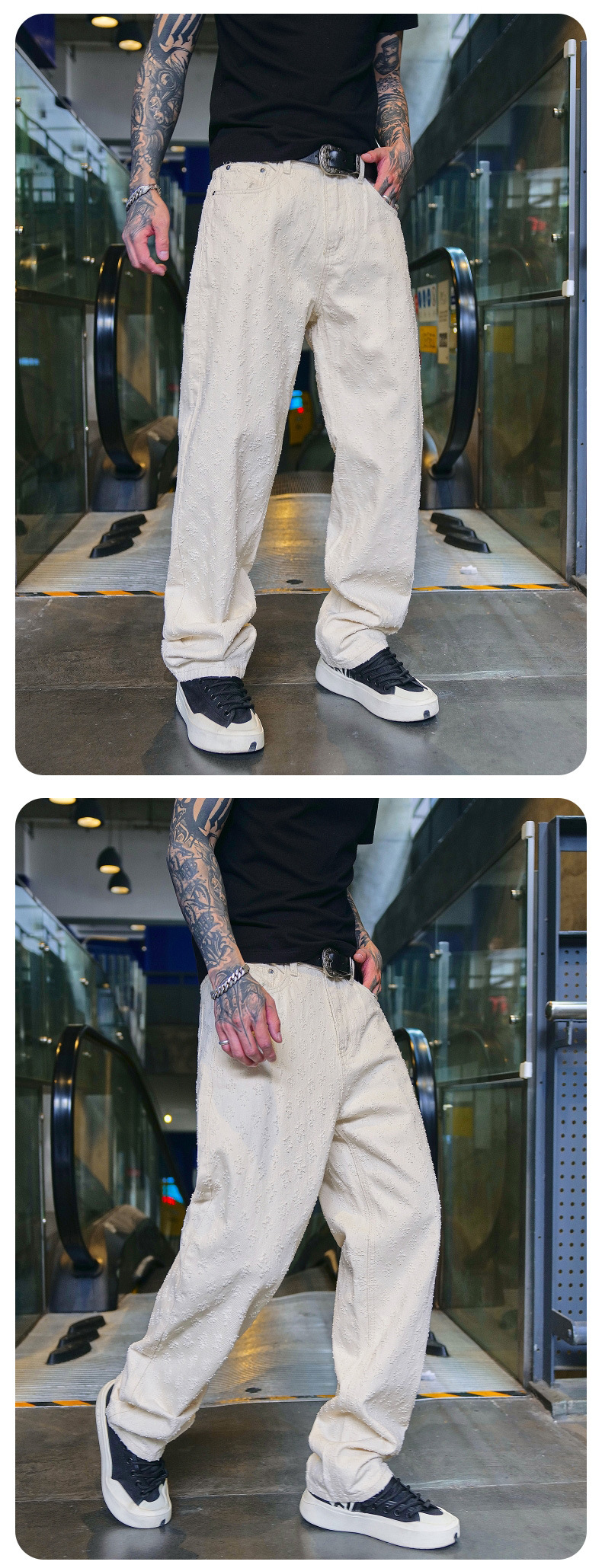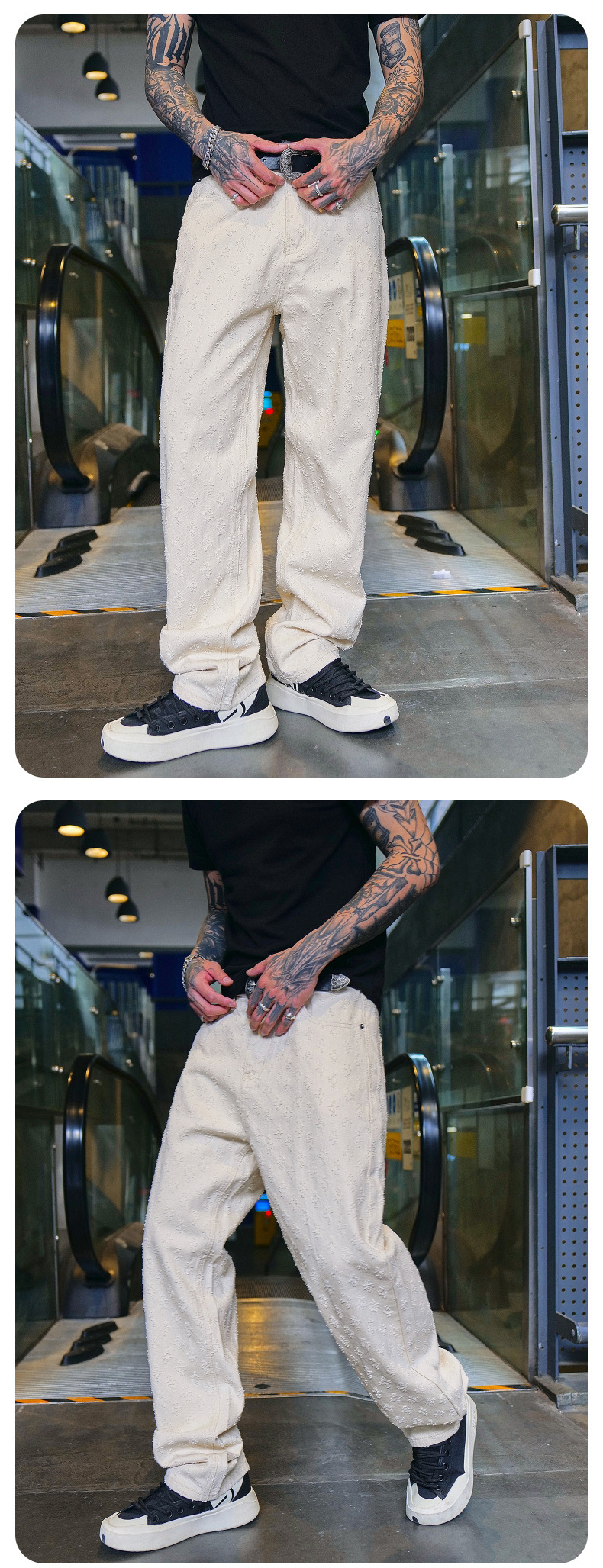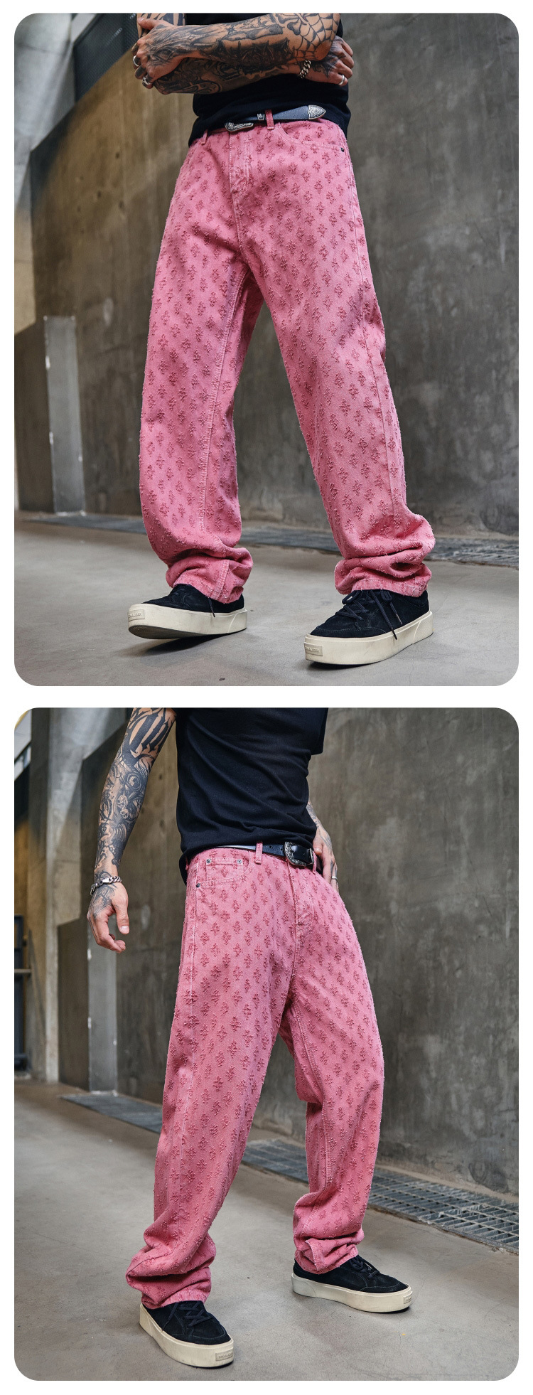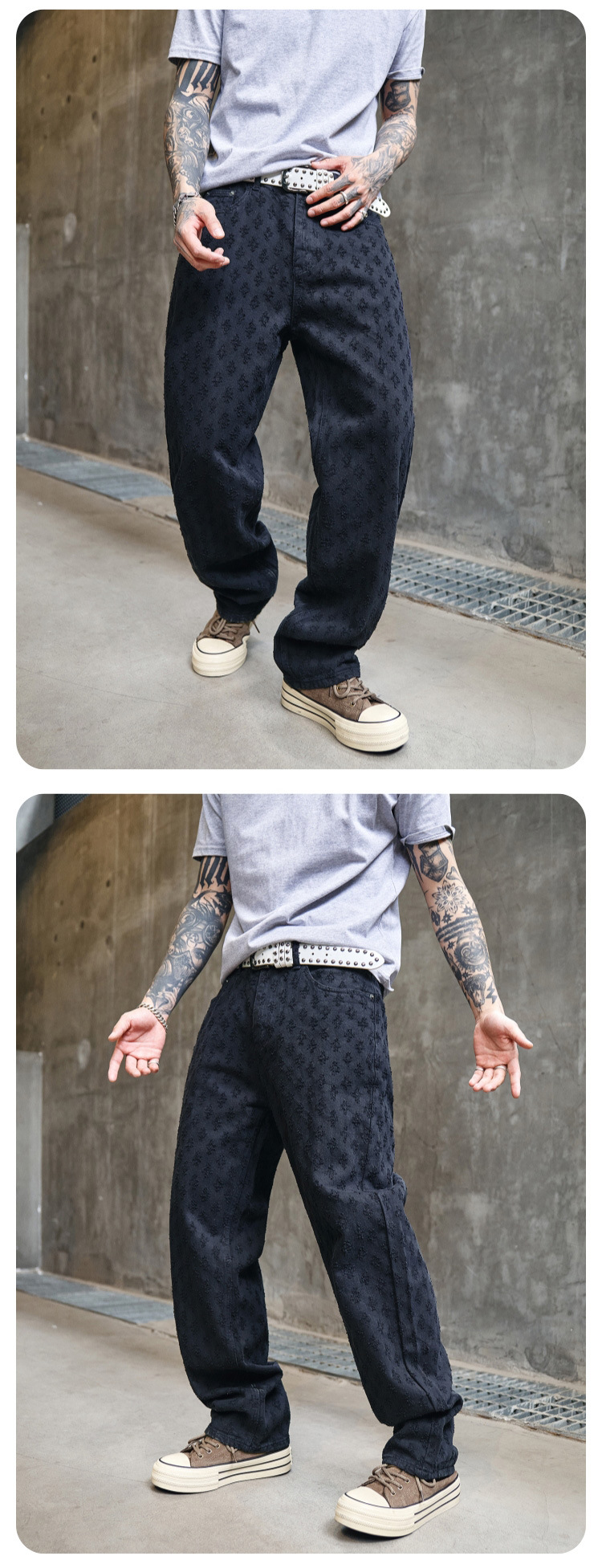 주로 추천하는 모델: 남성용 고급 올오버 프린트 자카드 데님 팬츠, 미국 스타일 트렌디 브랜드, 고급스러운 레트로 스트레이트 캐주얼 팬츠.스토어 가기