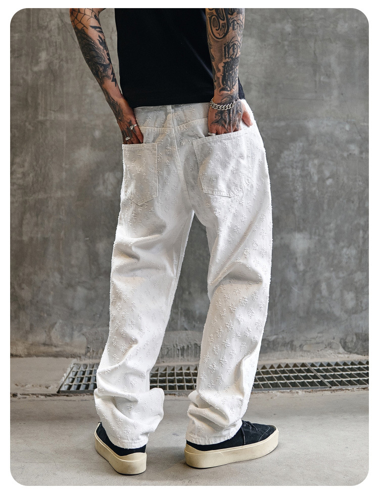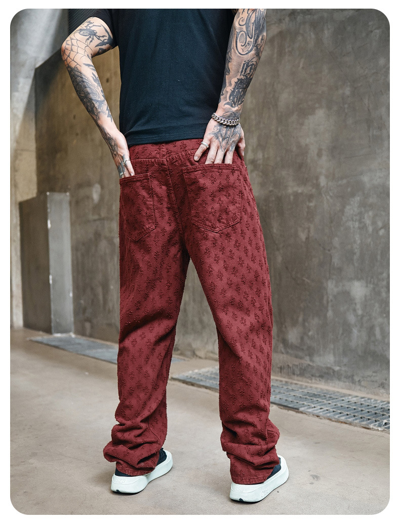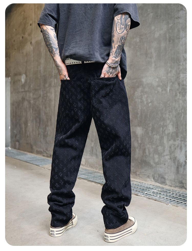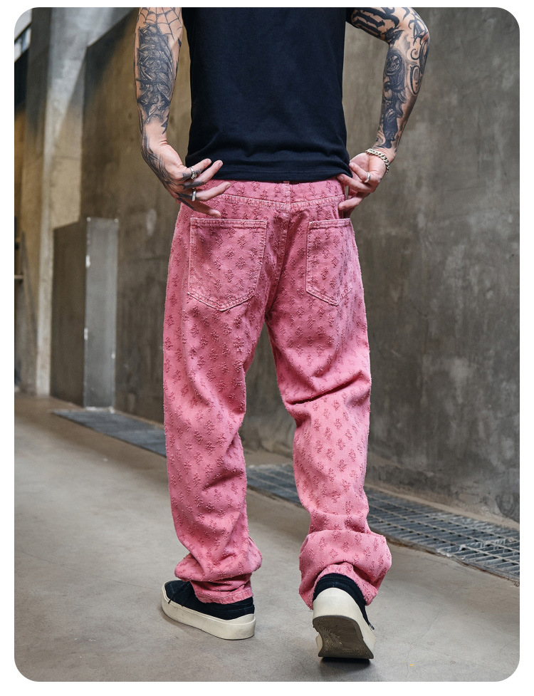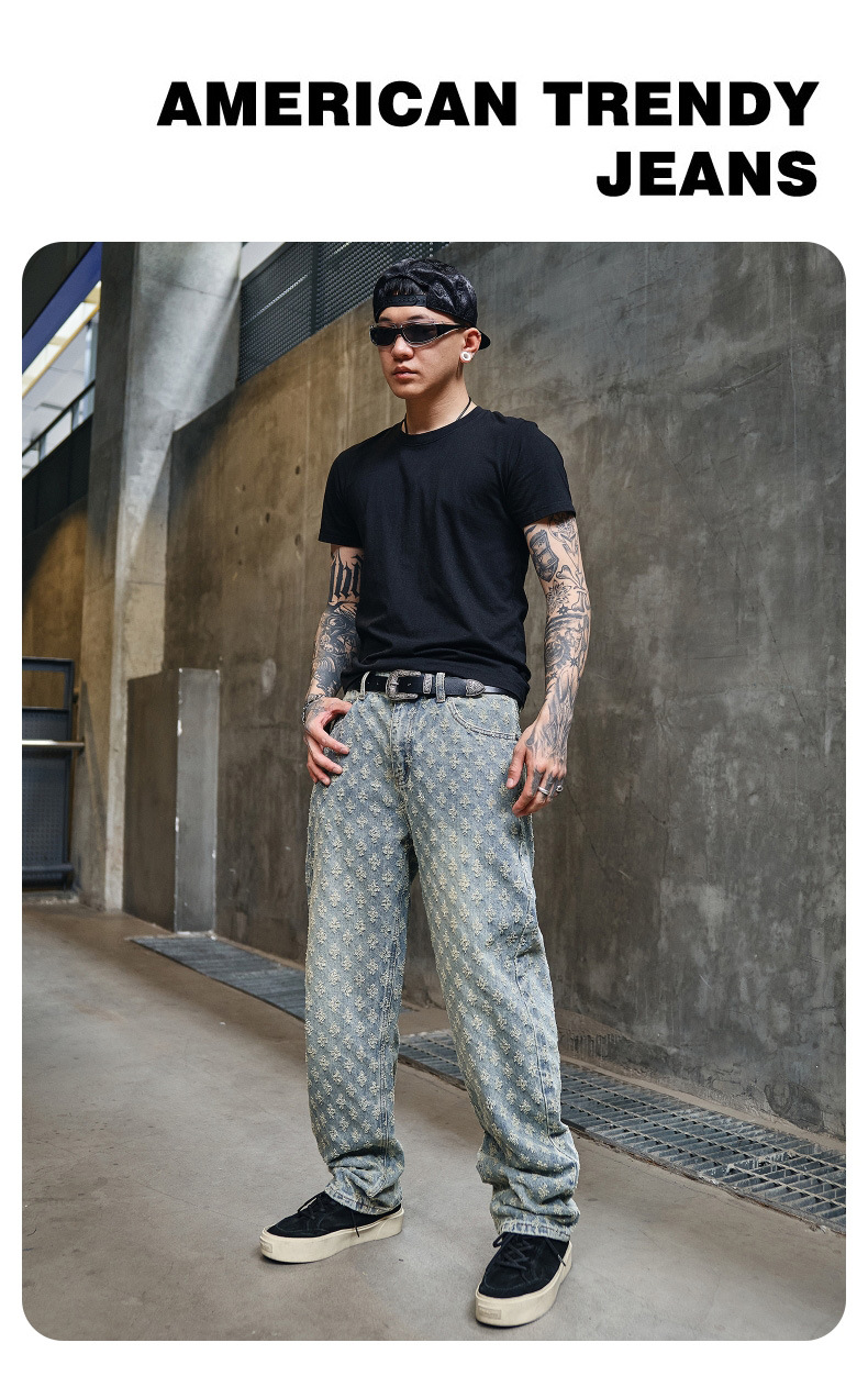 주로 추천하는 모델: 남성용 고급 올오버 프린트 자카드 데님 팬츠, 미국 스타일 트렌디 브랜드, 고급스러운 레트로 스트레이트 캐주얼 팬츠.
