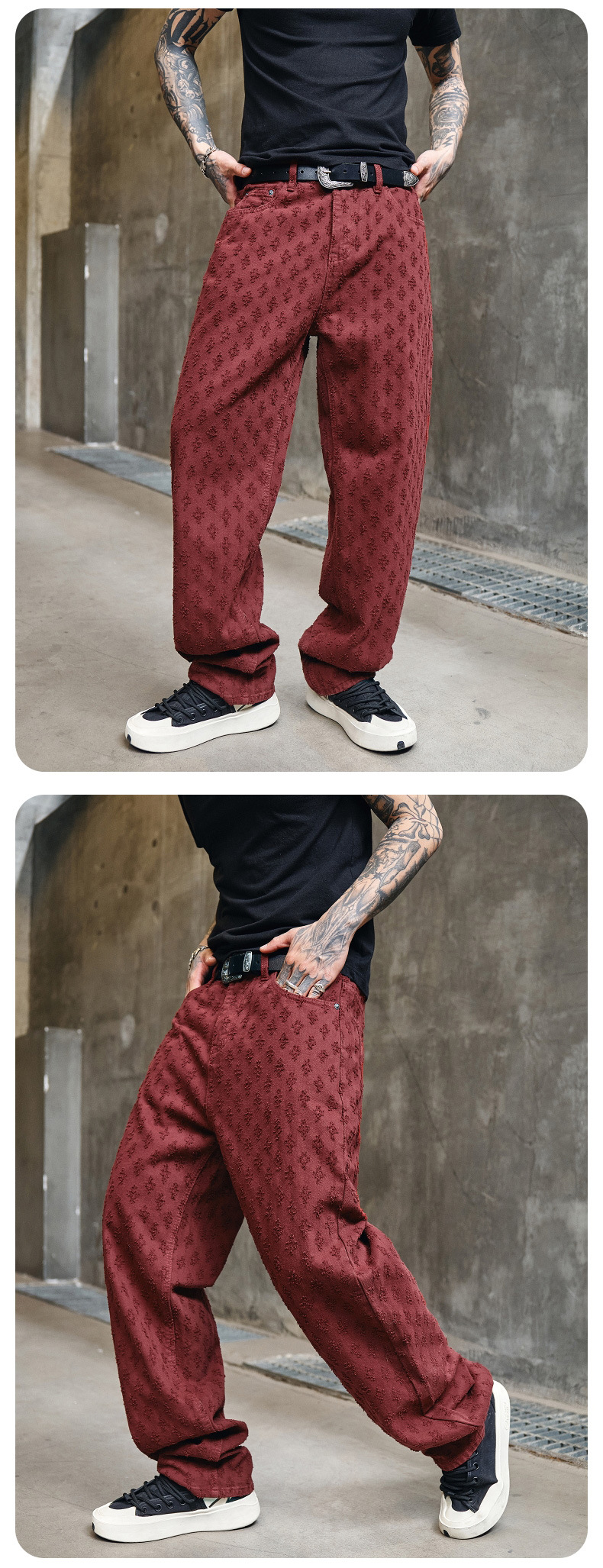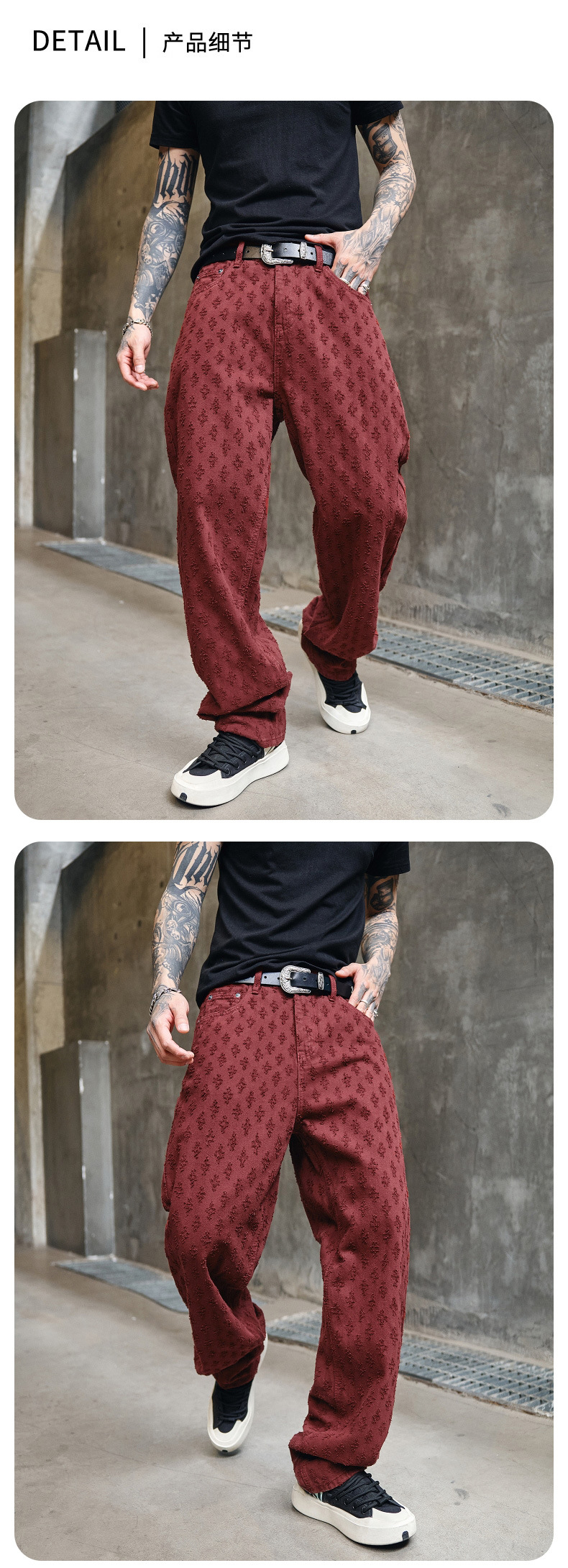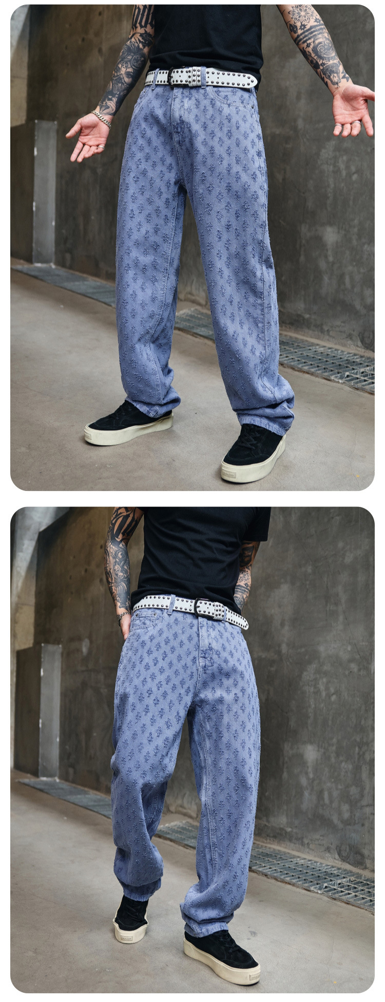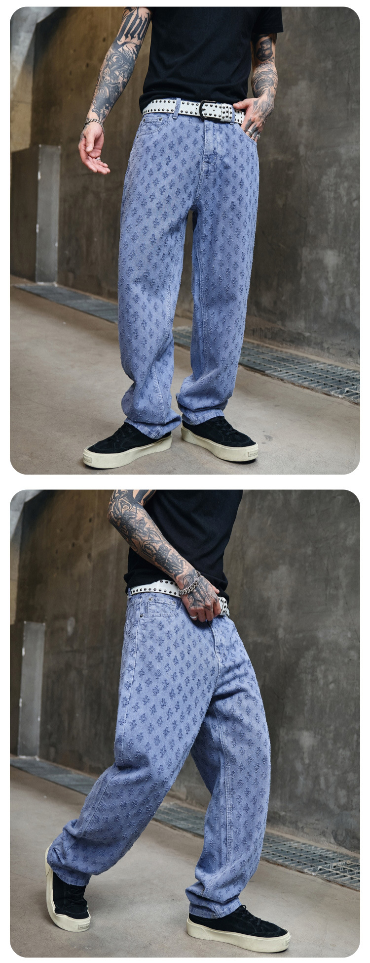 주로 추천하는 모델: 남성용 고급 올오버 프린트 자카드 데님 팬츠, 미국 스타일 트렌디 브랜드, 고급스러운 레트로 스트레이트 캐주얼 팬츠.
