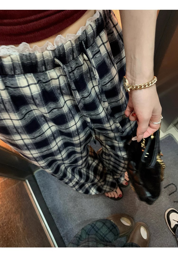 抽皱蕾丝拼接复古垂坠感拖地高腰显瘦格子直筒阔腿裤子女2025春夏