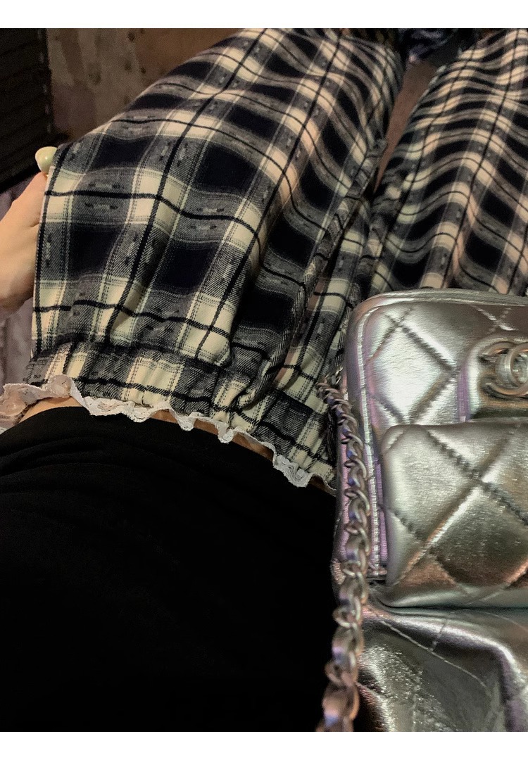 2025 년 봄과 여름 주름 레이스 바느질 레트로 뒤덮인 높은 허리 슬리밍 격자 직선 다리 바지스토어 가기