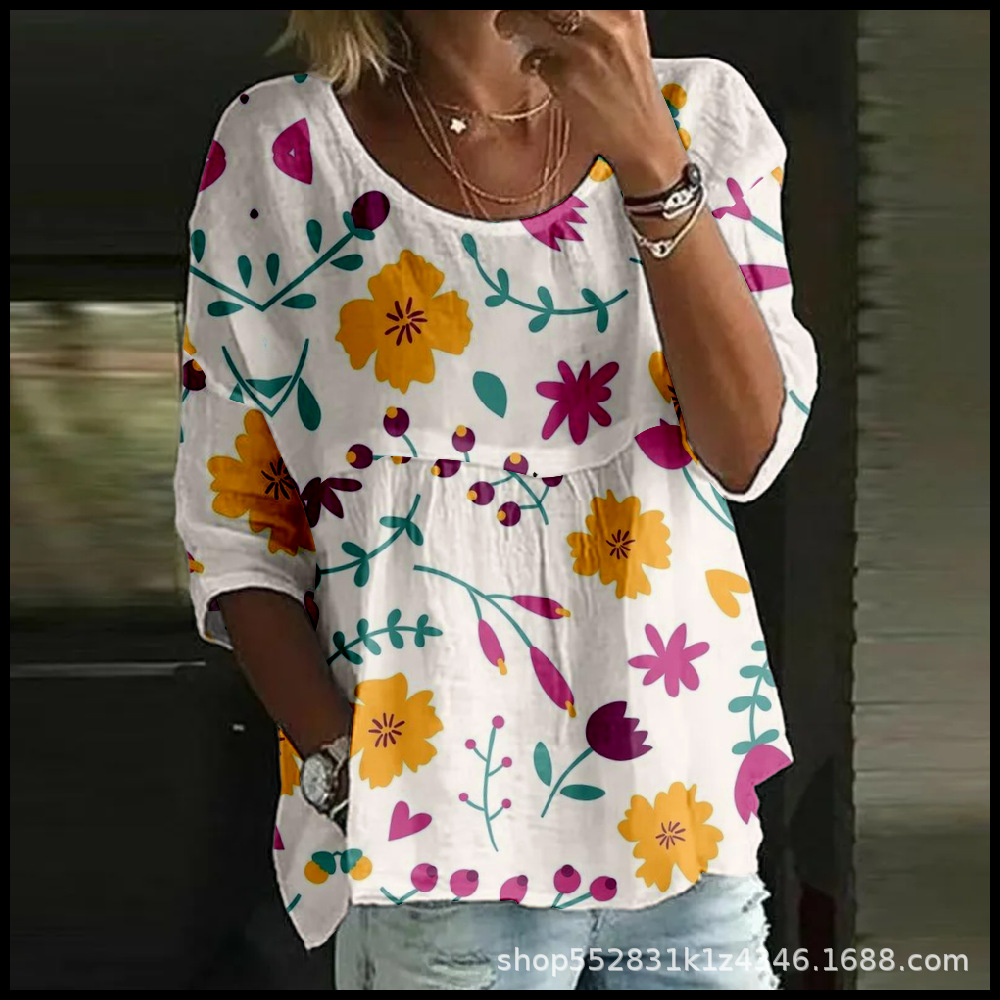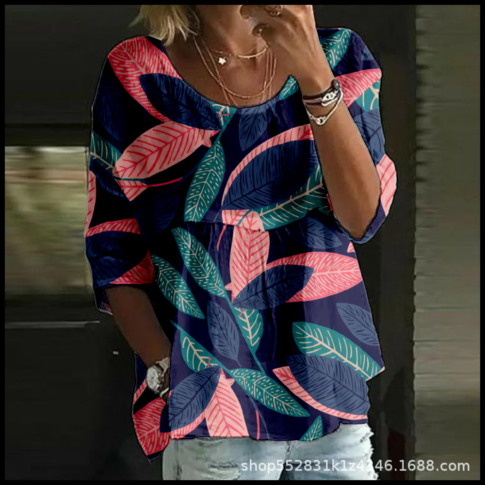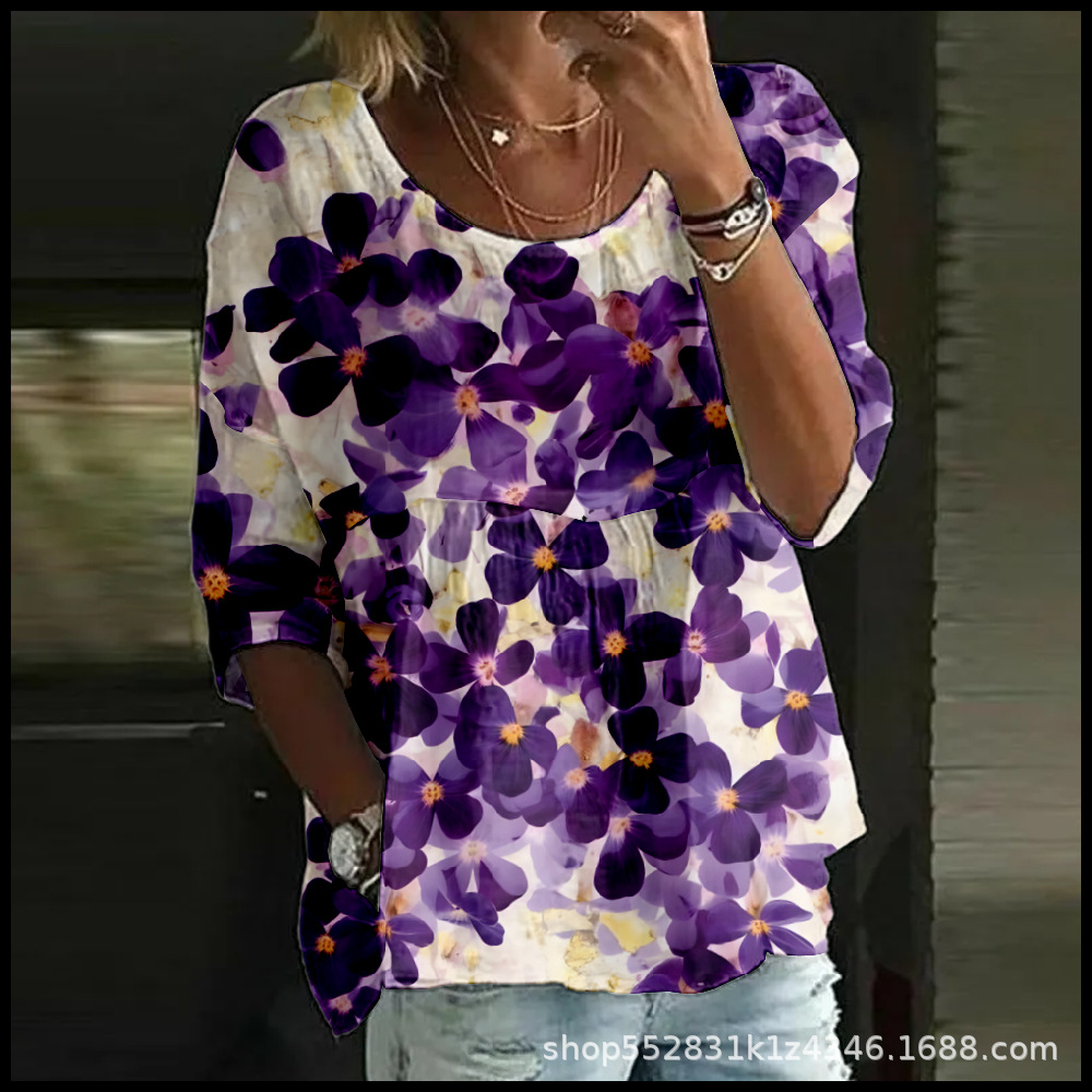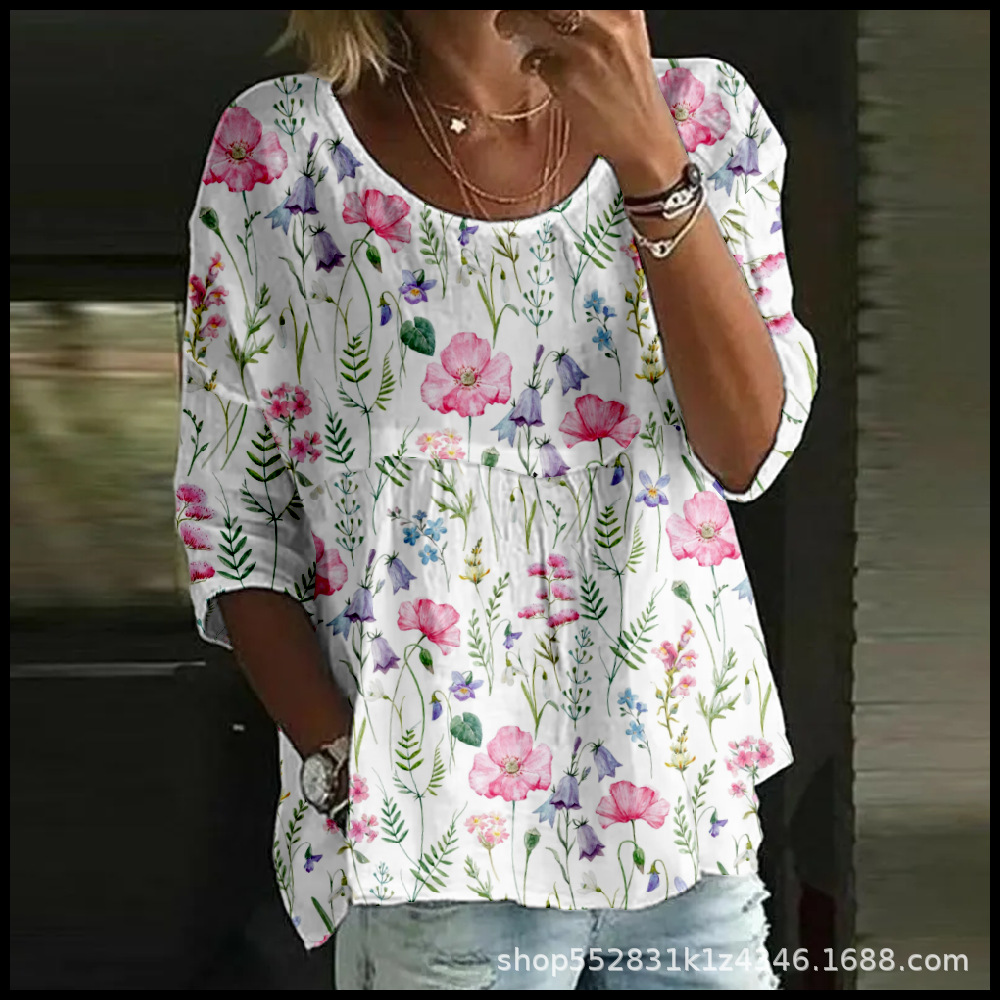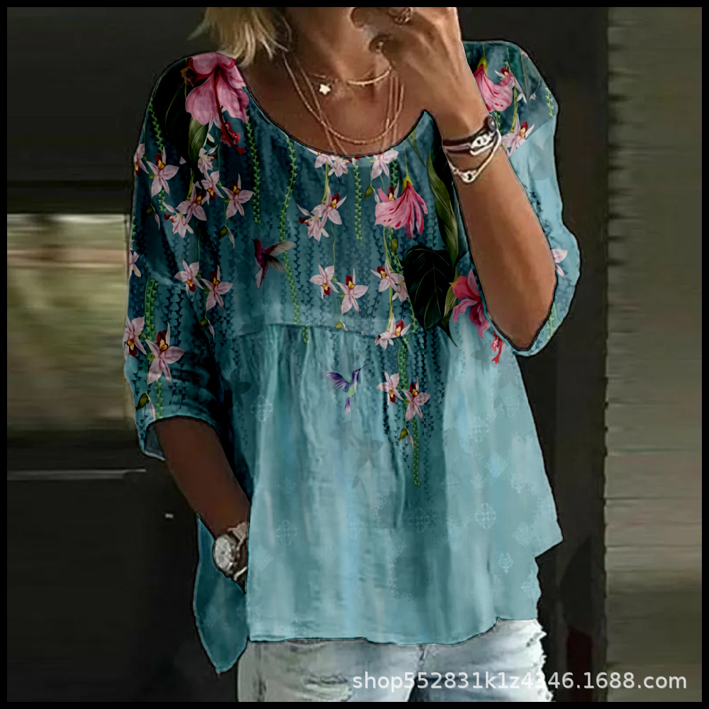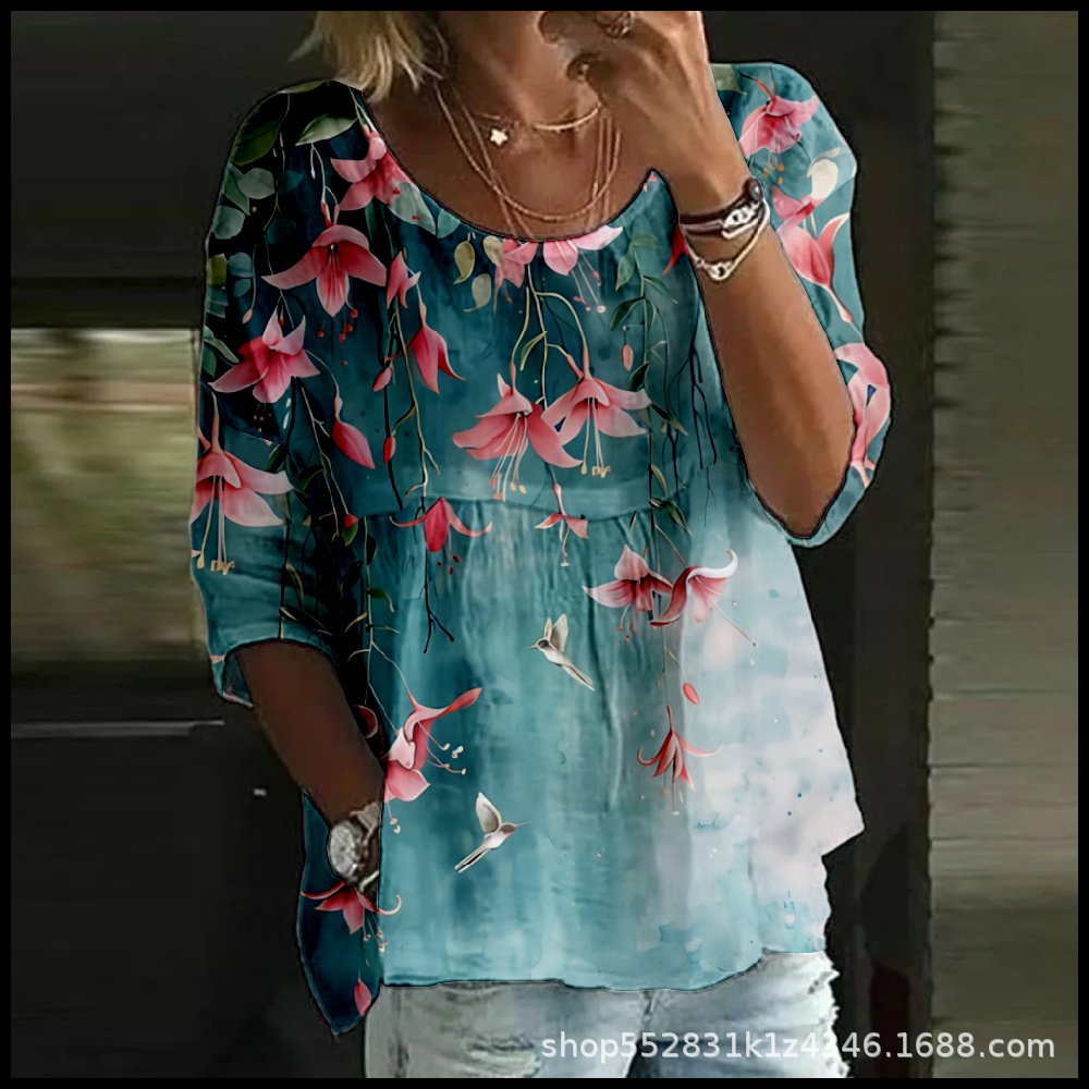 2025 크로스보더 독립 스테이션 여성 티셔츠 캐주얼 스파이더 배트 디지털 프린트 미드 슬리브 플리츠 라운드 넥 탑 2스토어 가기