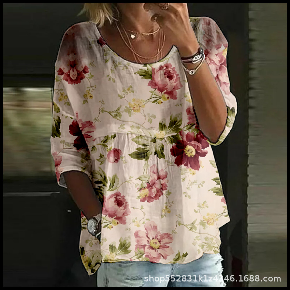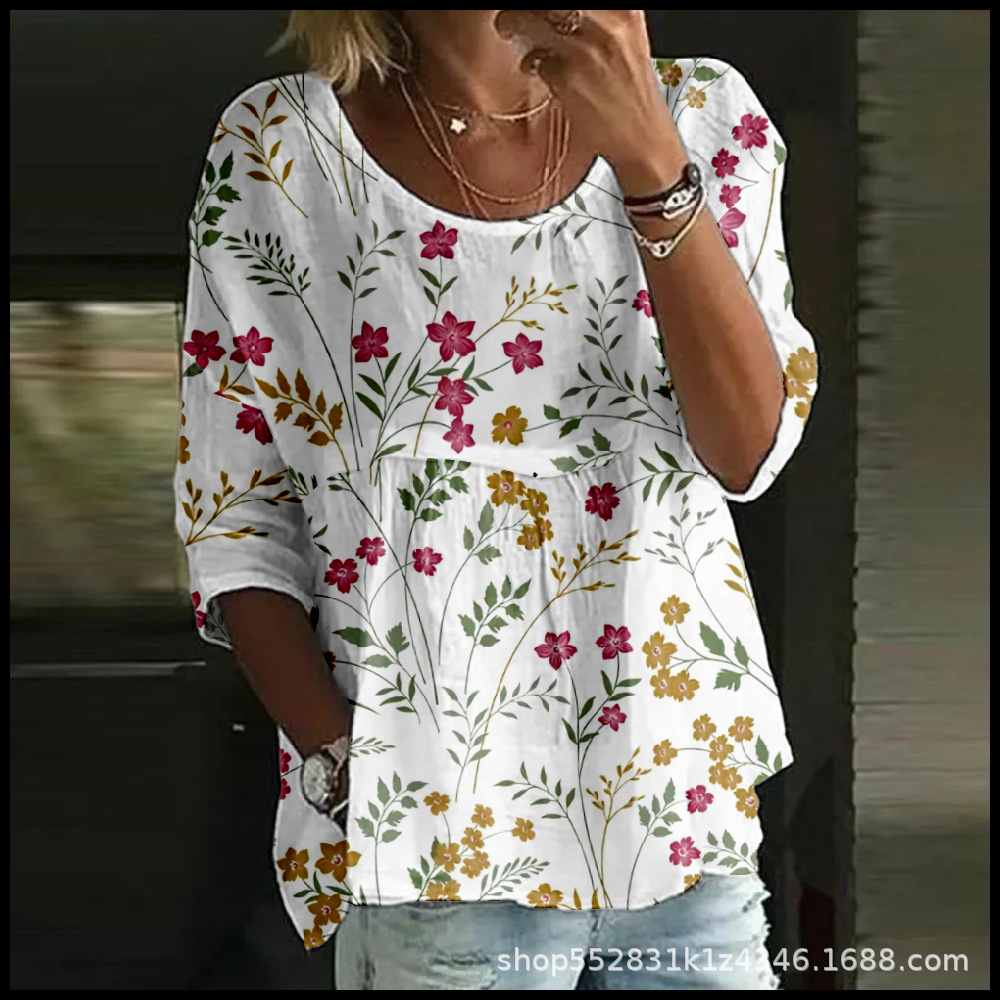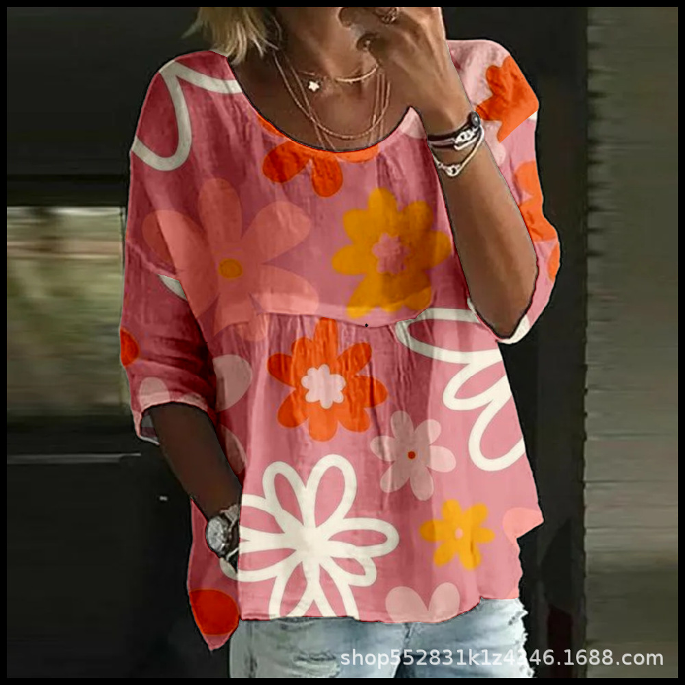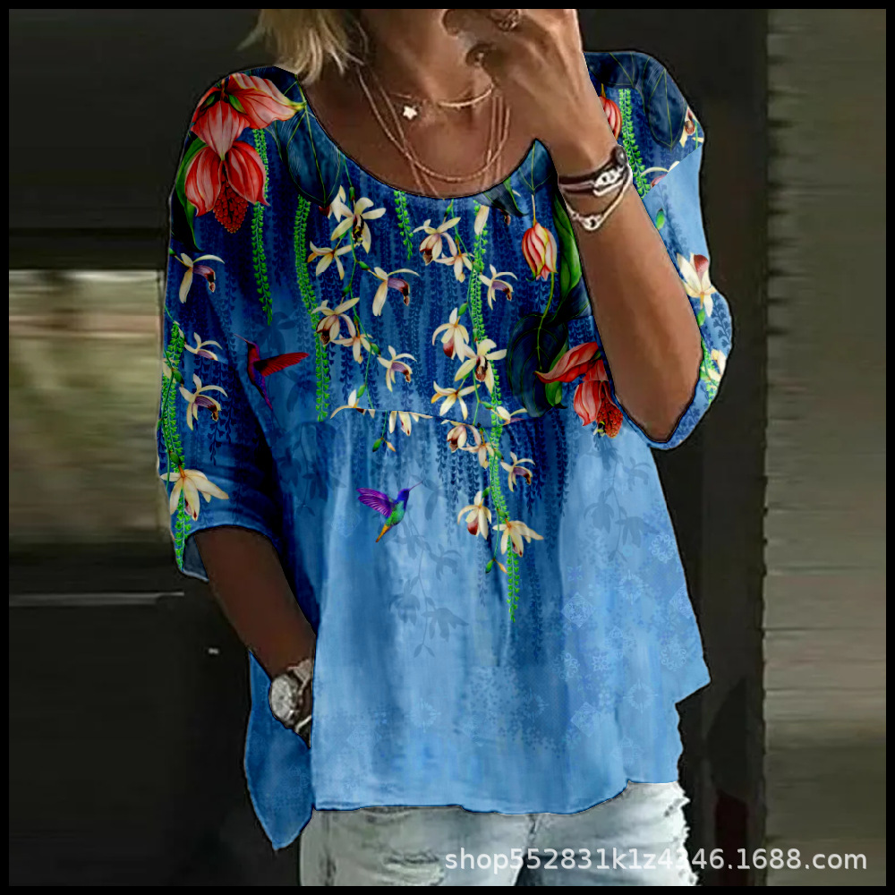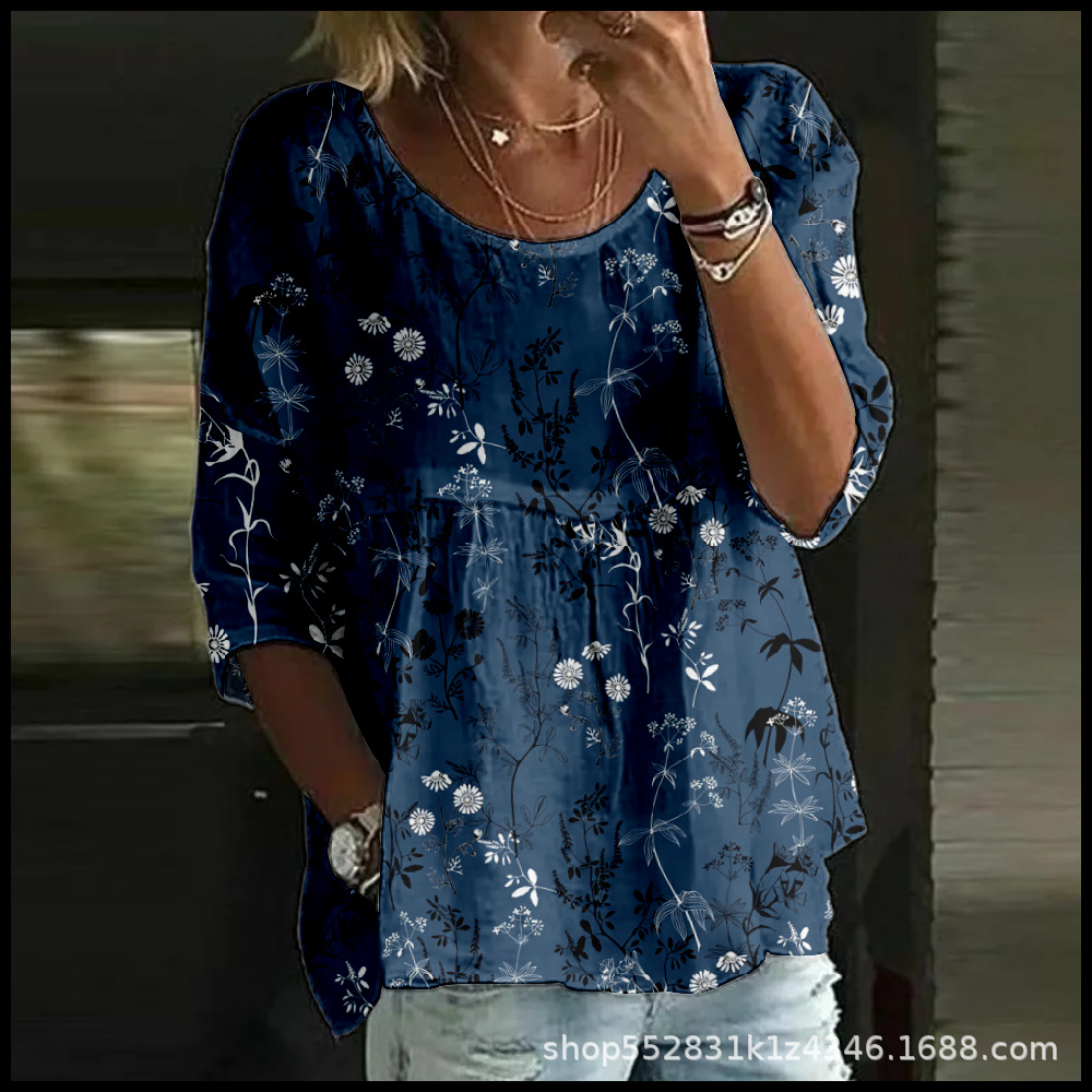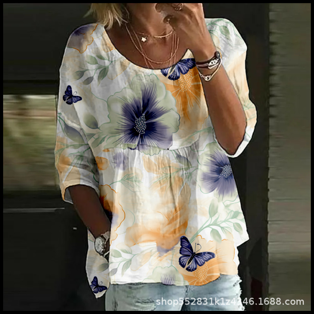 2025 크로스보더 독립 스테이션 여성 티셔츠 캐주얼 스파이더 배트 디지털 프린트 미드 슬리브 플리츠 라운드 넥 탑 2스토어 가기