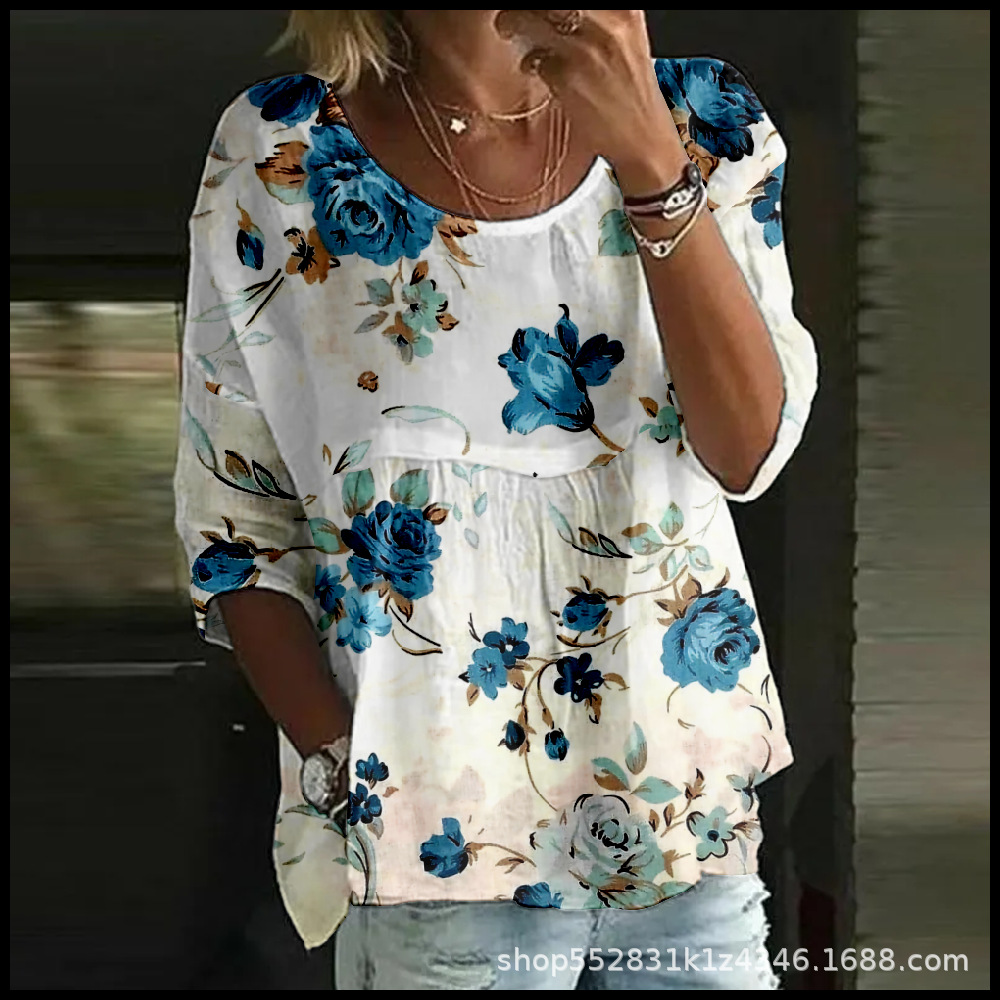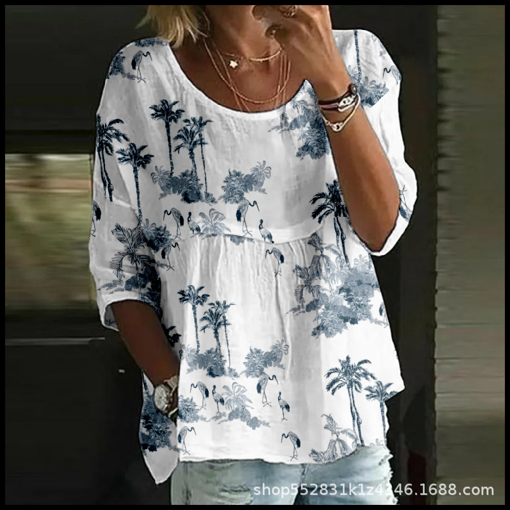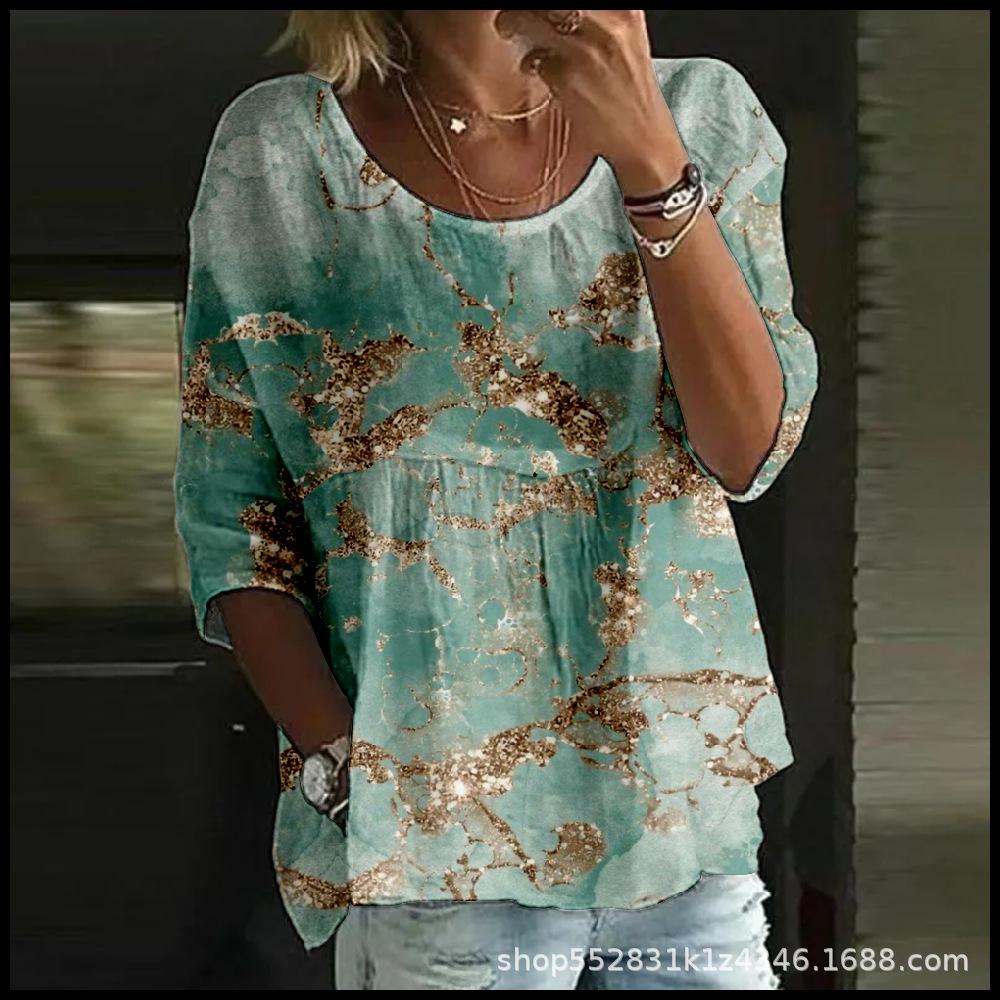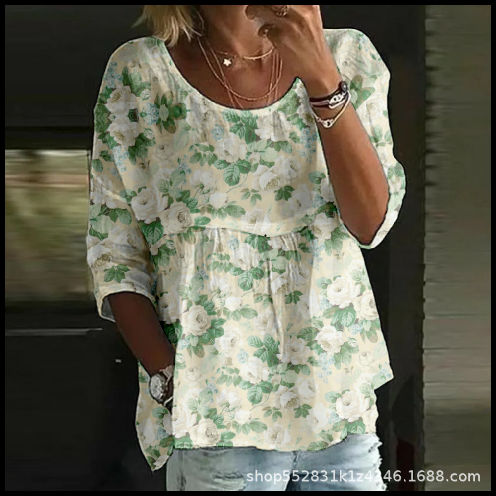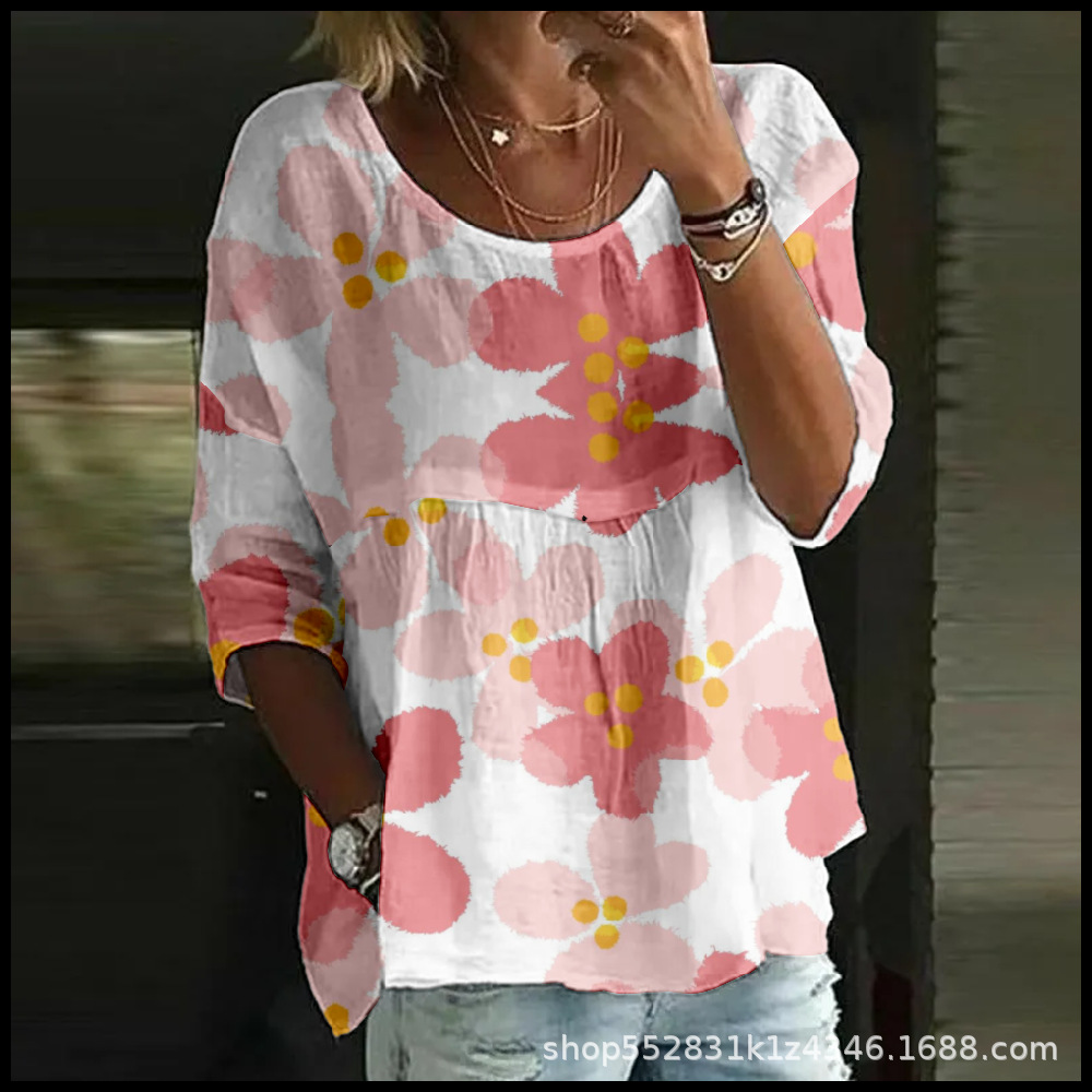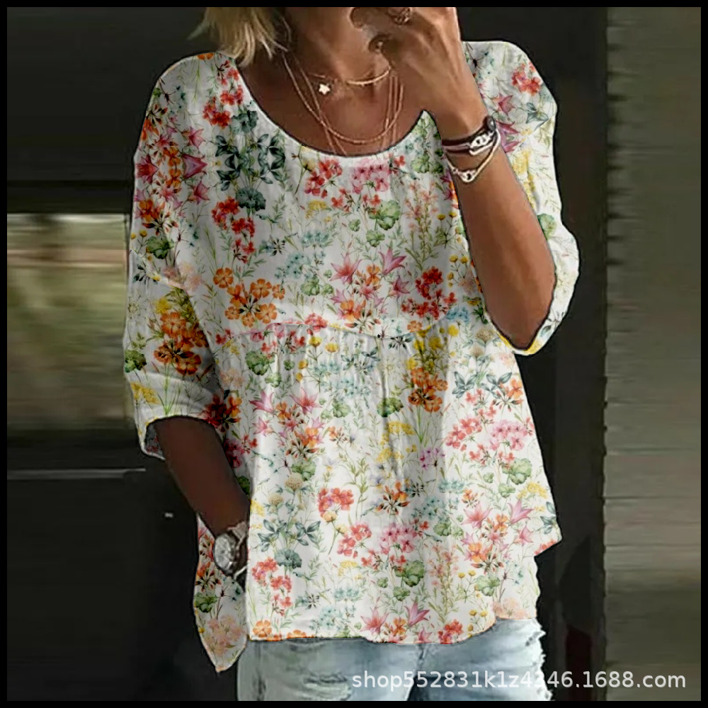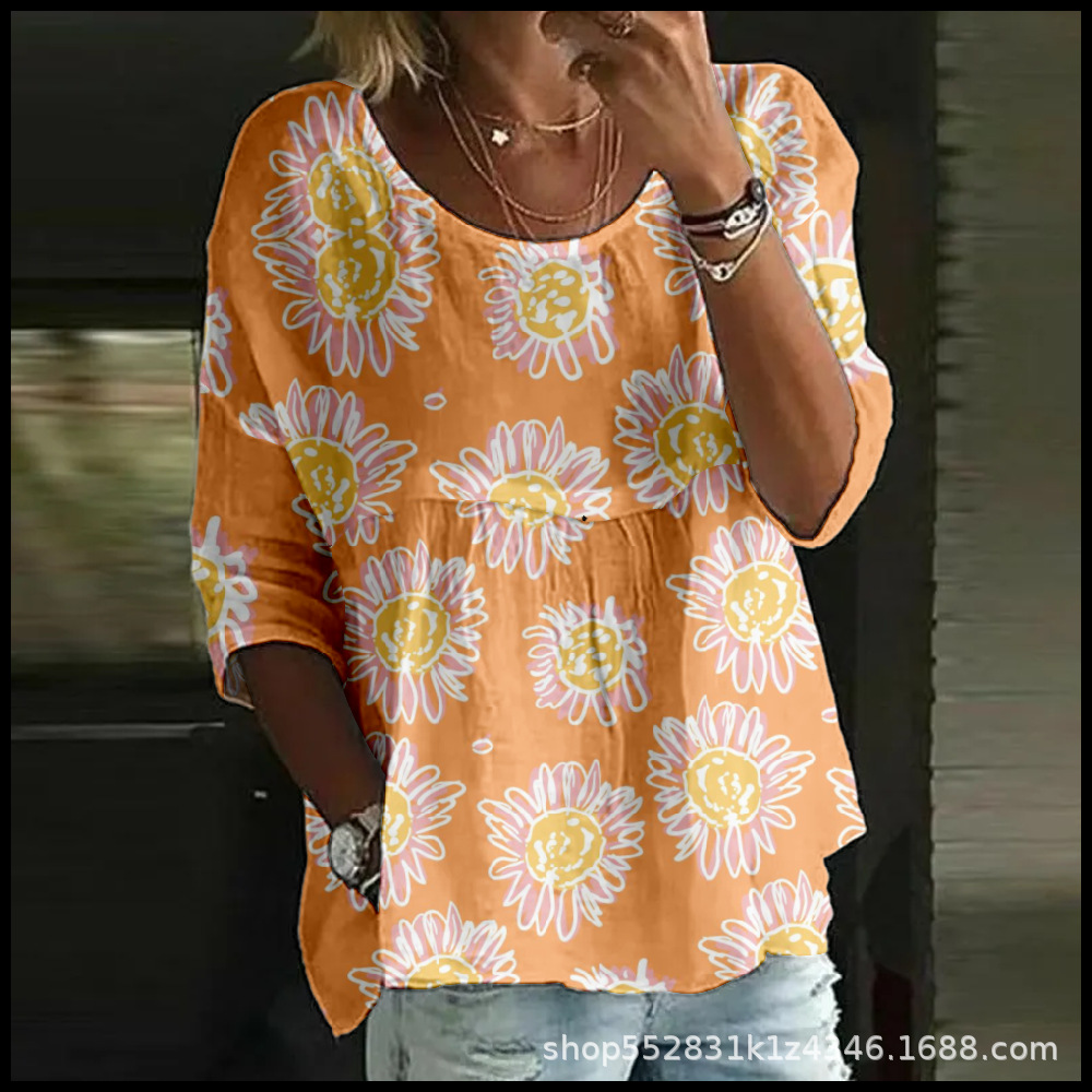 2025 크로스보더 독립 스테이션 여성 티셔츠 캐주얼 스파이더 배트 디지털 프린트 미드 슬리브 플리츠 라운드 넥 탑 2스토어 가기