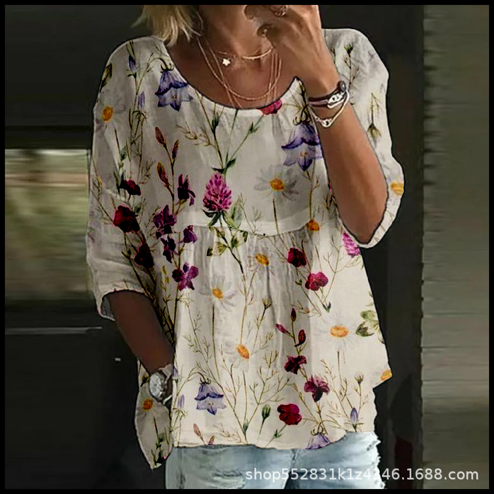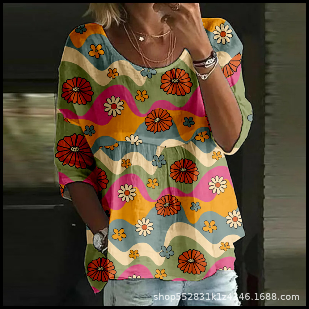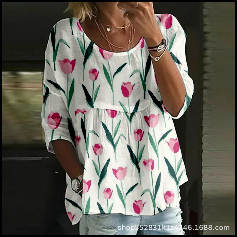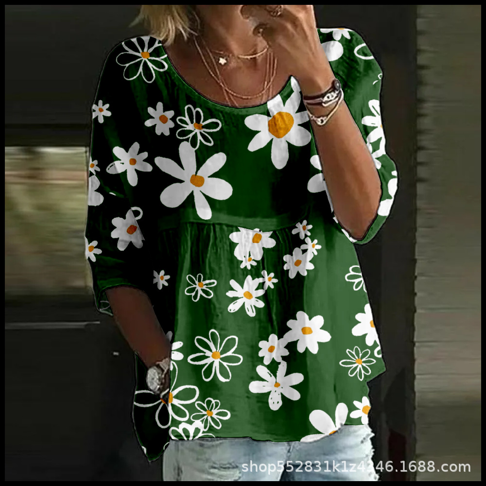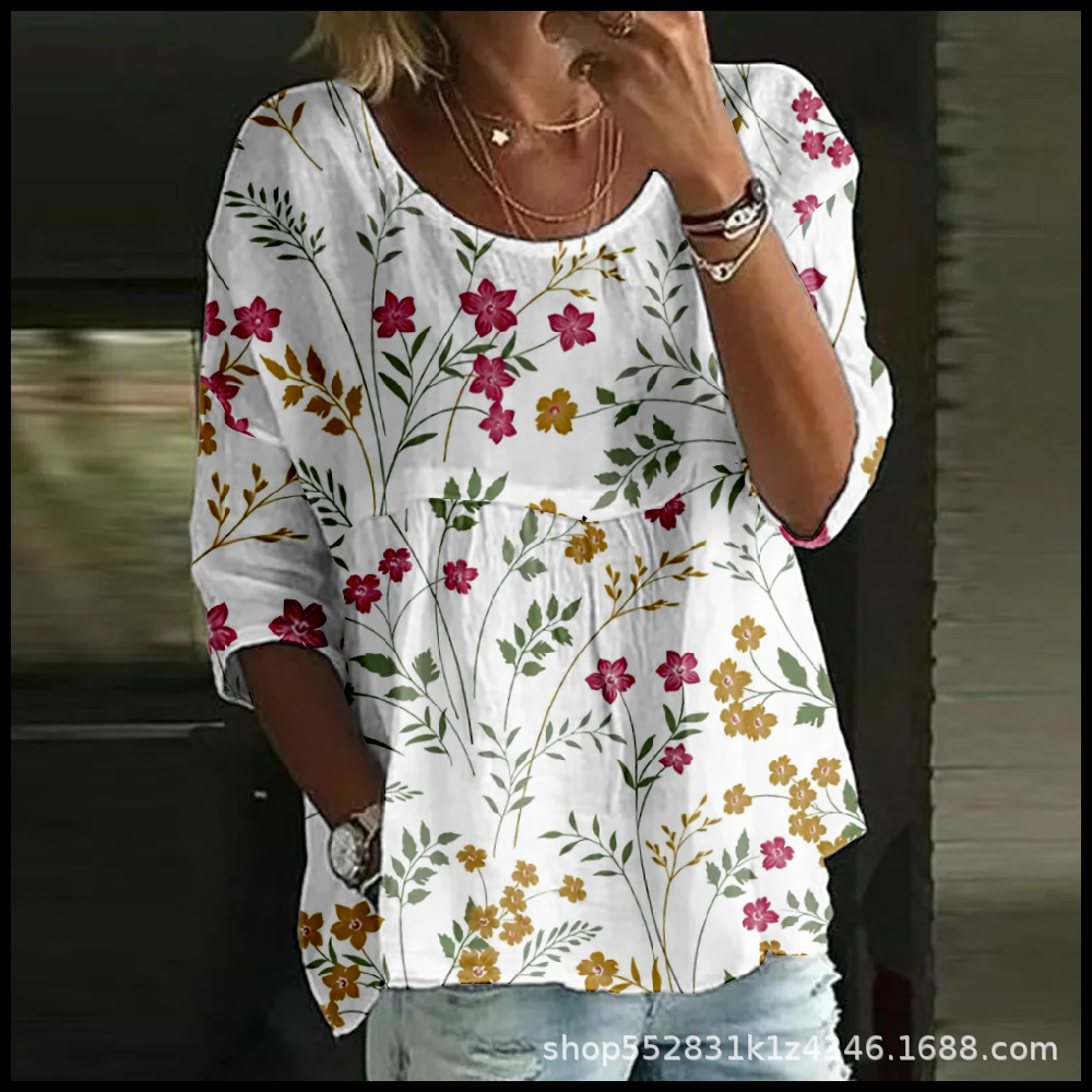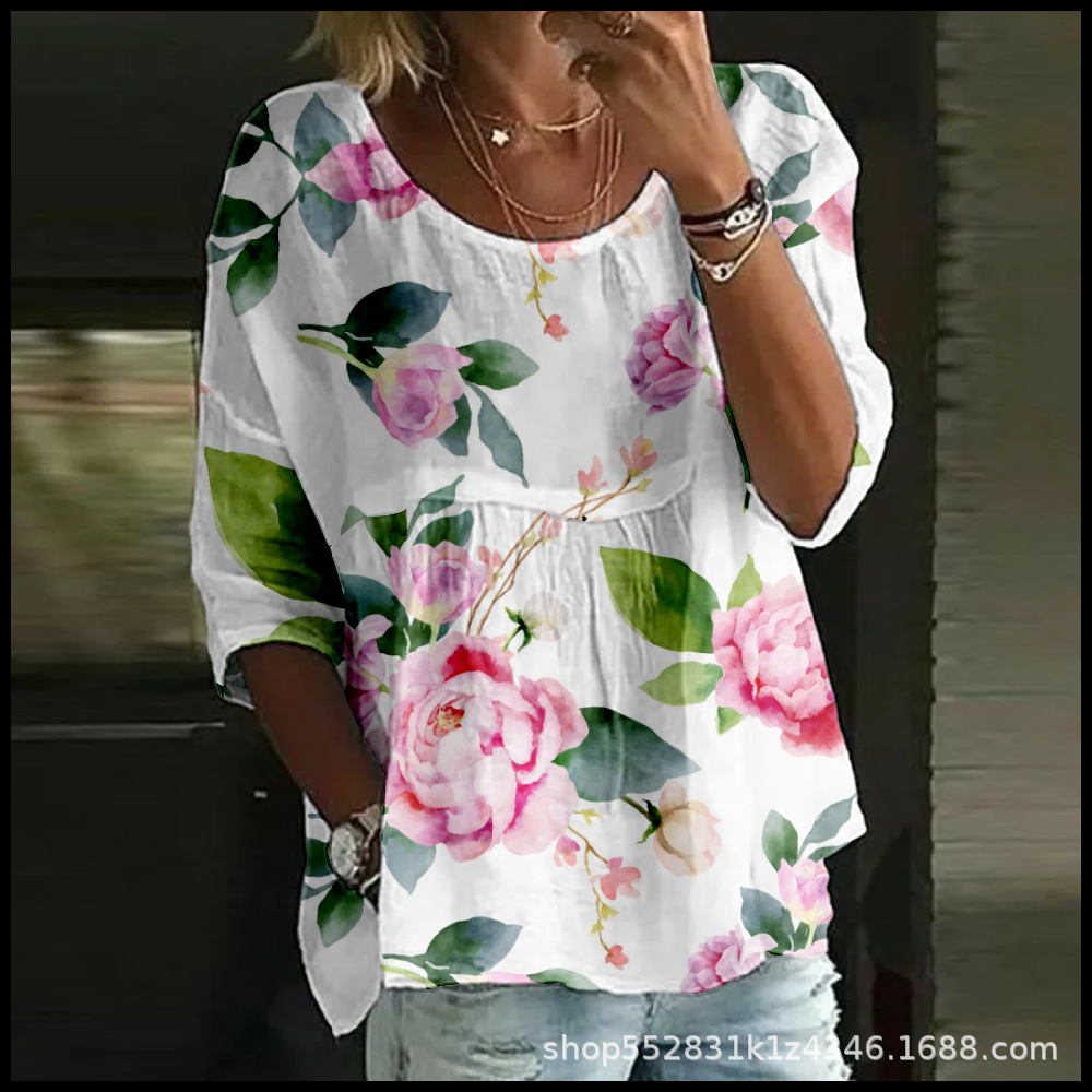 2025 크로스보더 독립 스테이션 여성 티셔츠 캐주얼 스파이더 배트 디지털 프린트 미드 슬리브 플리츠 라운드 넥 탑 2스토어 가기
