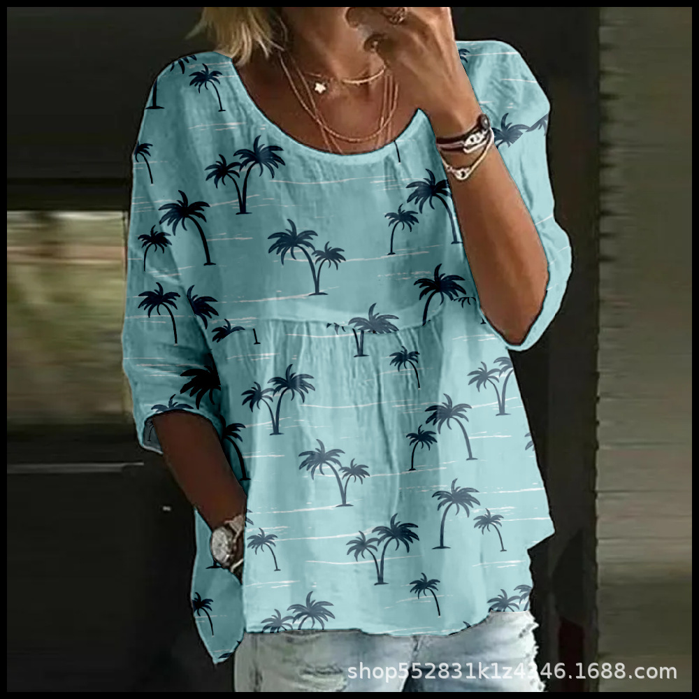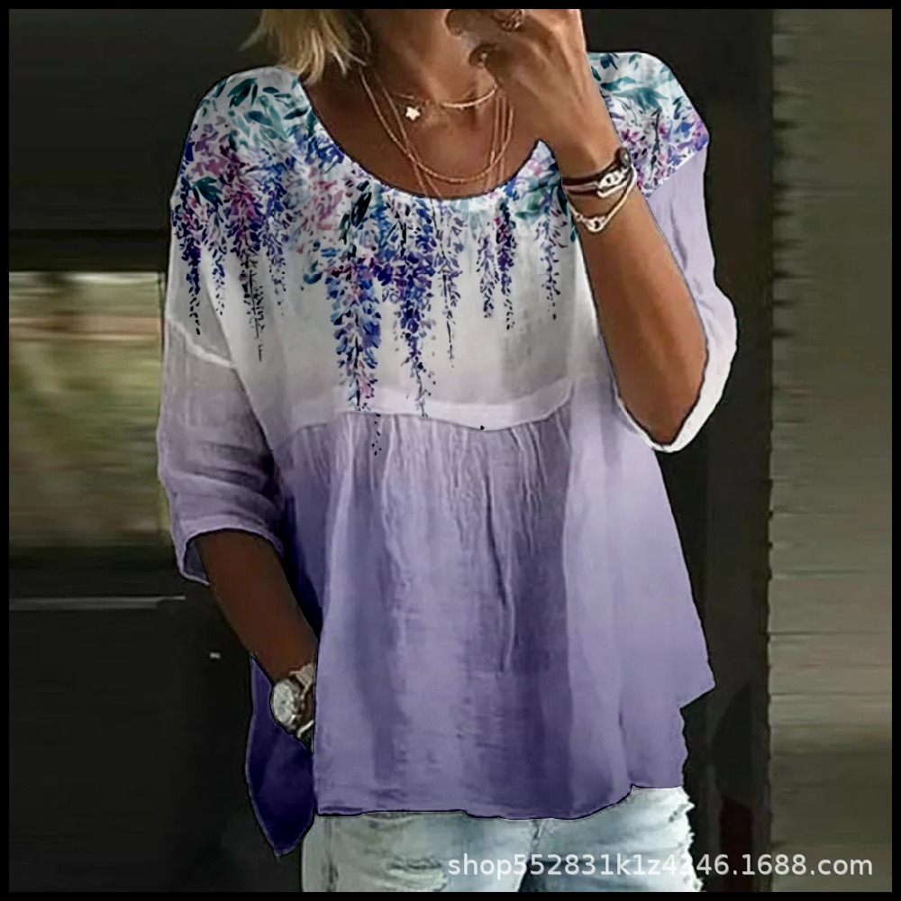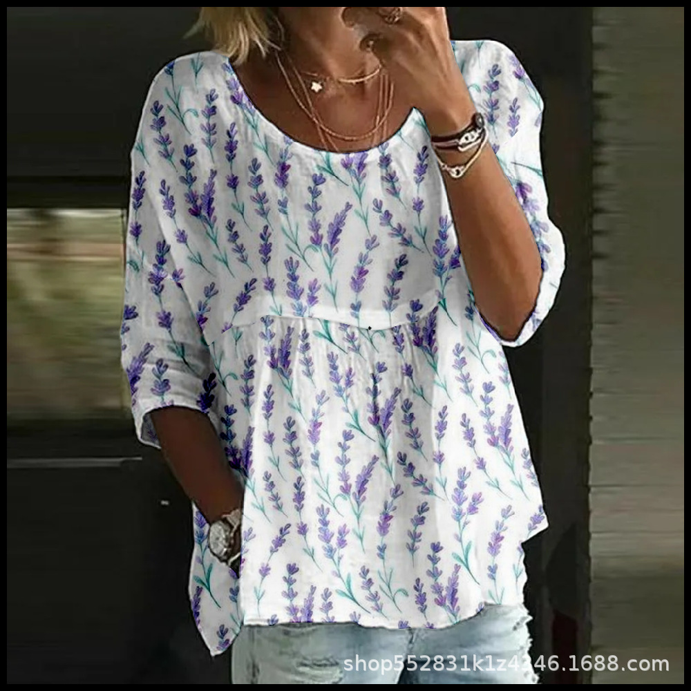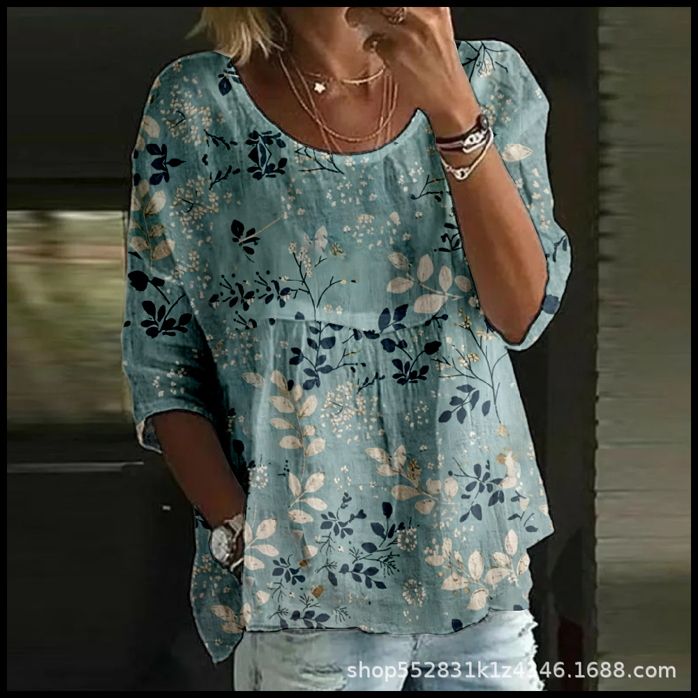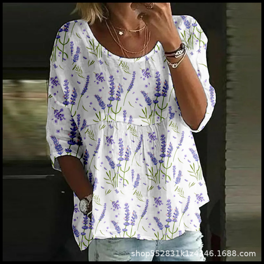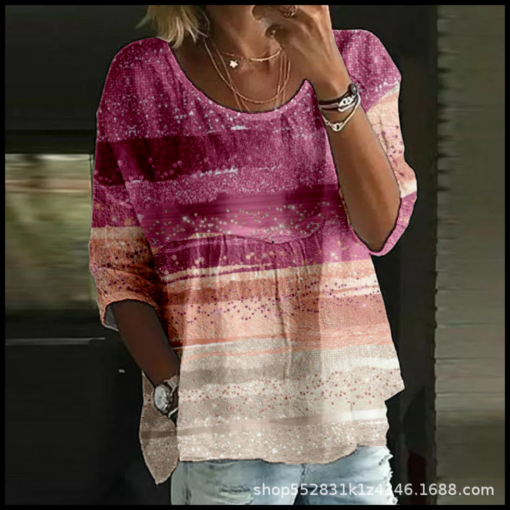 2025 크로스보더 독립 스테이션 여성 티셔츠 캐주얼 스파이더 배트 디지털 프린트 미드 슬리브 플리츠 라운드 넥 탑 2스토어 가기