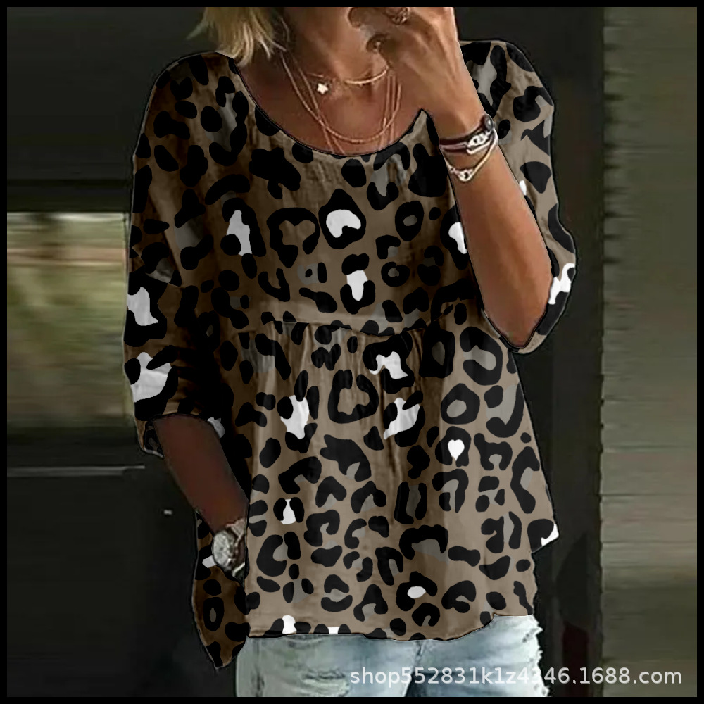 2025 크로스보더 독립 스테이션 여성 티셔츠 캐주얼 스파이더 배트 디지털 프린트 미드 슬리브 플리츠 라운드 넥 탑 2