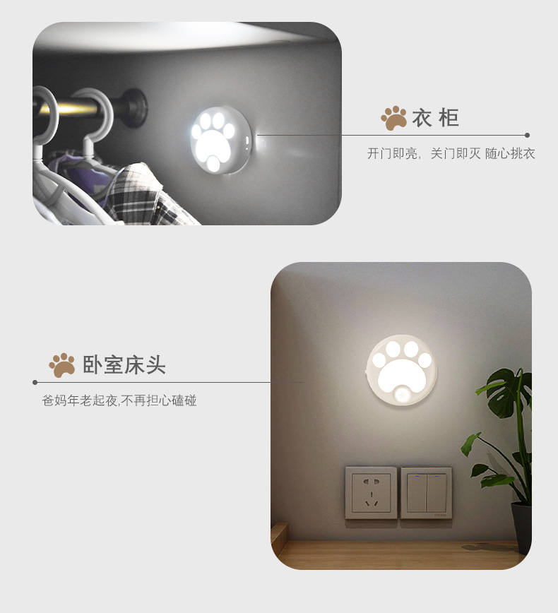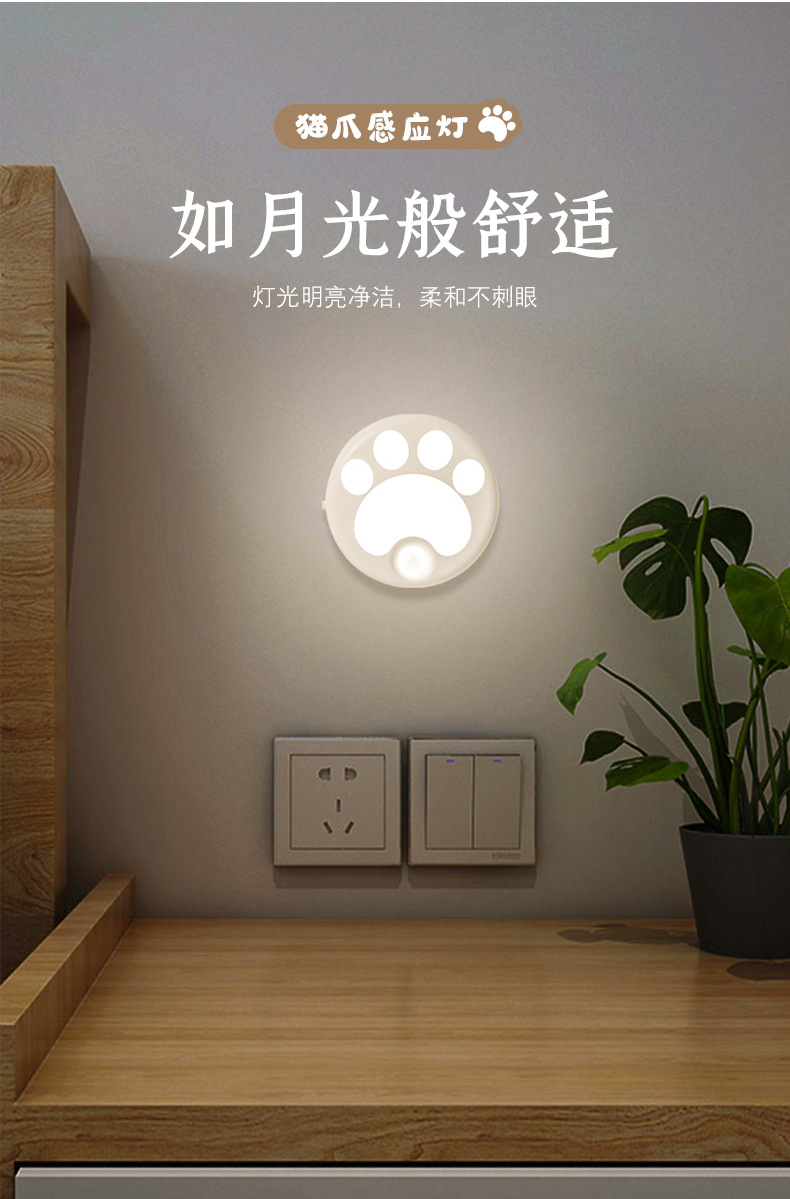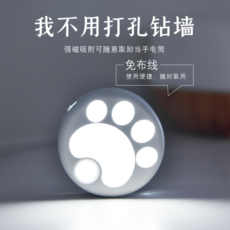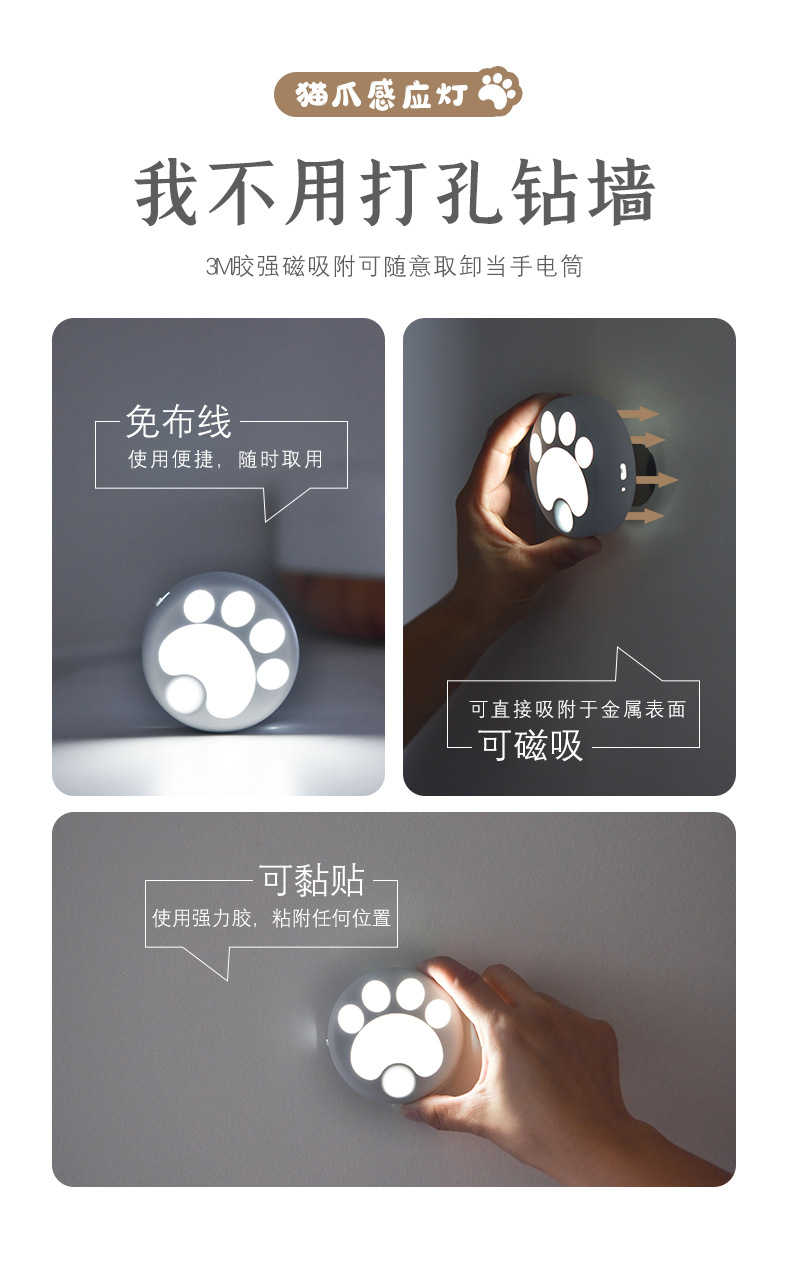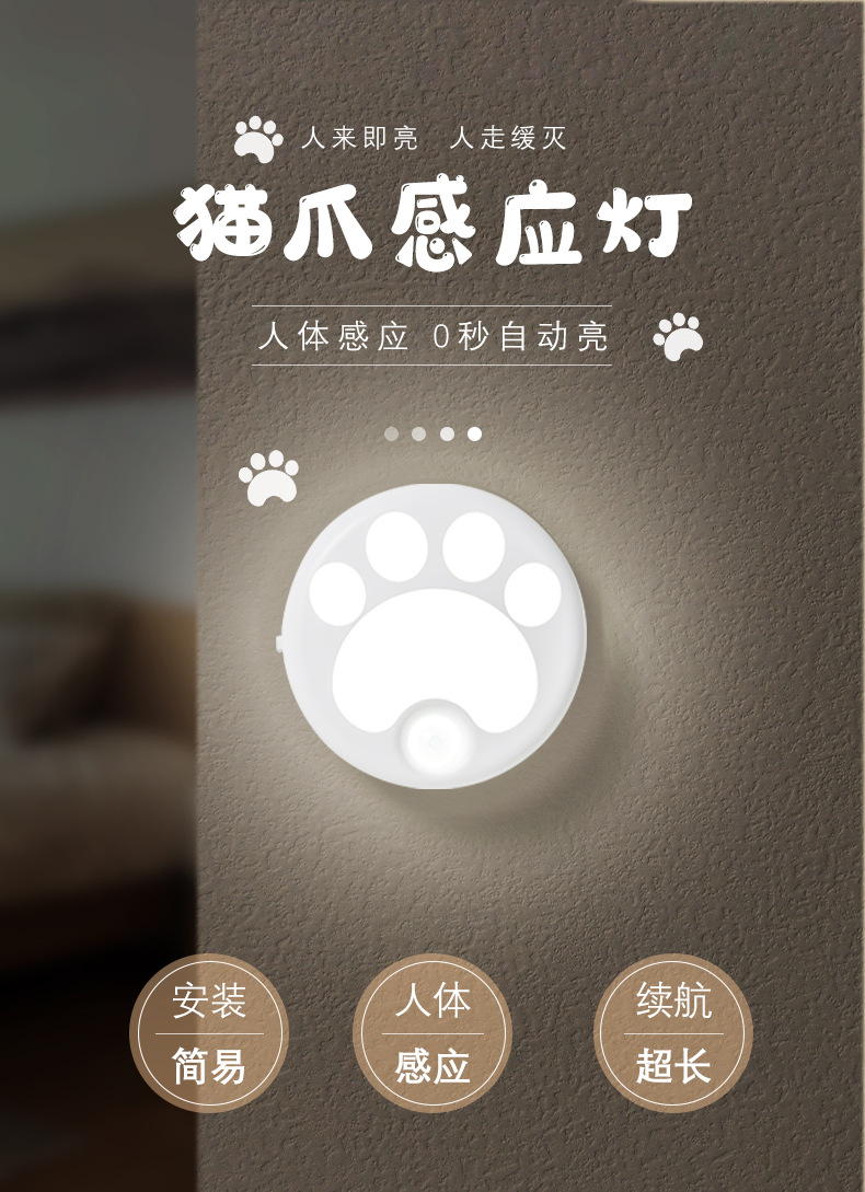 인체 감지 야간등 스마트 LED 조명 해외 도매 주방 복도 무타공 자석 고양이 발톱등 야광