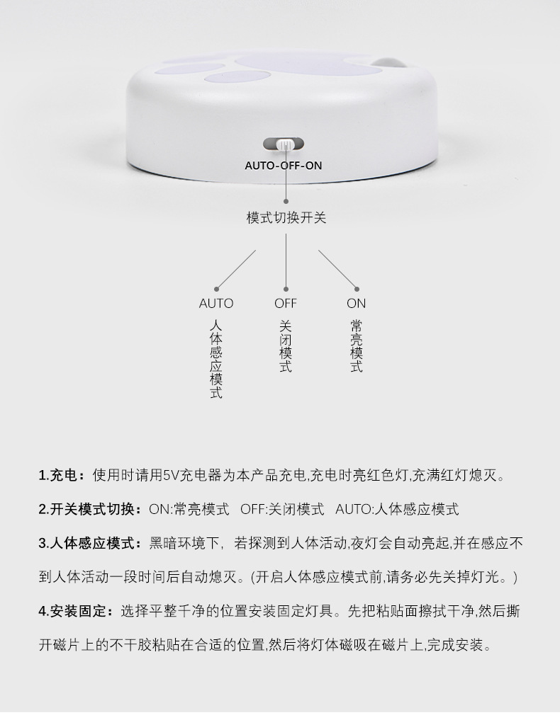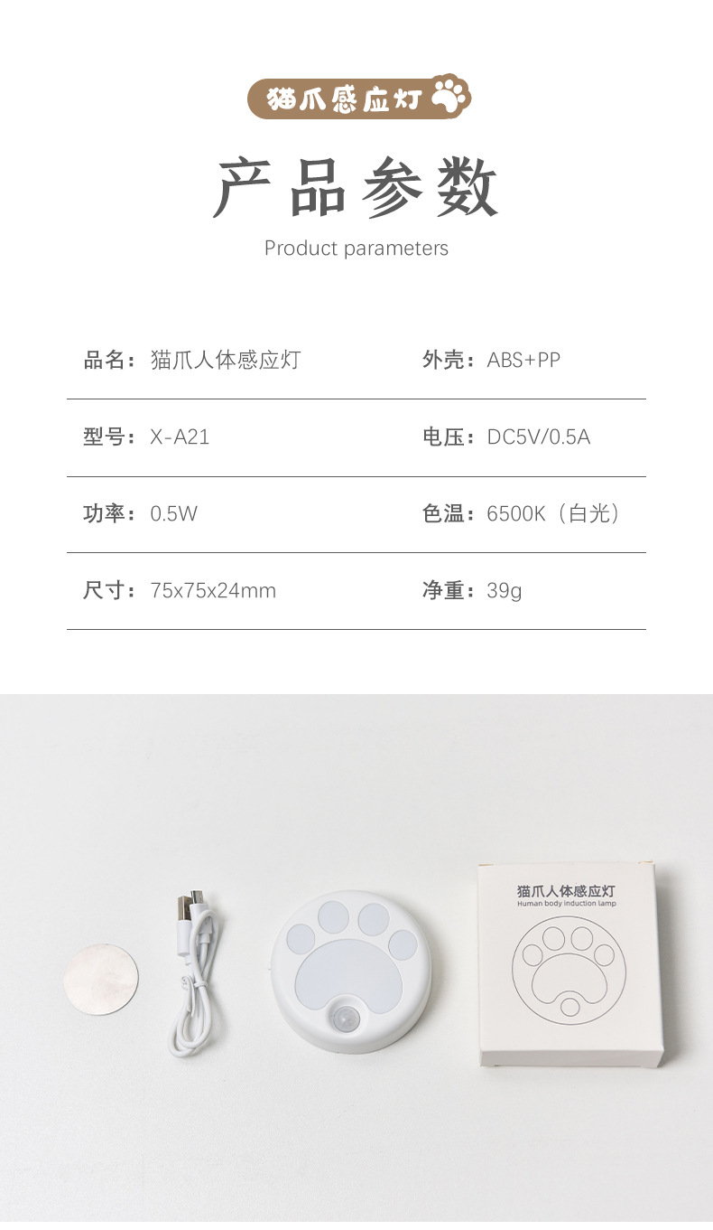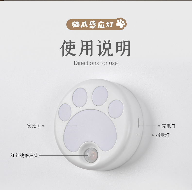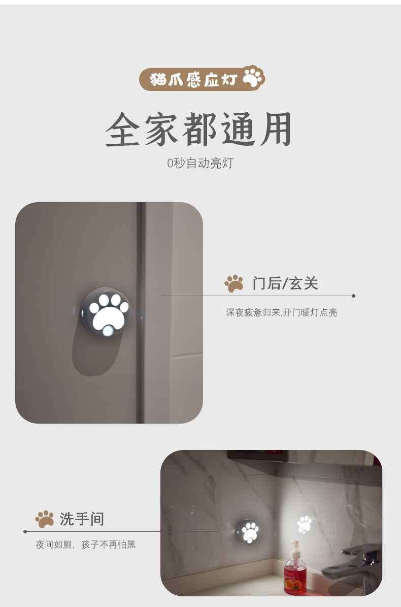 인체 감지 야간등 스마트 LED 조명 해외 도매 주방 복도 무타공 자석 고양이 발톱등 야광