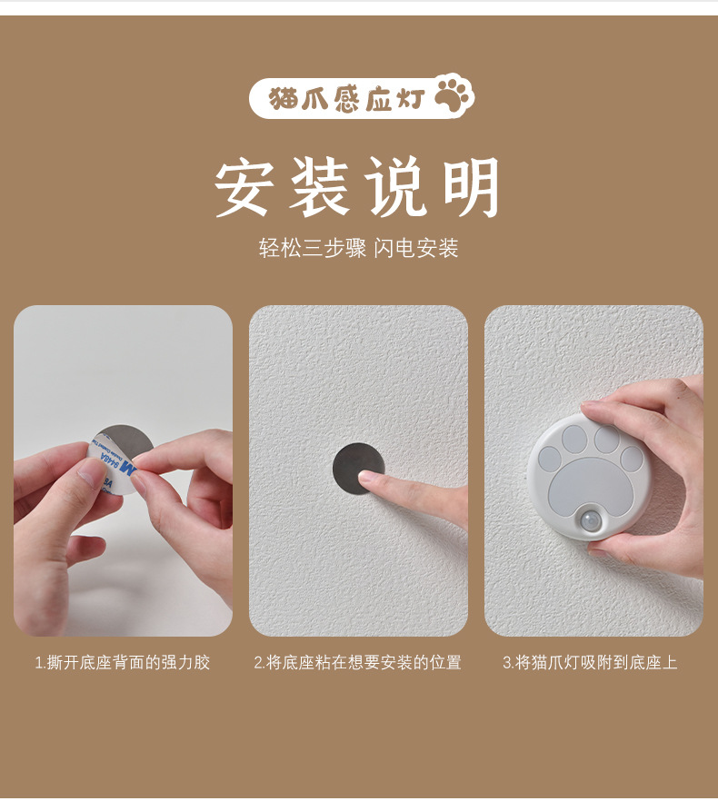 인체 감지 야간등 스마트 LED 조명 해외 도매 주방 복도 무타공 자석 고양이 발톱등 야광스토어 가기