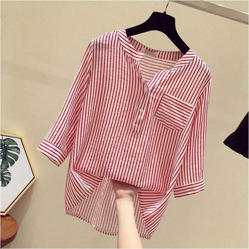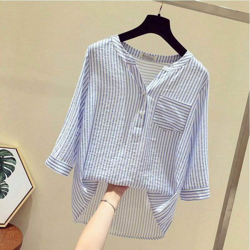 스트라이프 셔츠 여자 2025 년 여름 새 한국 스타일 루즈 칼라 탑 세븐 슬리브 스트라이프 쉬폰 셔츠 올매치스토어 가기