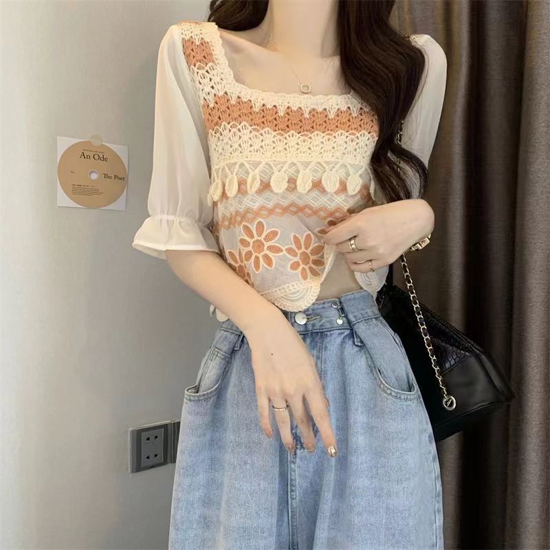 2025 크로 셰 뜨개질 중공 새로운 슬림 반팔 쉬폰 셔츠 여름 스퀘어 넥 짧은 퍼프 슬리브 스플 라이스 디자인 탑스토어 가기