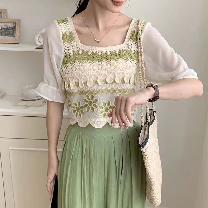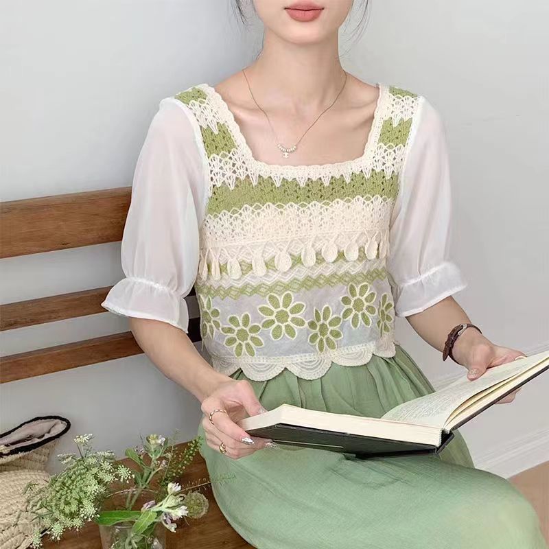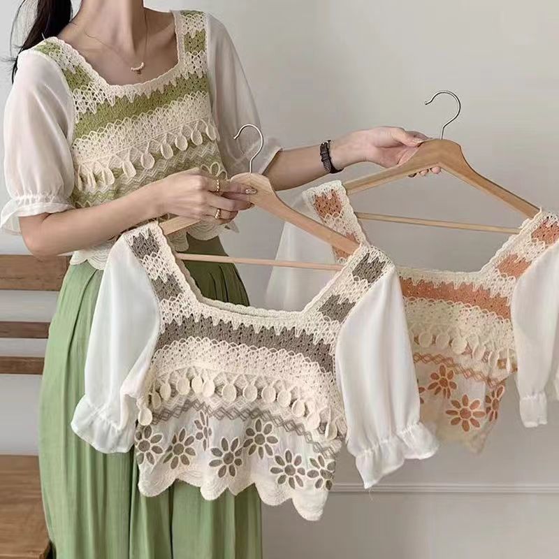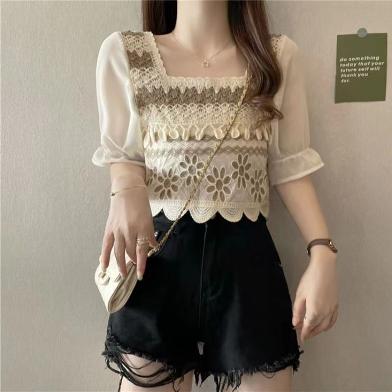 2025 크로 셰 뜨개질 중공 새로운 슬림 반팔 쉬폰 셔츠 여름 스퀘어 넥 짧은 퍼프 슬리브 스플 라이스 디자인 탑