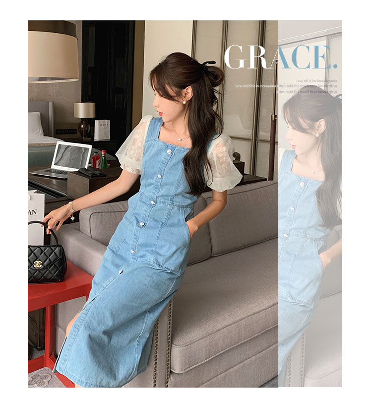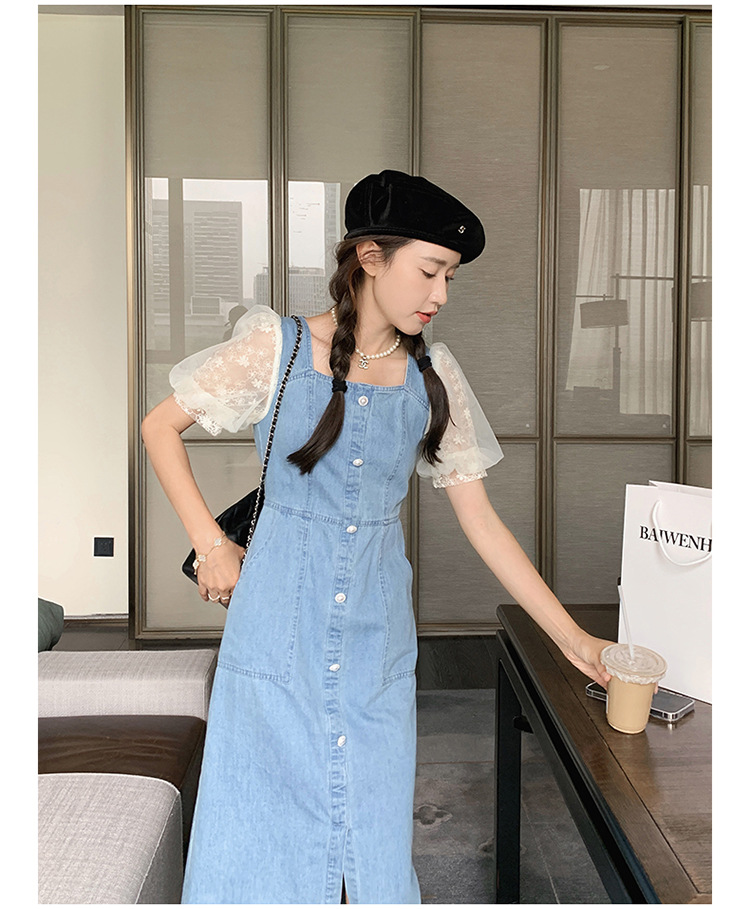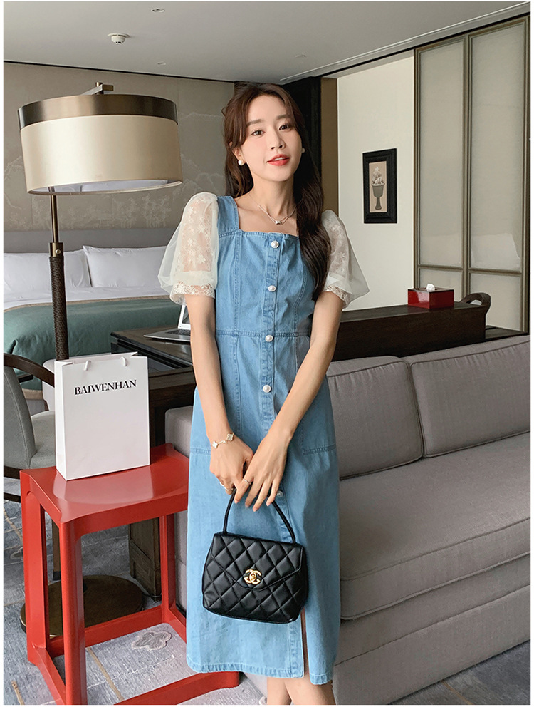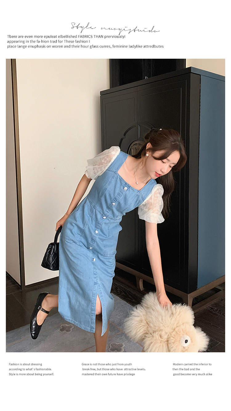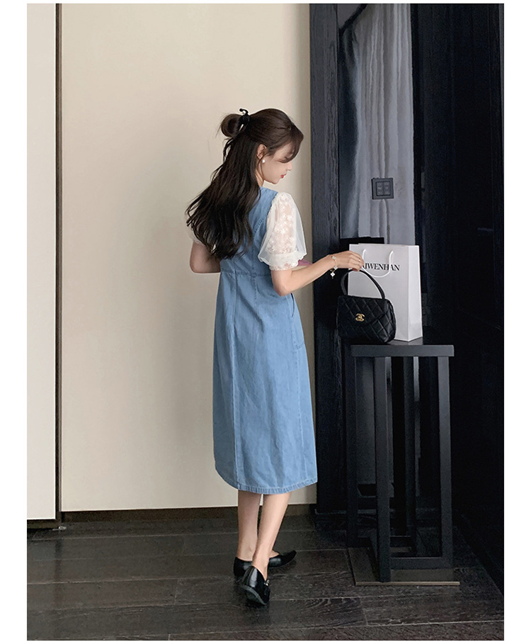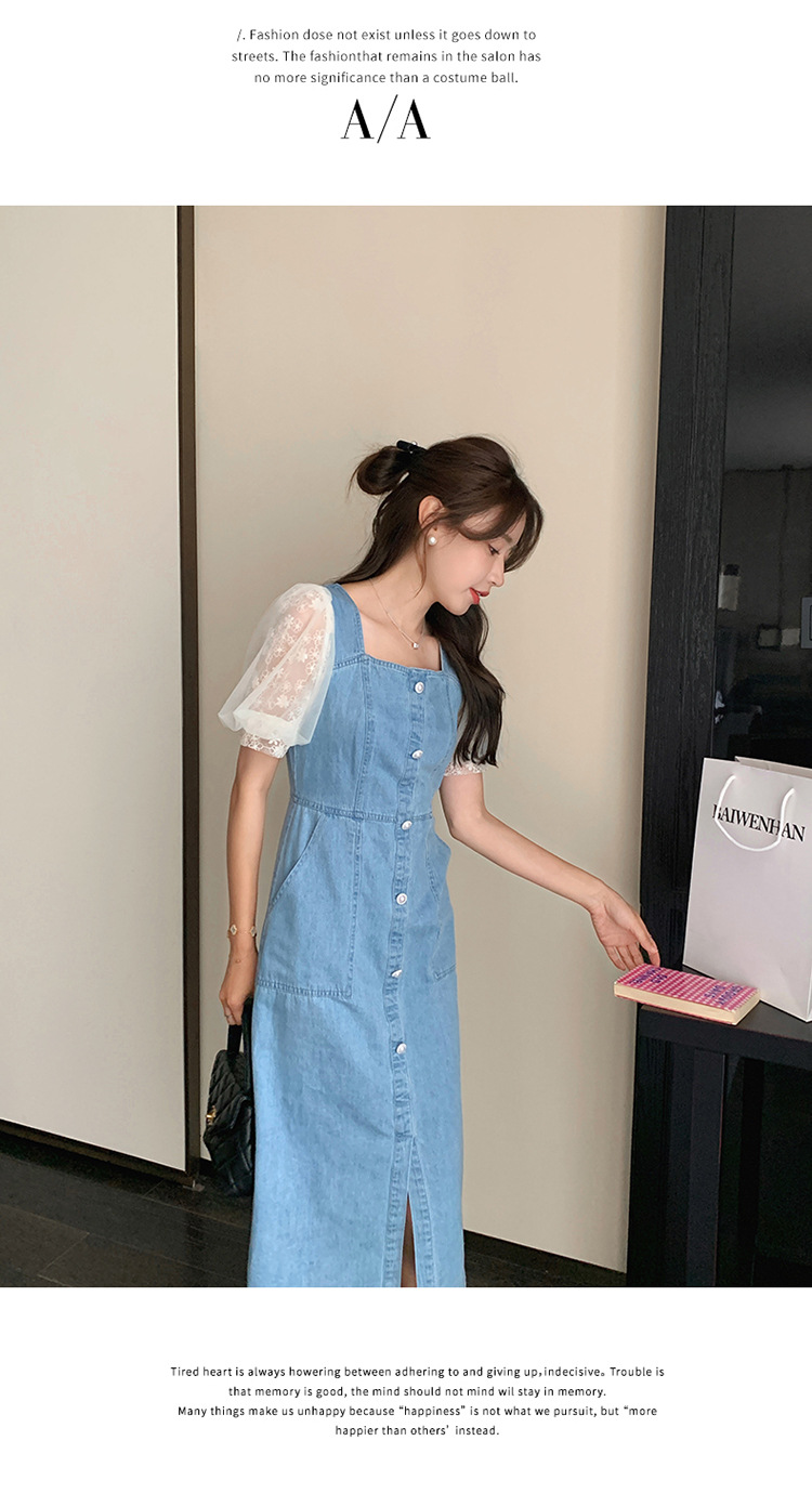 레이스 스티칭 데님 원피스 여자 여름 2025 새로운 타이트 허리 슬리밍 우아한 퍼프 슬리브 스퀘어 칼라 프렌치 롱 원피스스토어 가기